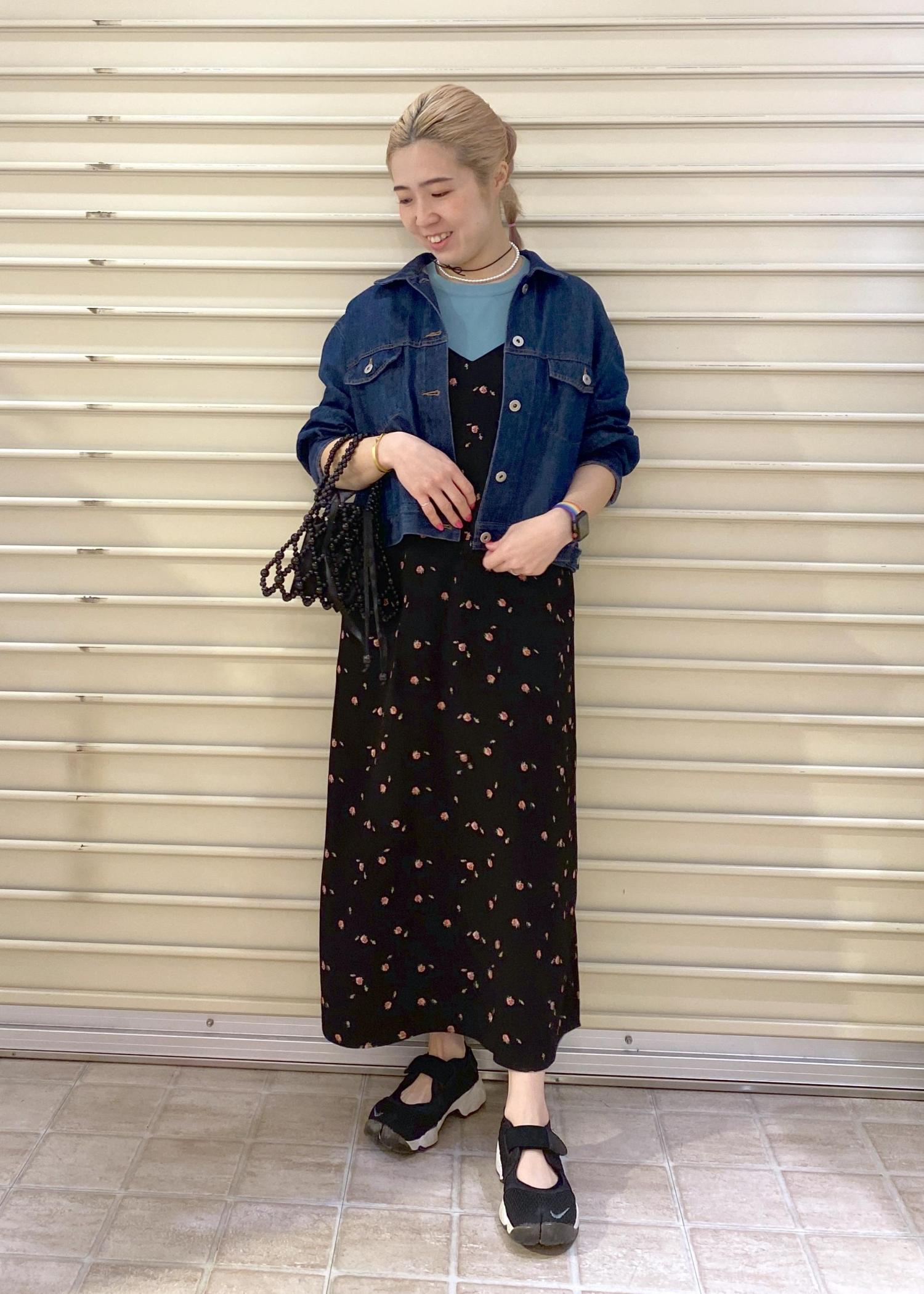 小さなバラがプリントされたキャミワンピで春コーデを組みました!ワンピースがブラックなのでトップスに色物を使い、暗くなりすぎないようにしました。