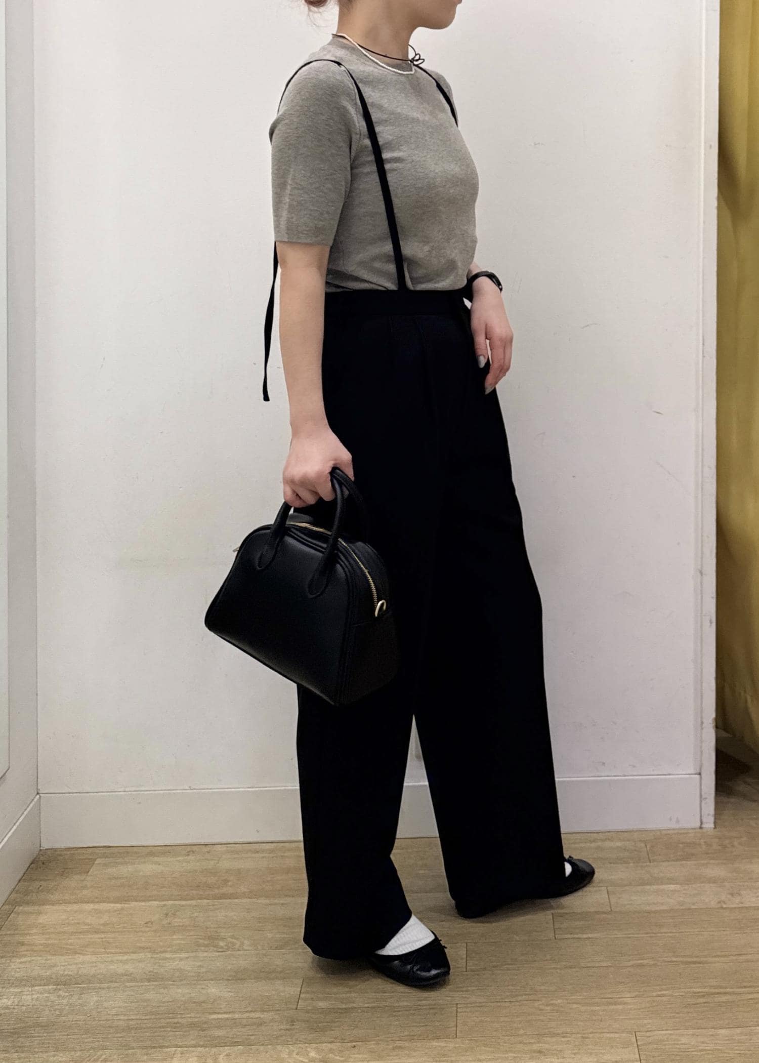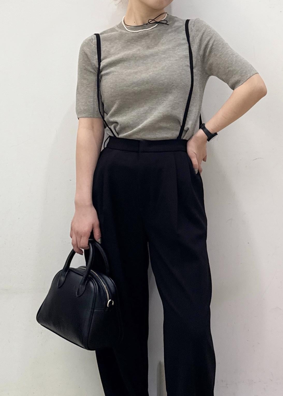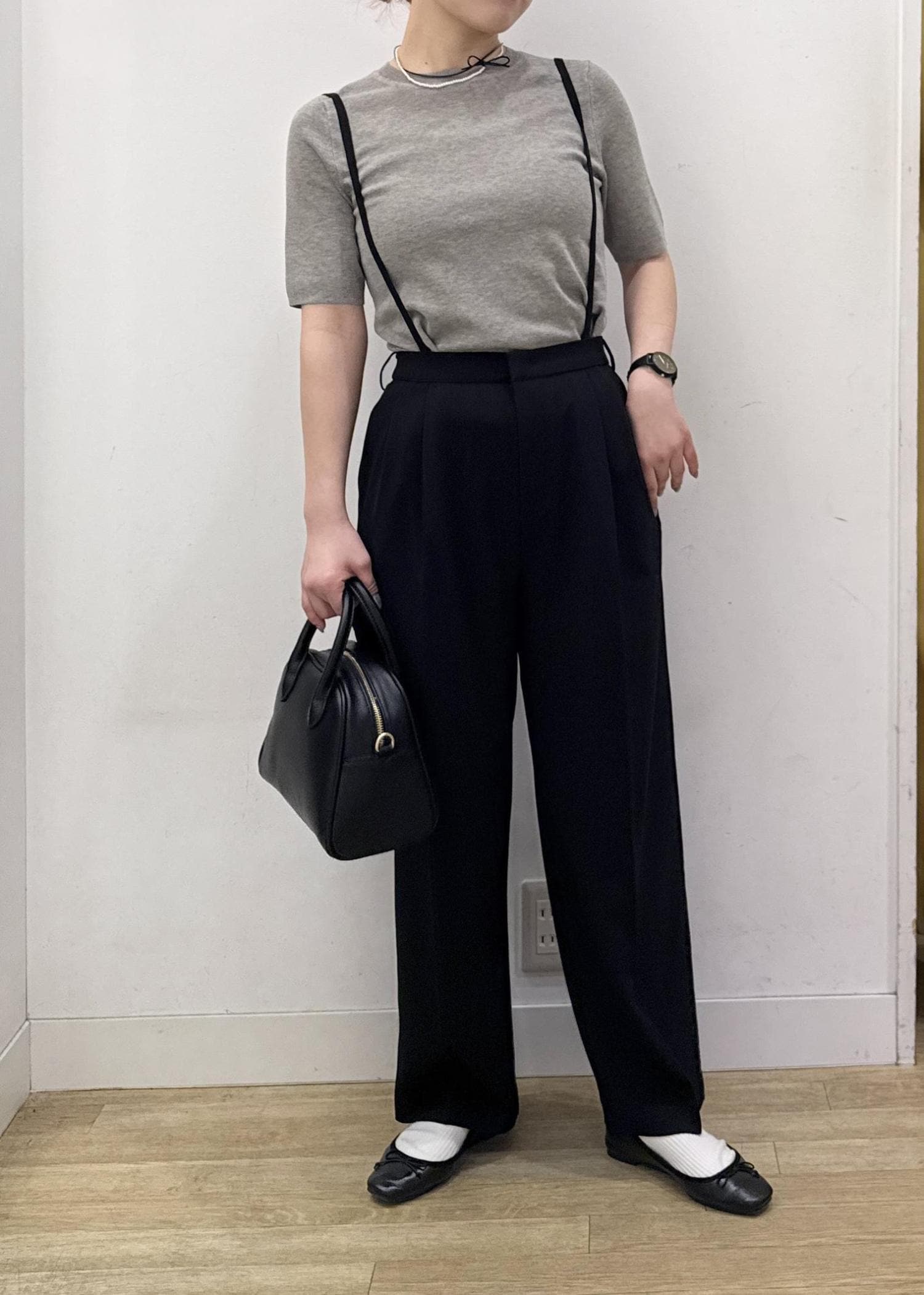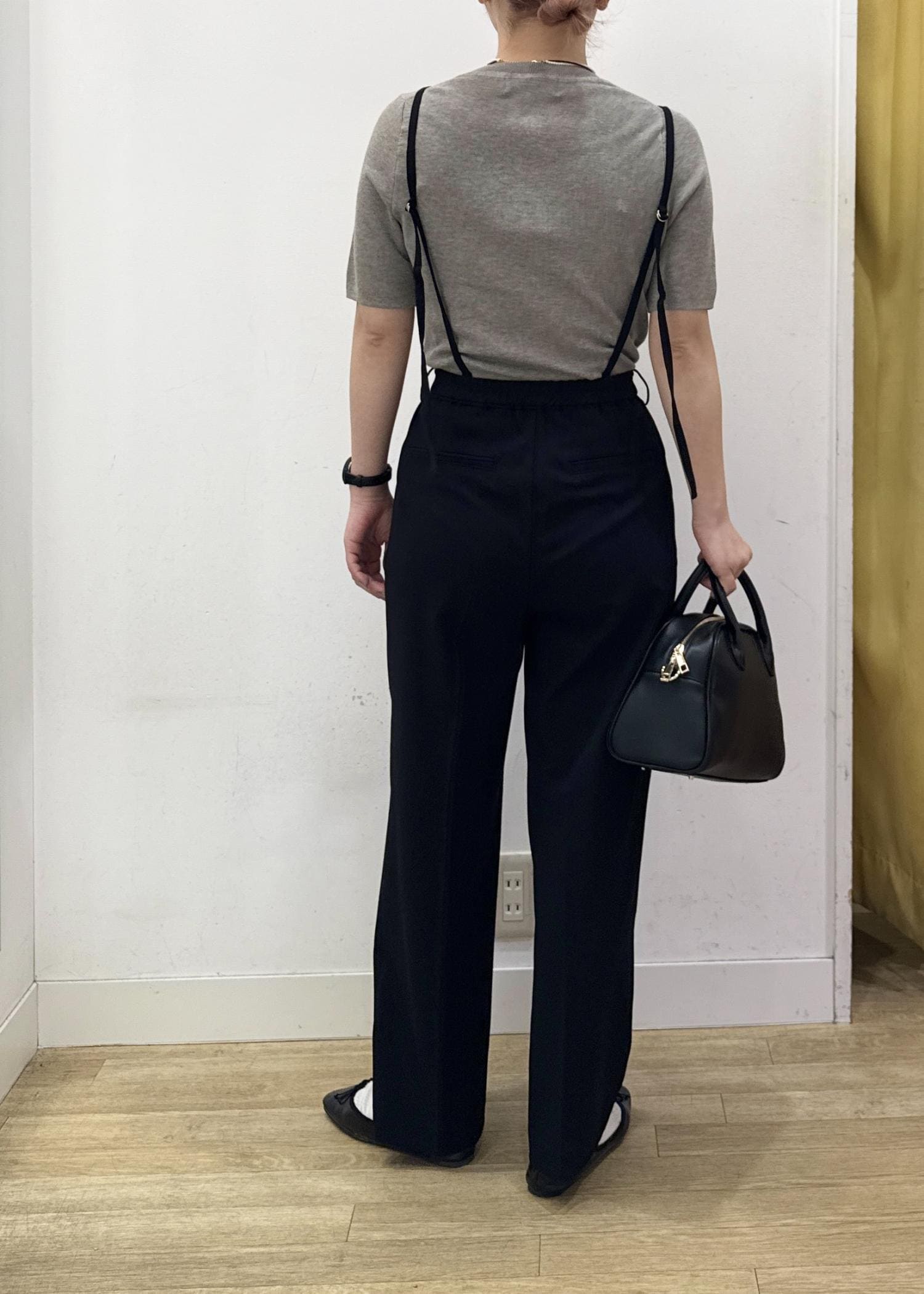 サスペンダー付きのワイドパンツに、コンパクトなニットトップスを合わせたベーシックコーディネート!