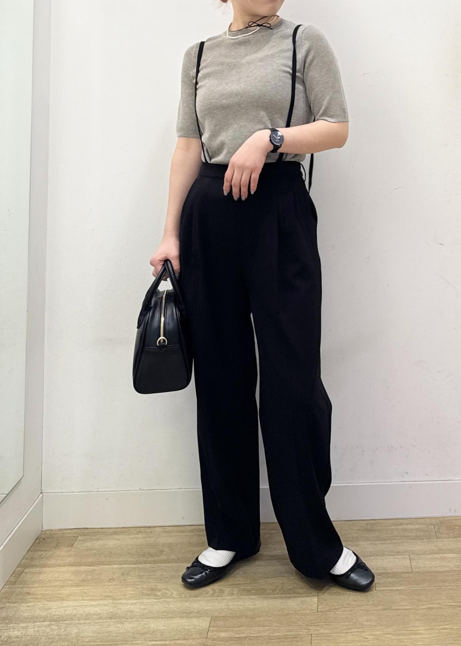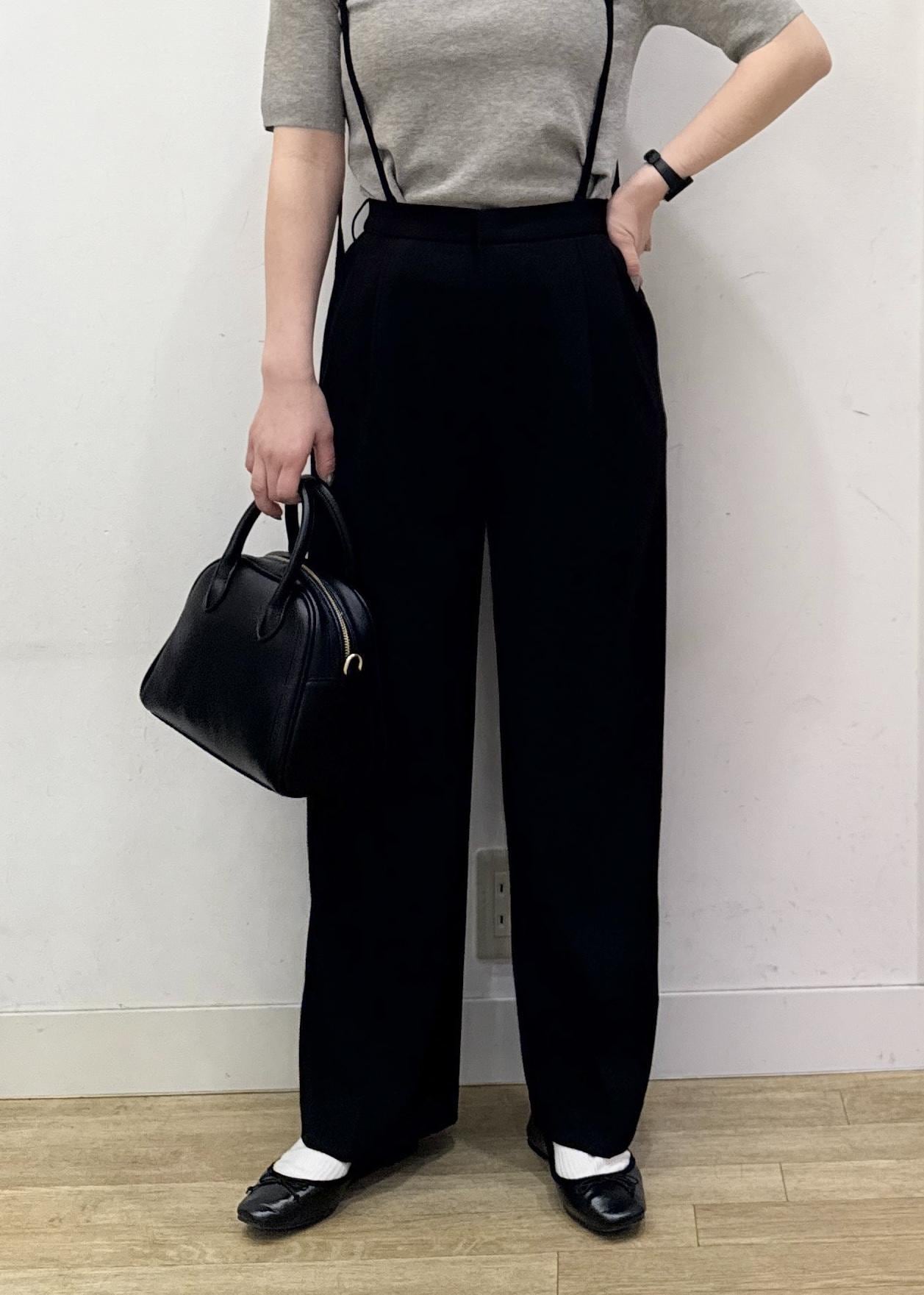 キレイ見えもするセンタープレス入りのワイドパンツは、サスペンダーが外せるのでオンオフ兼用できる万能アイテムです☺︎