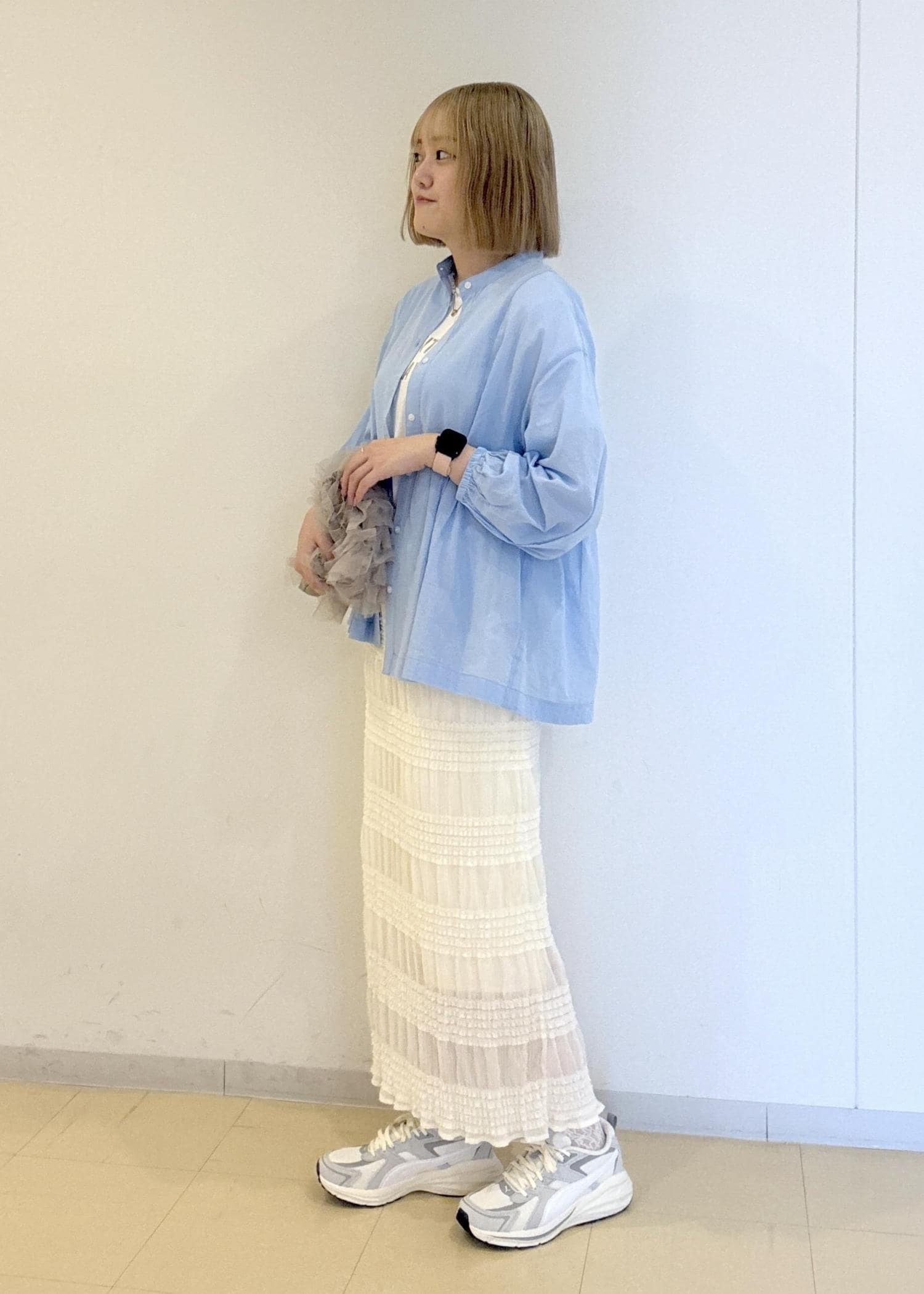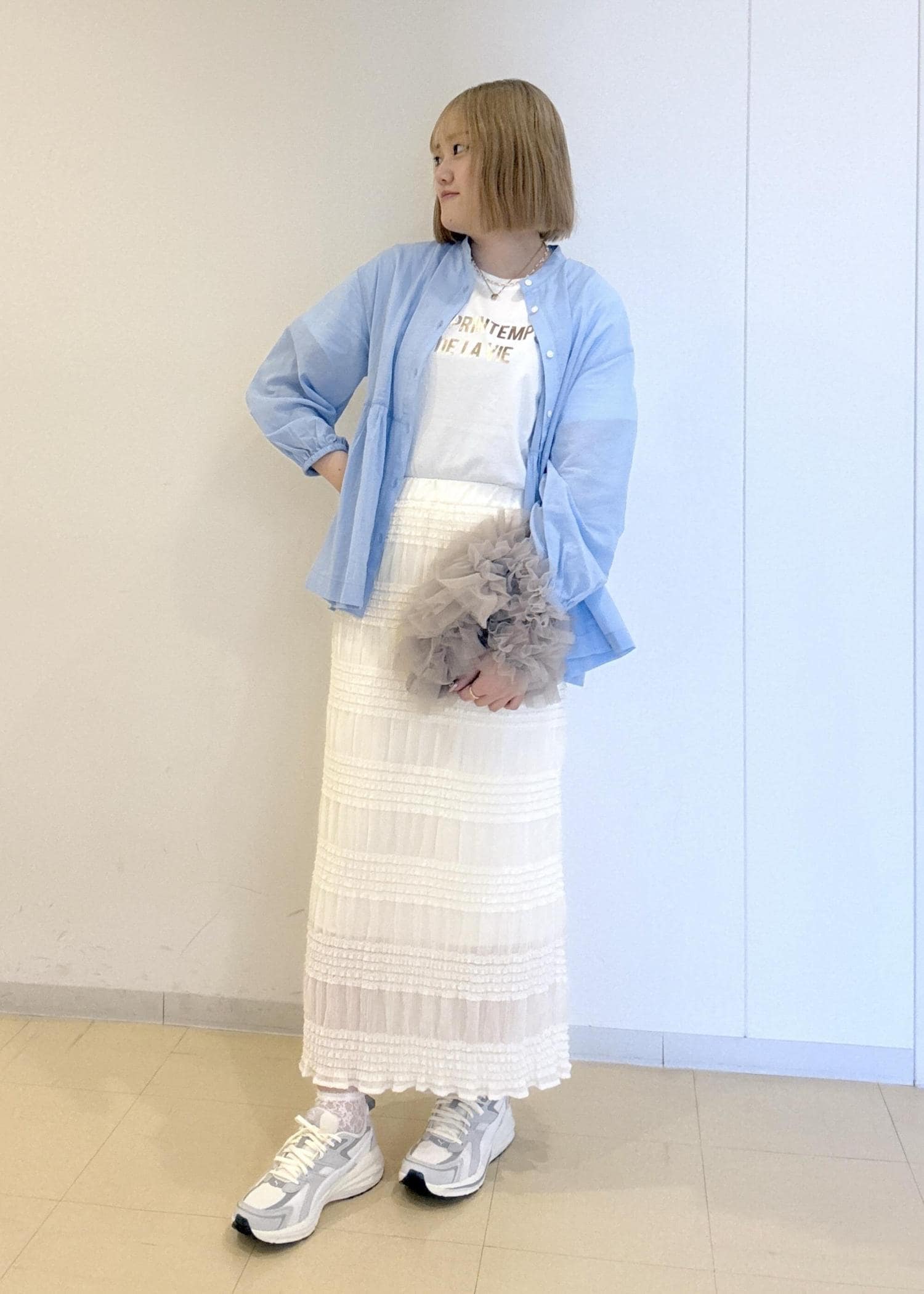 シャツやアイラインスカートといったきれいめアイテムを使ったコーディネートに、スニーカーやTシャツを合わせることでカジュアルな印象をプラスしました!