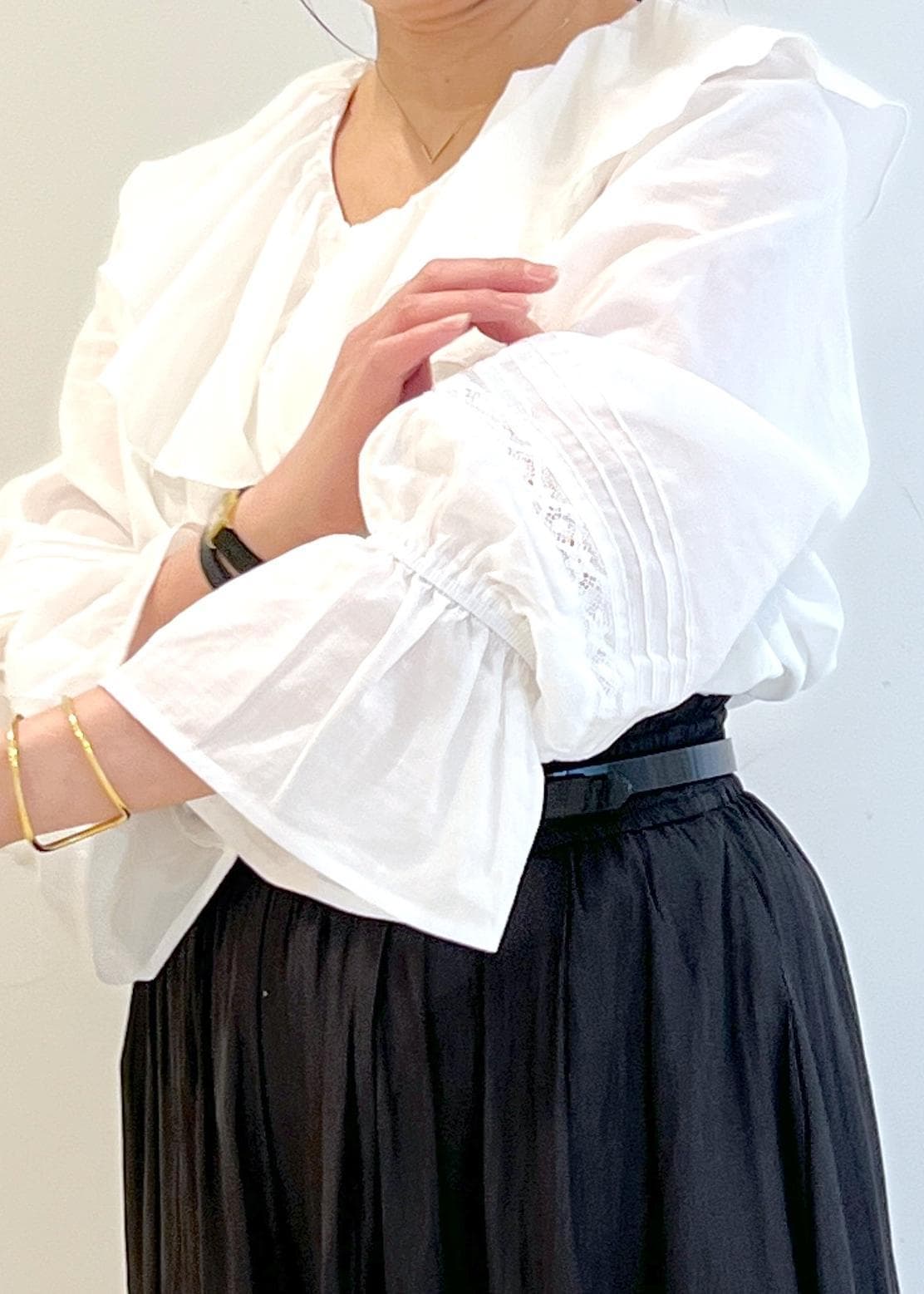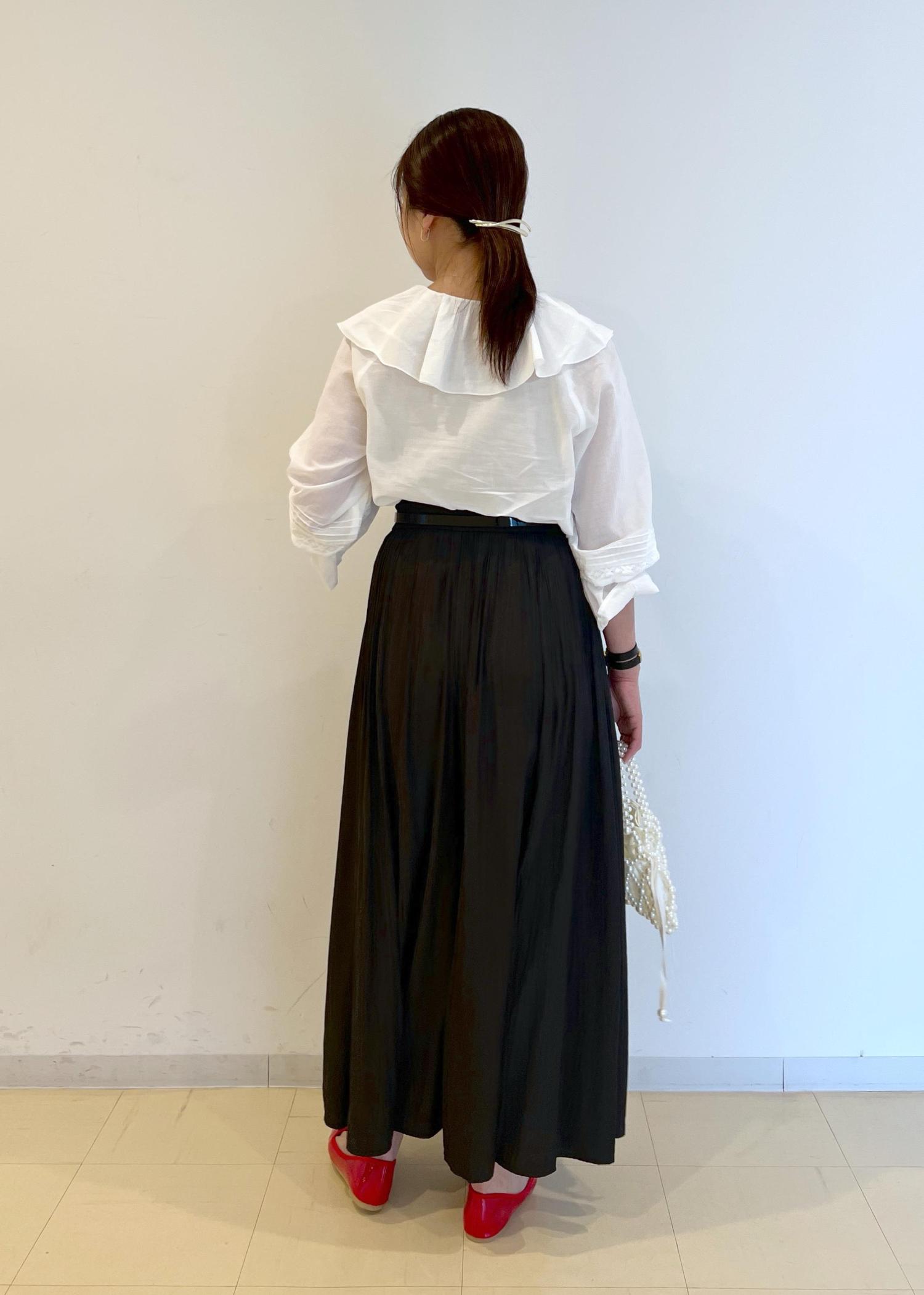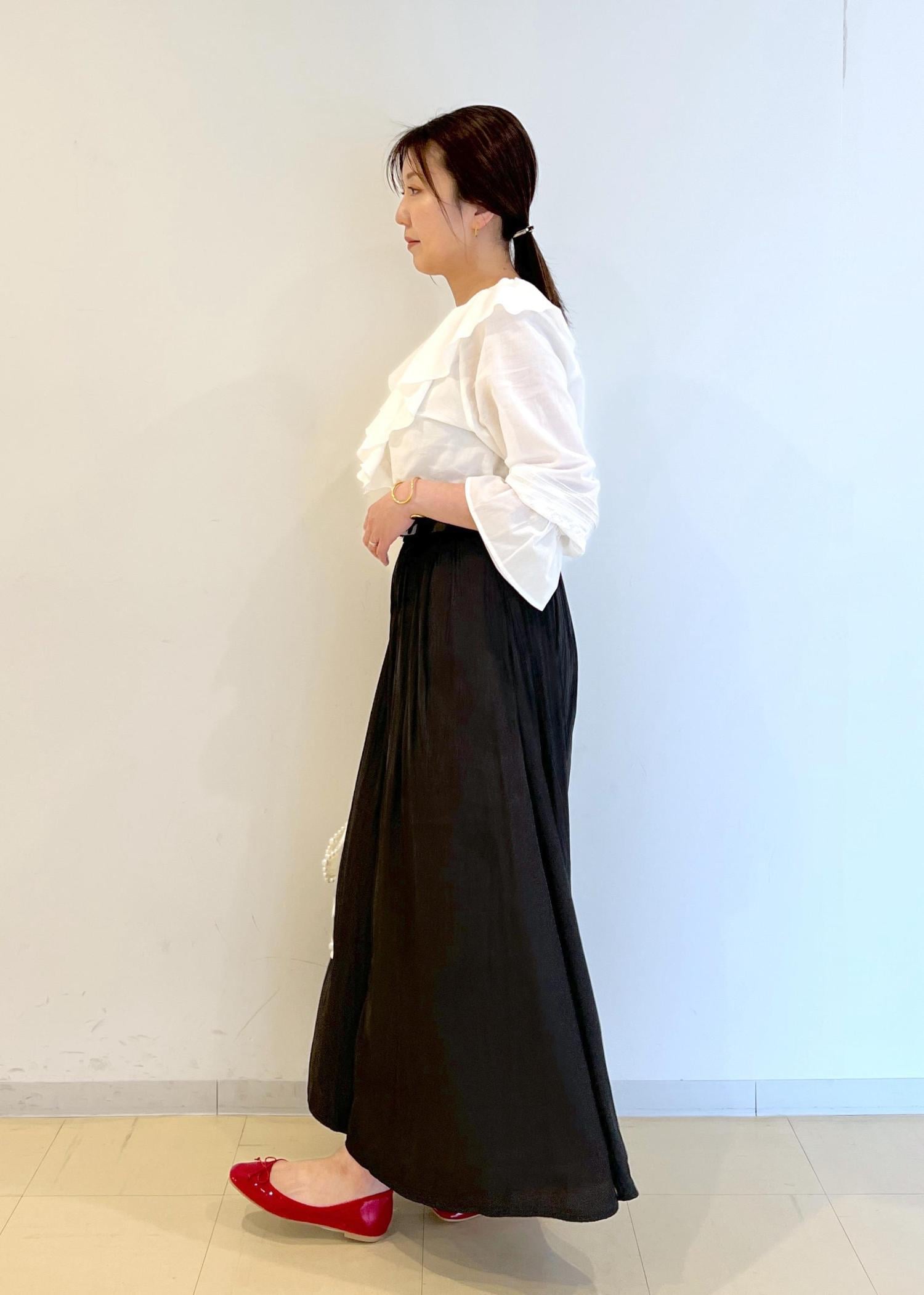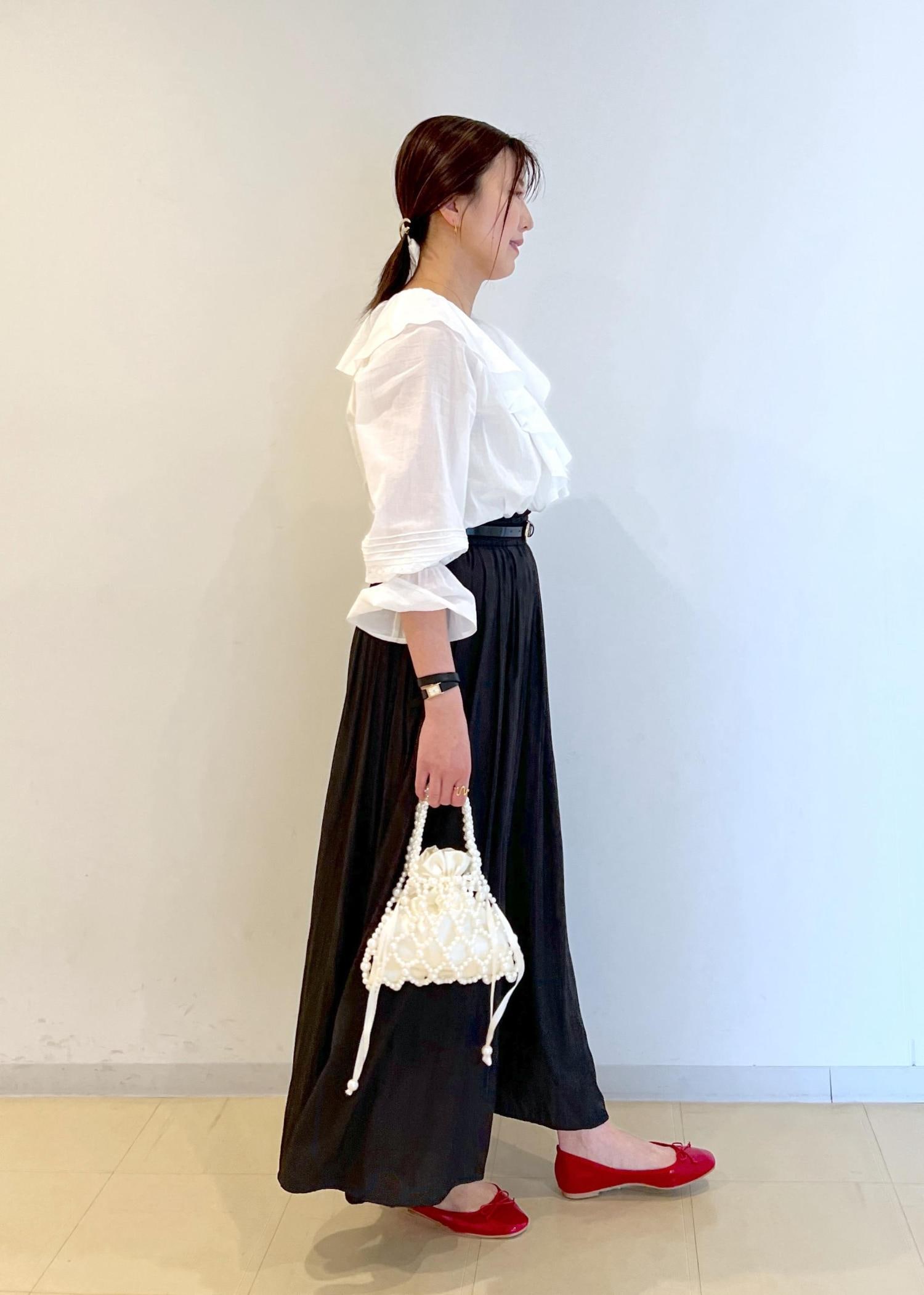 大人でも使えるフリルブラウススタイリングです。甘すぎないモノトーンでまとめました。体型カバーもできるスカーチョは楽チンなのでオススメです。