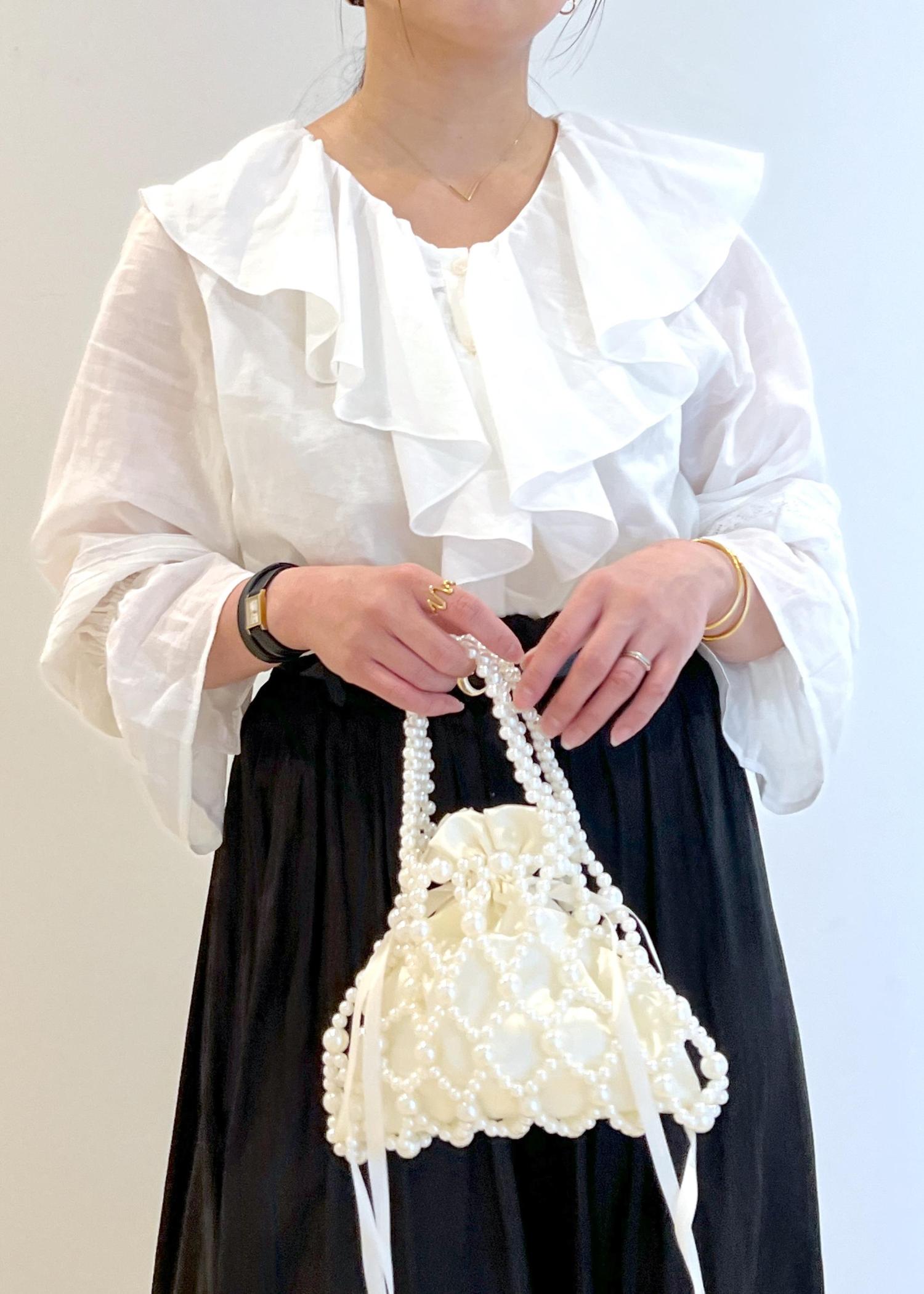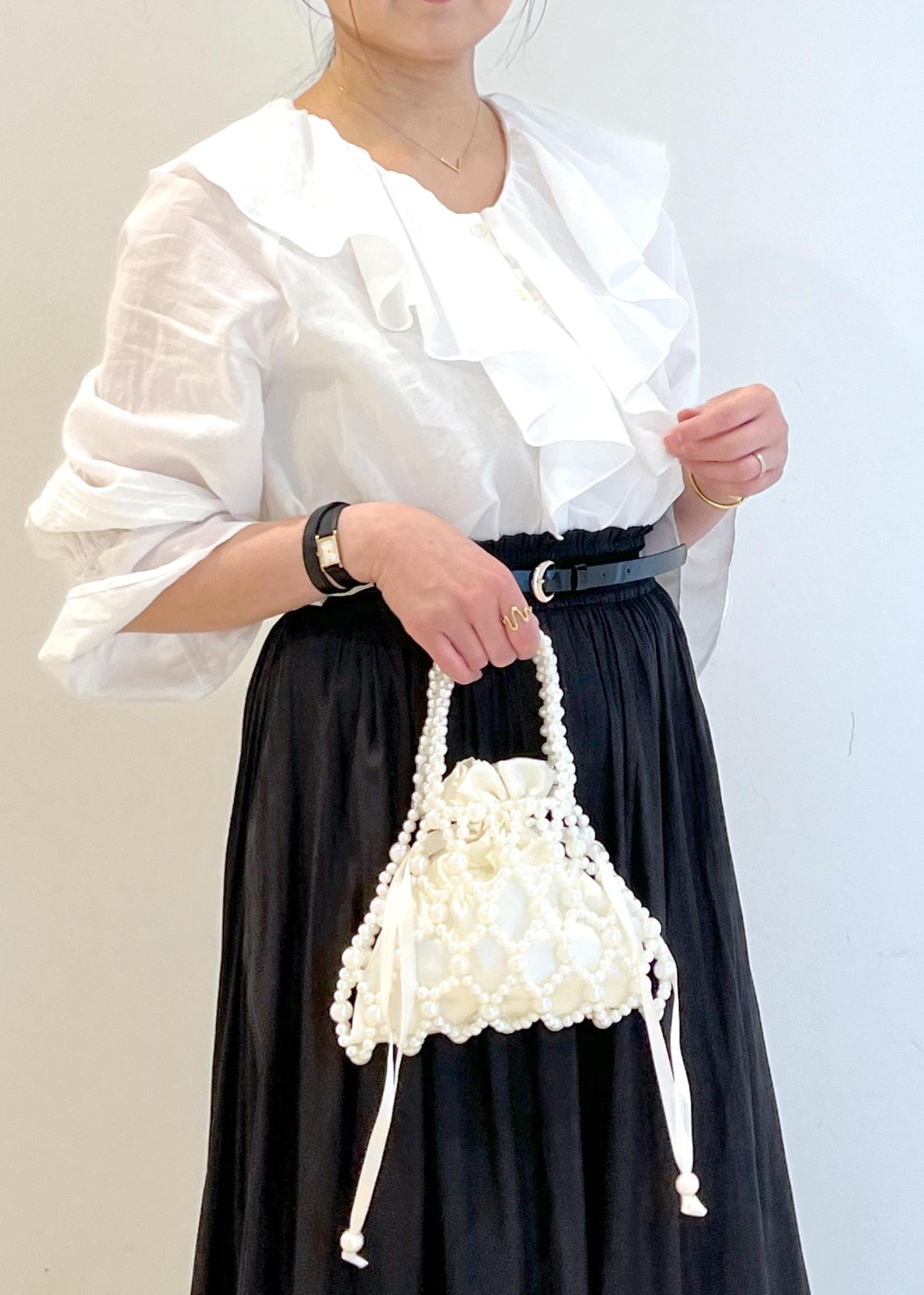 スタイリングのアクセントになるパールバッグです。巾着には、携帯・ミニウォレット・カギ程度が入るミニバッグです。