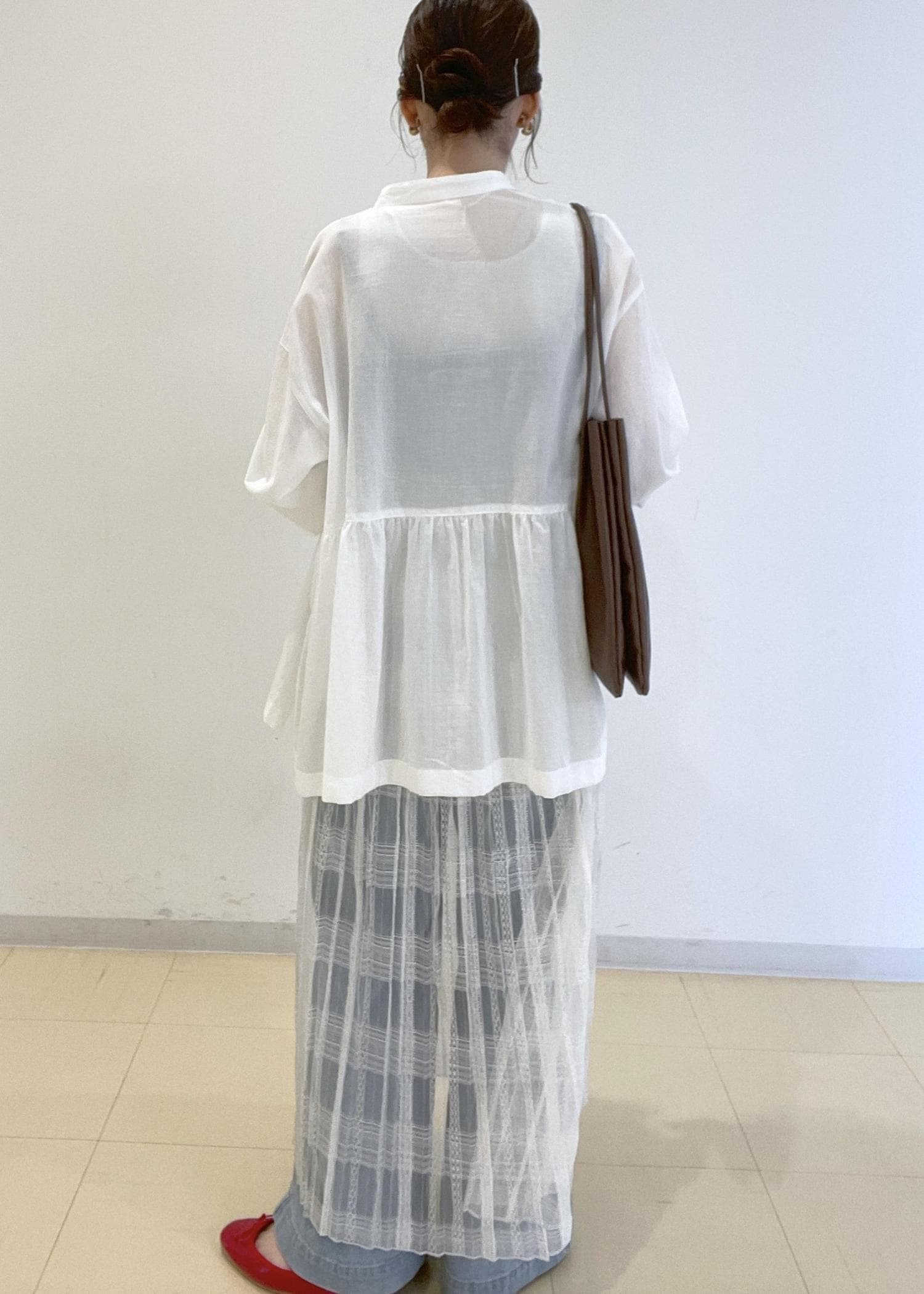 綿100%のさらっと軽い素材感です。身幅はゆったりめで、身体のラインをひろわないシルエットです。着丈はペプラムの切り替えがあり、ヒップにかかるくらいの長さなので、腰回りもふわっとカバーできる丈感でした!