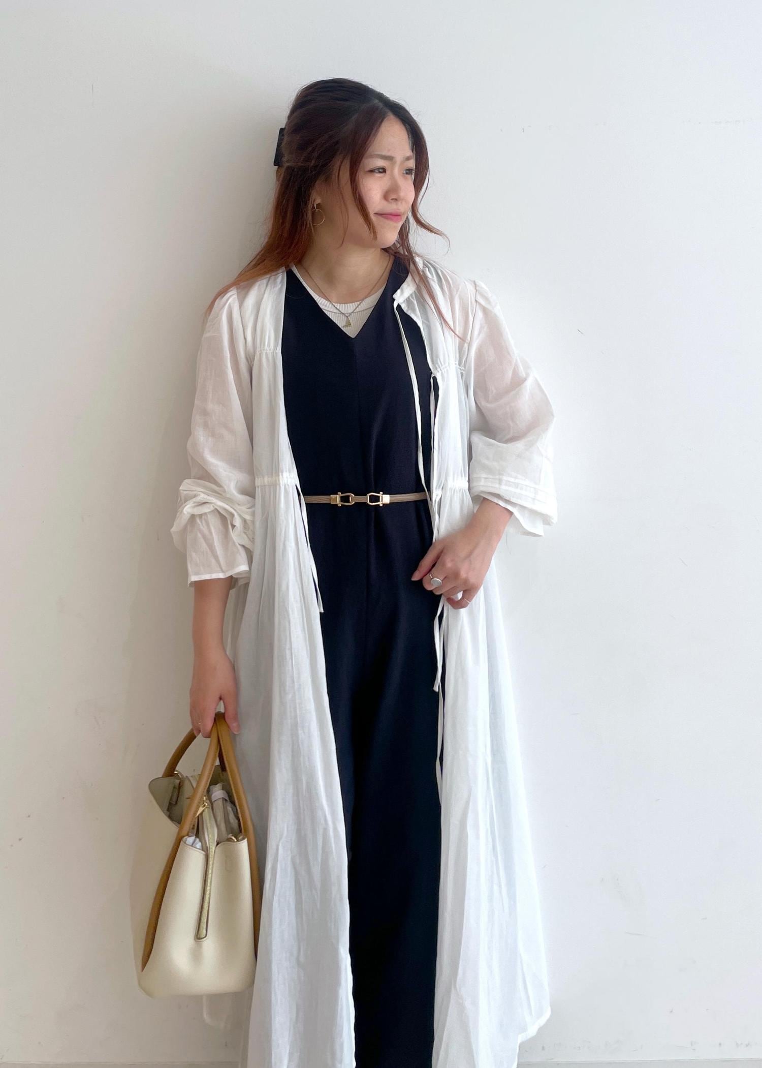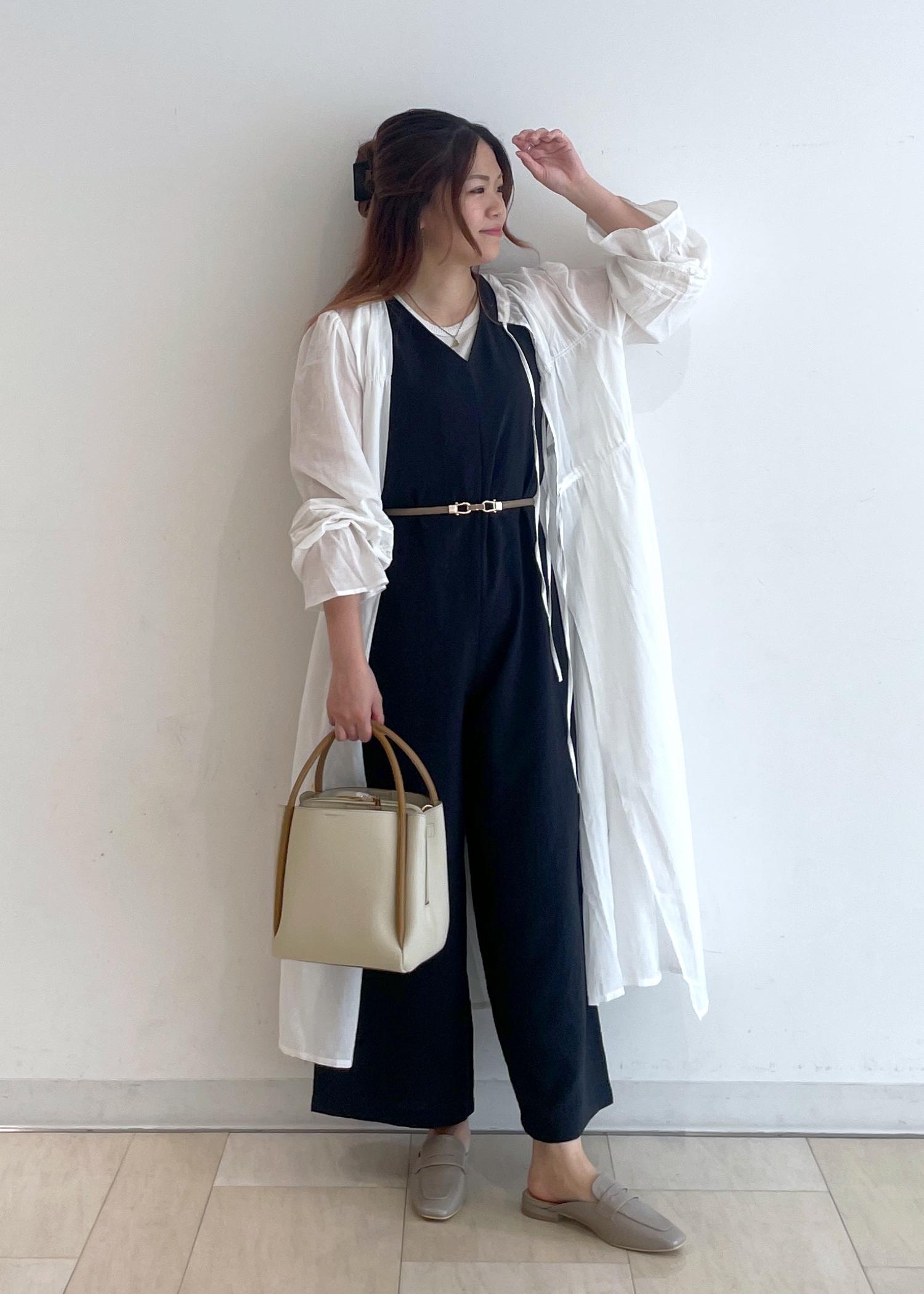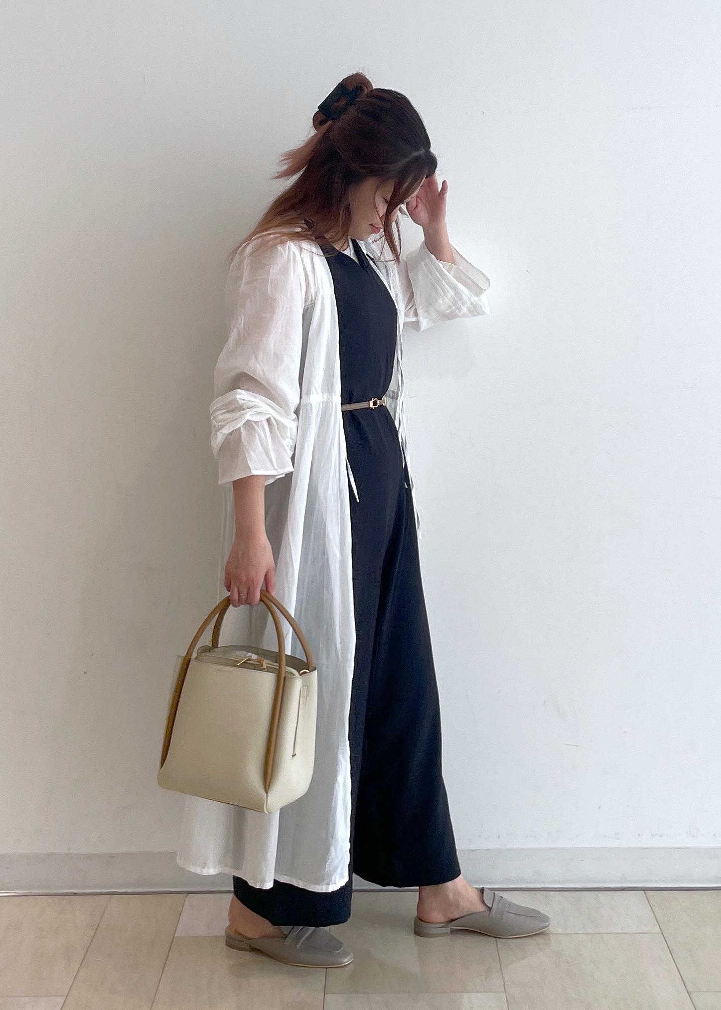 フェミニンな白のガウンワンピースに、チャコールグレーのオールインワンを合わせて、大人な涼しげコーデにしました!