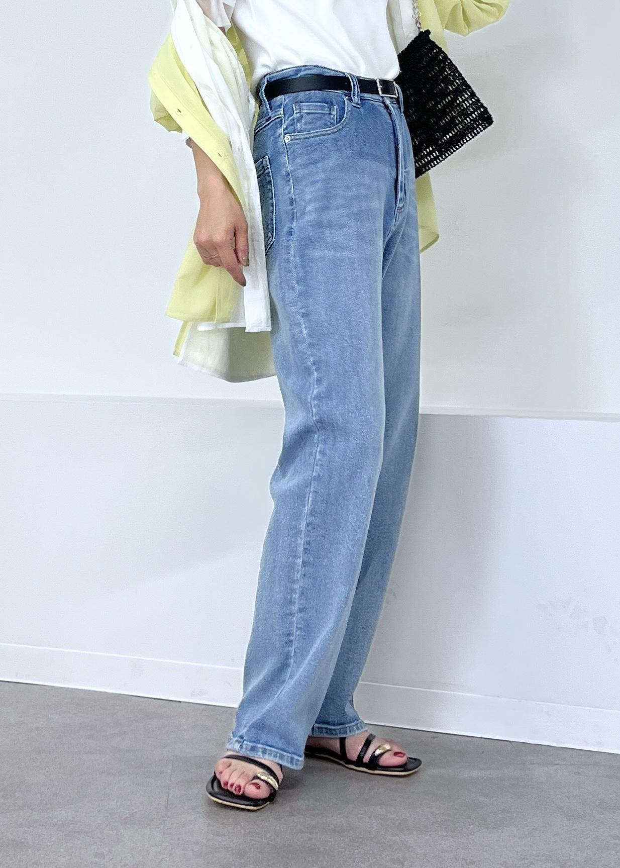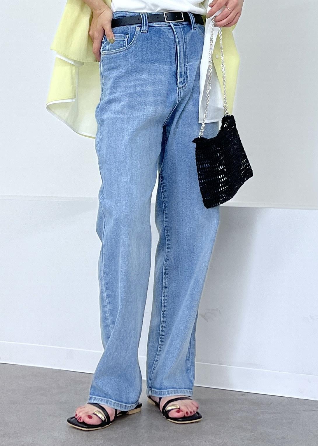 デニムでシンプルなスタイリングですが、小さめのバッグやベルトをブラックにして引き締めました。