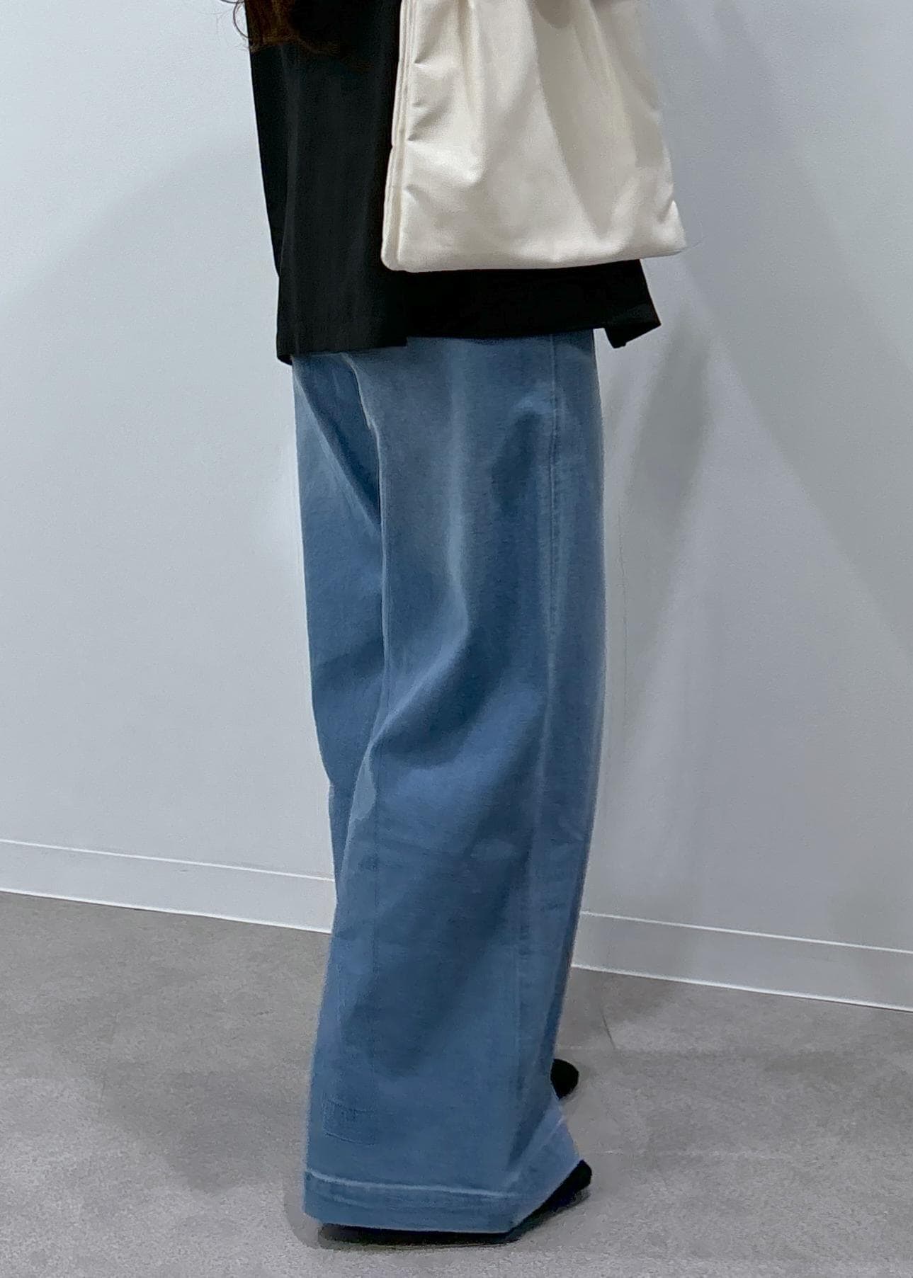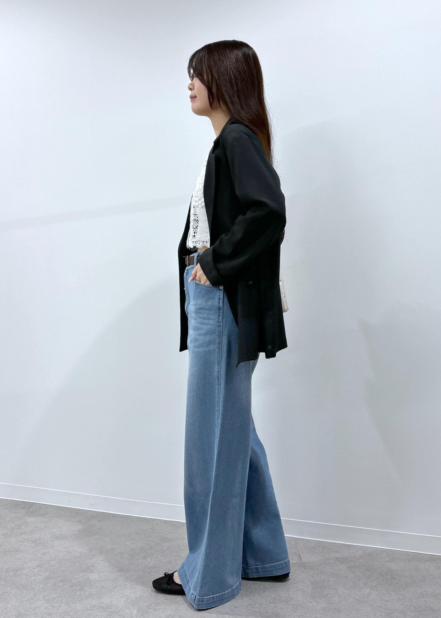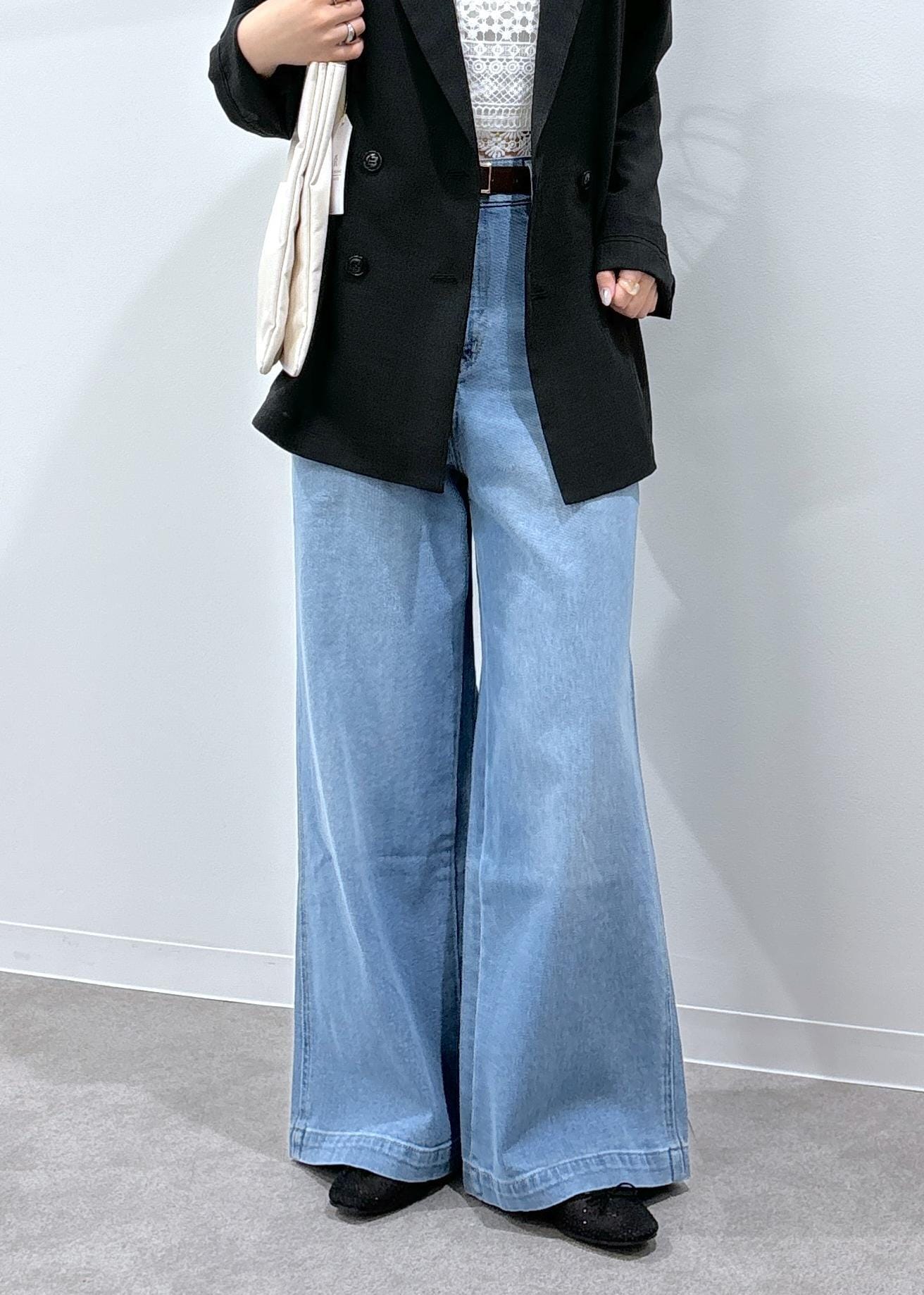 ハイウエストかつ綺麗に広がるワイドシルエットで脚長効果抜群のデニムパンツ。素材も柔らかく履きやすい一本です。161cm36サイズでくるぶしほど、38サイズで足の甲にかかるほどの丈感です。