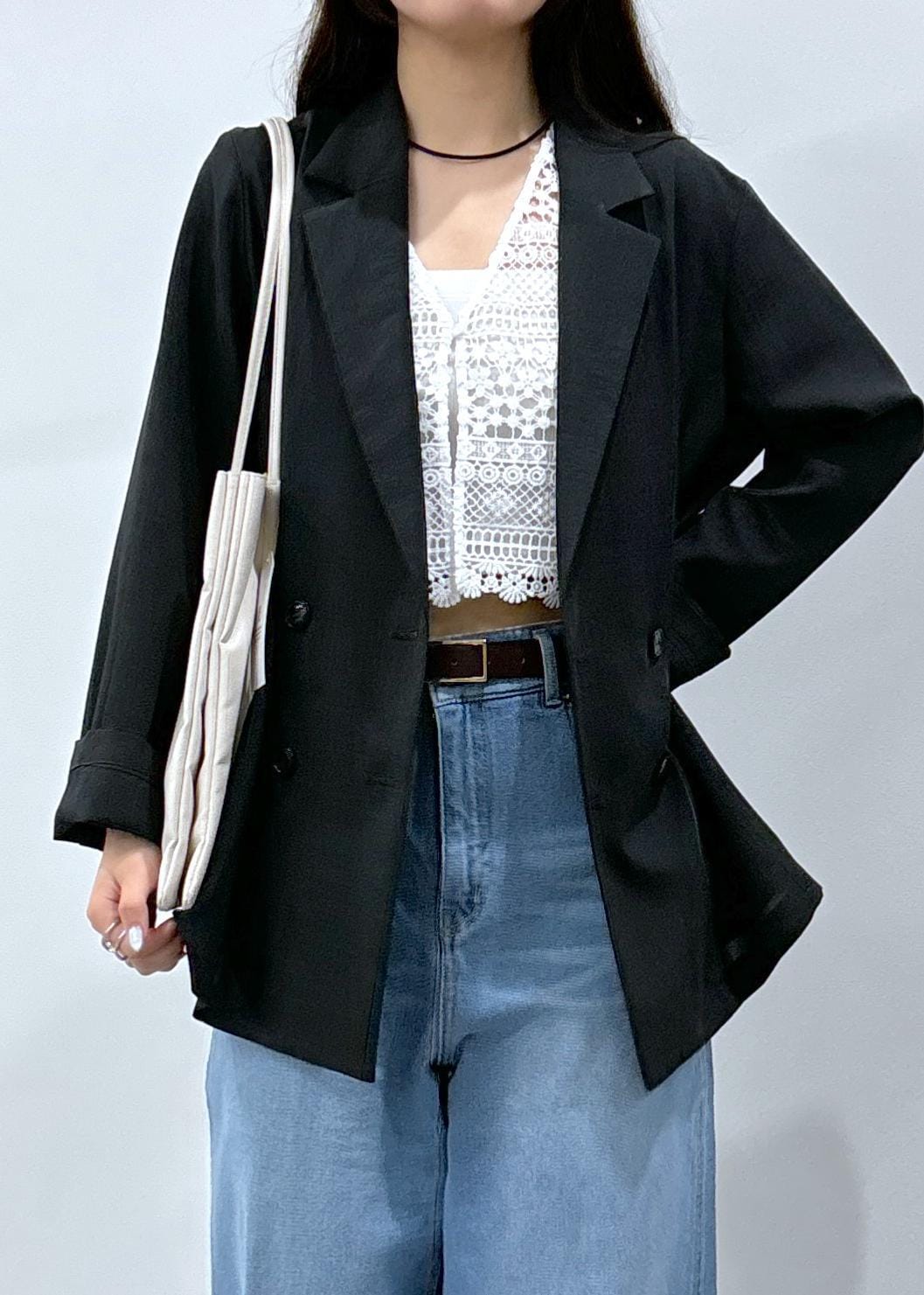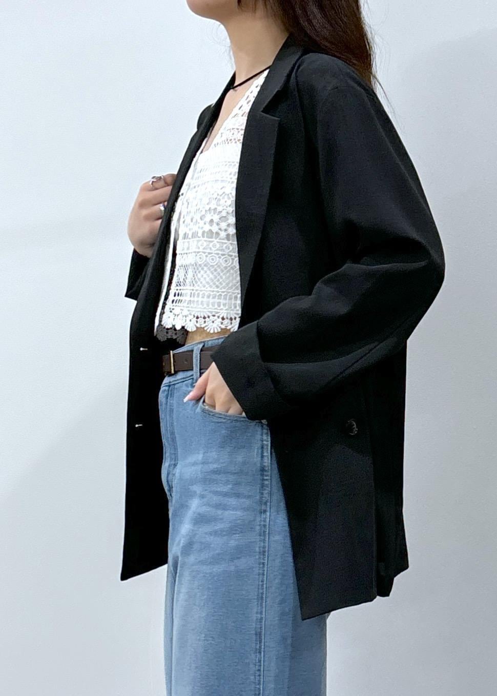 レースベストをインナーづかいに、透け感で程よい肌見せを叶えるヘルシーコーデです。ジャケットを羽織ることで女性らしいスタイリッシュさも演出できます。