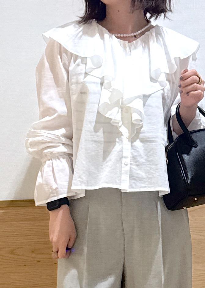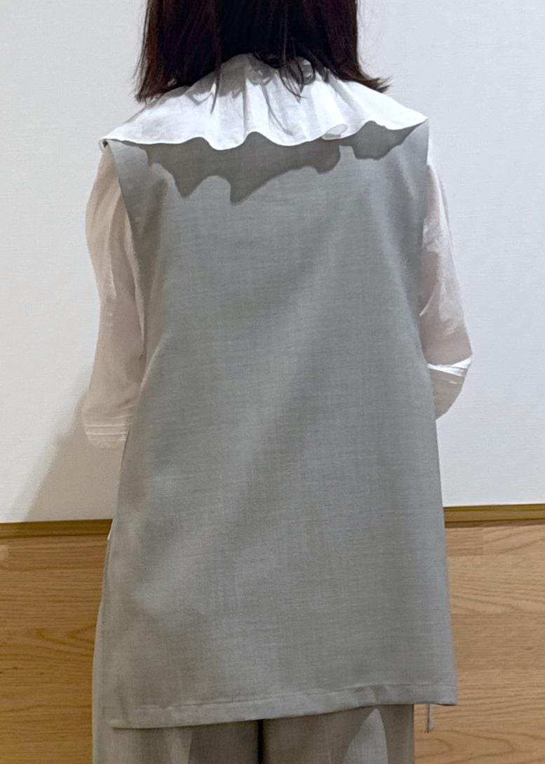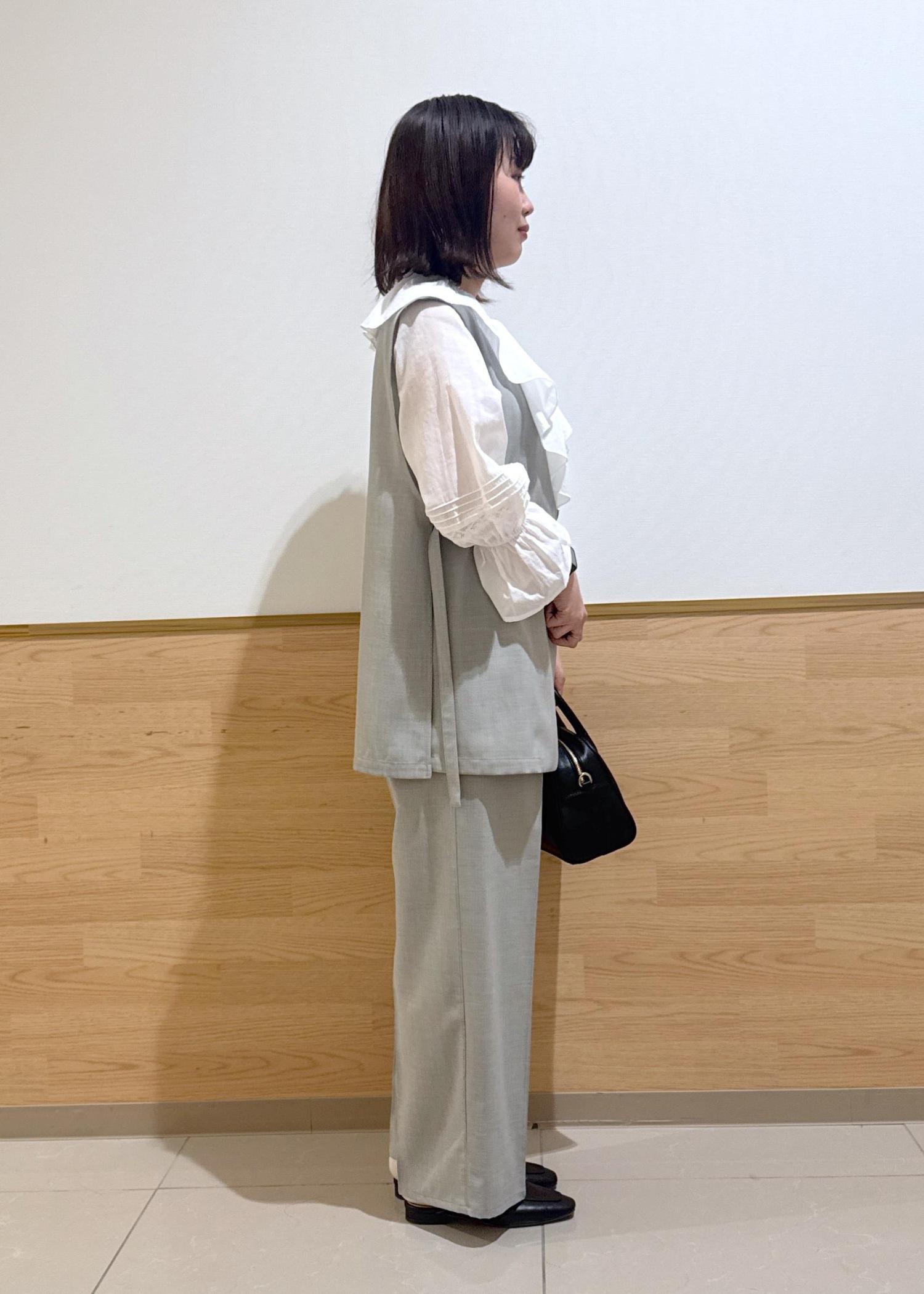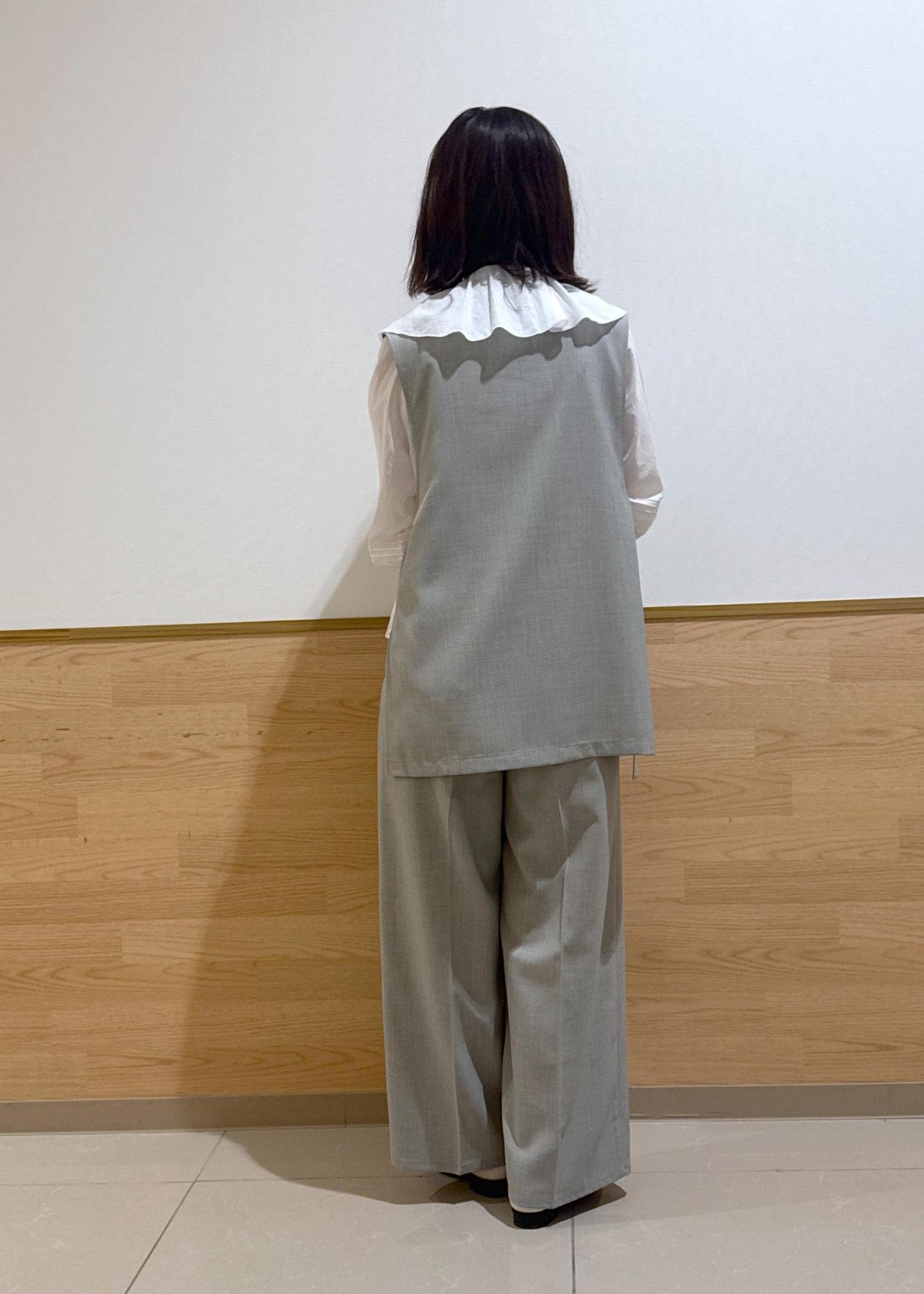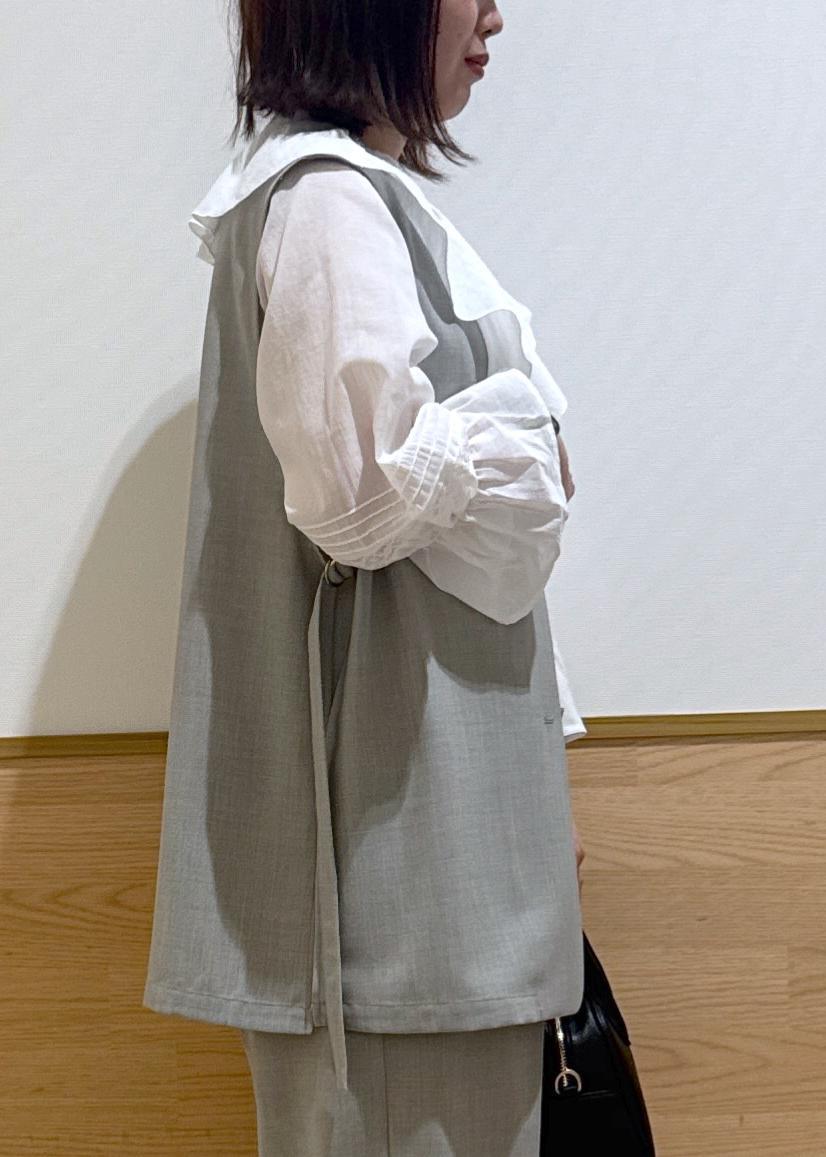 ジレがノーカラーなので、ラッフルフリルとのレイヤードが映えました。