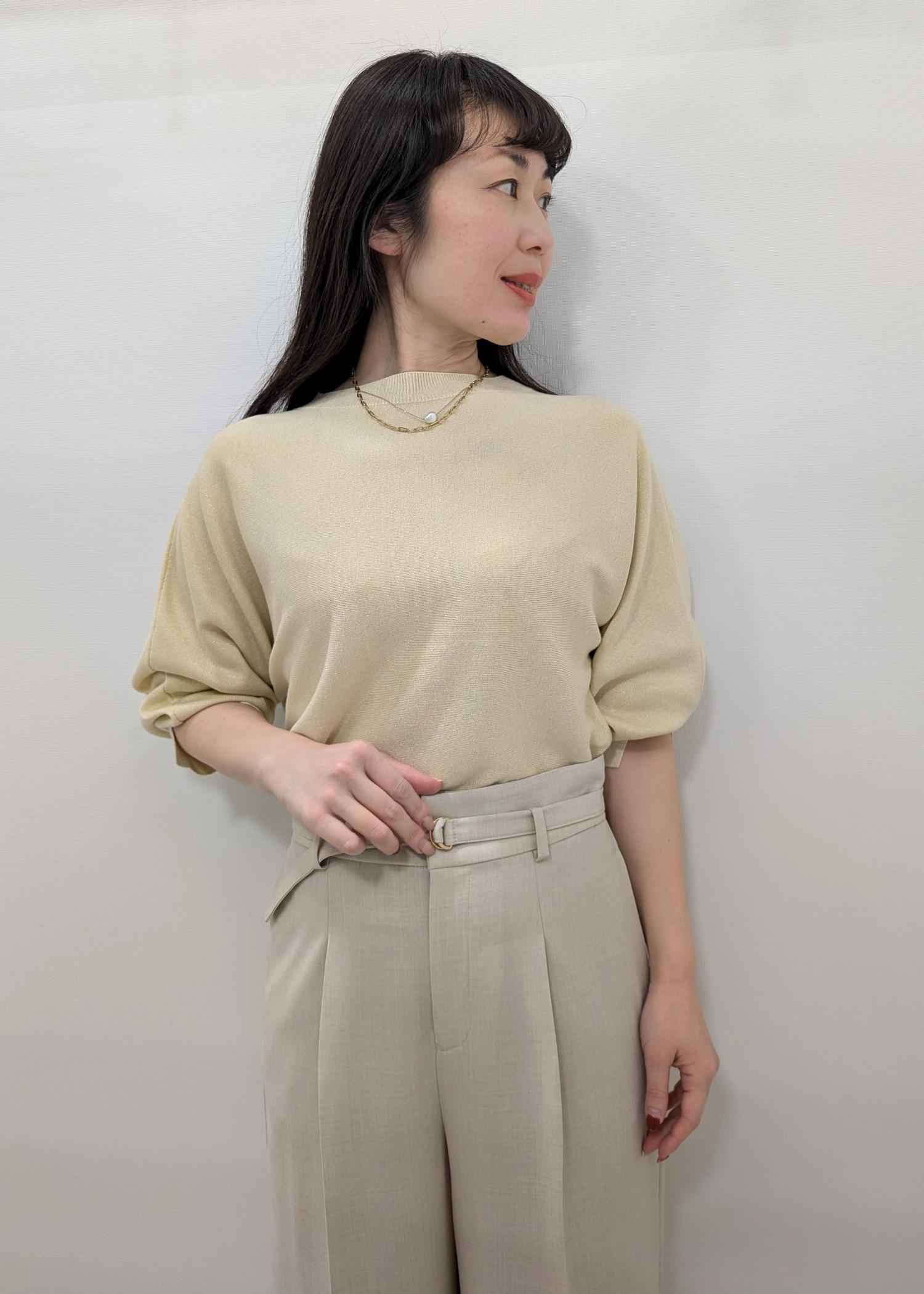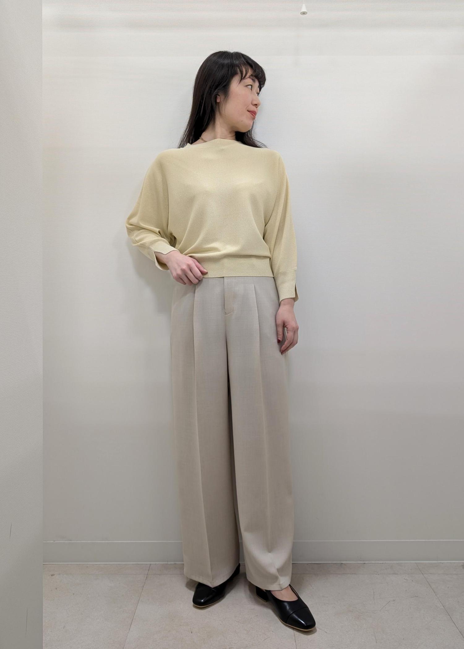 明るい印象の黄色のニット✕柔らかなベージュで、はじめましての方が多い季節におすすめのコーディネートです。