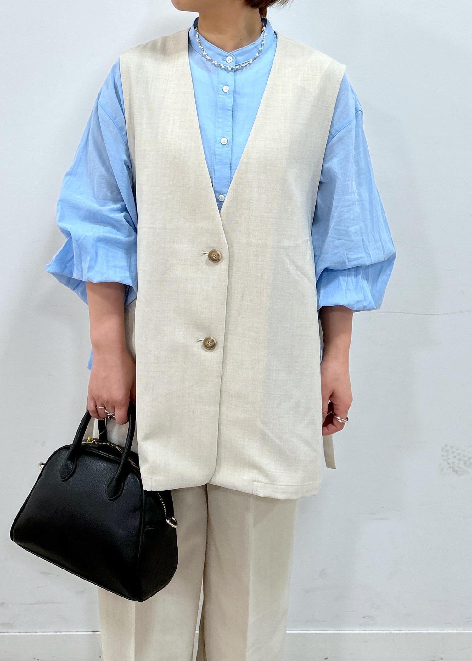 人気の綿ボイルペプラムシャツにセットアップのジレとワイドパンツを合わせて◎