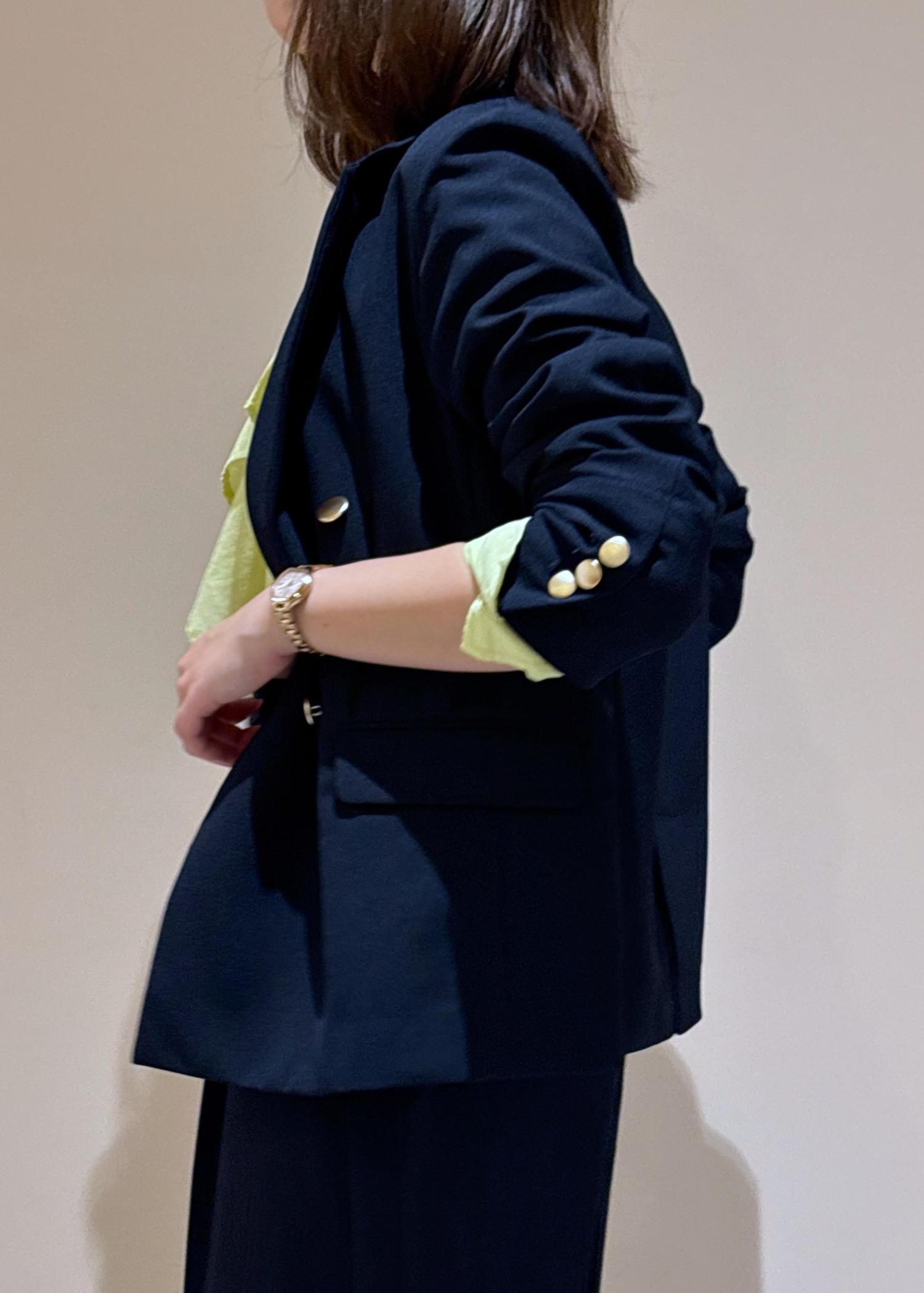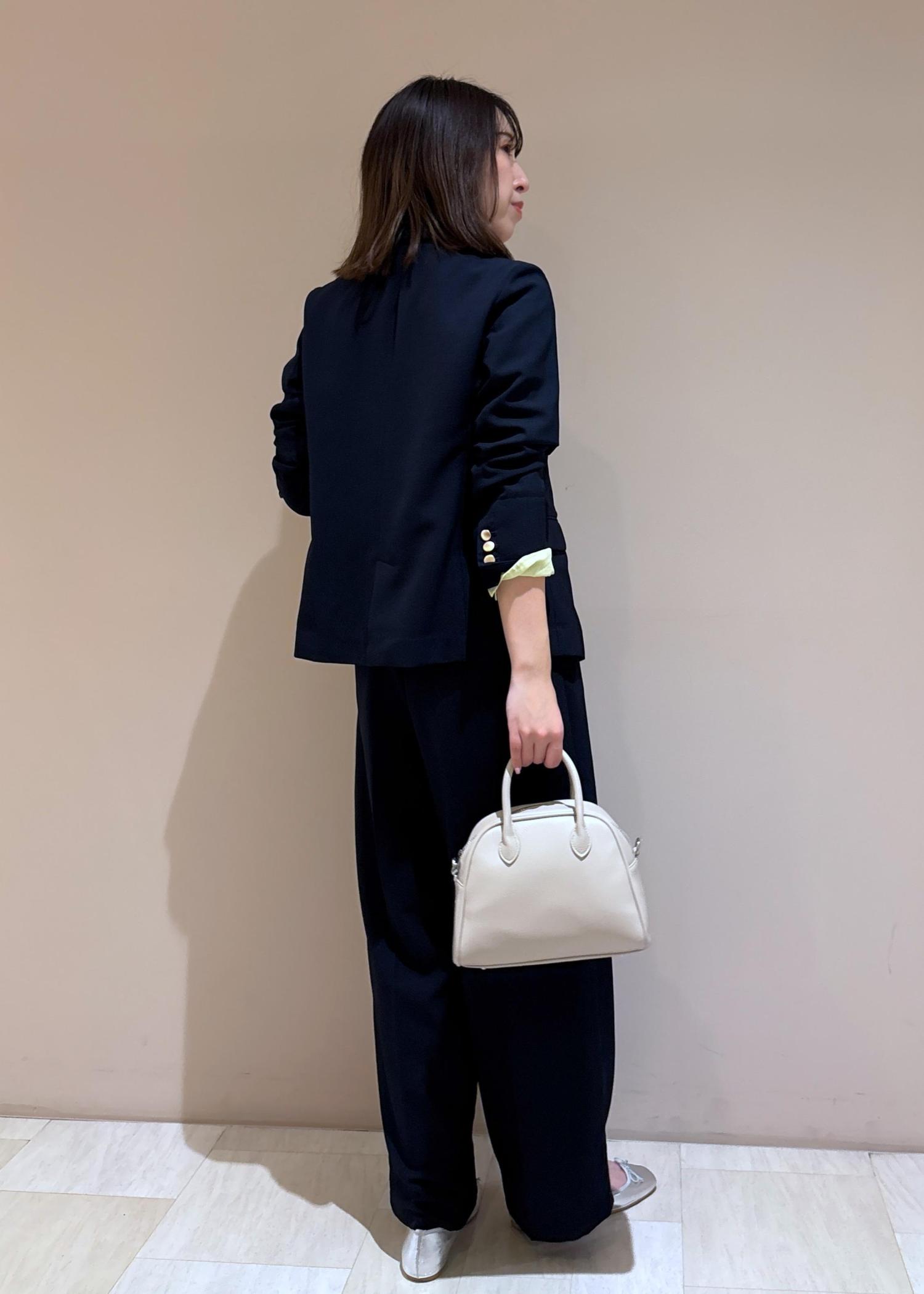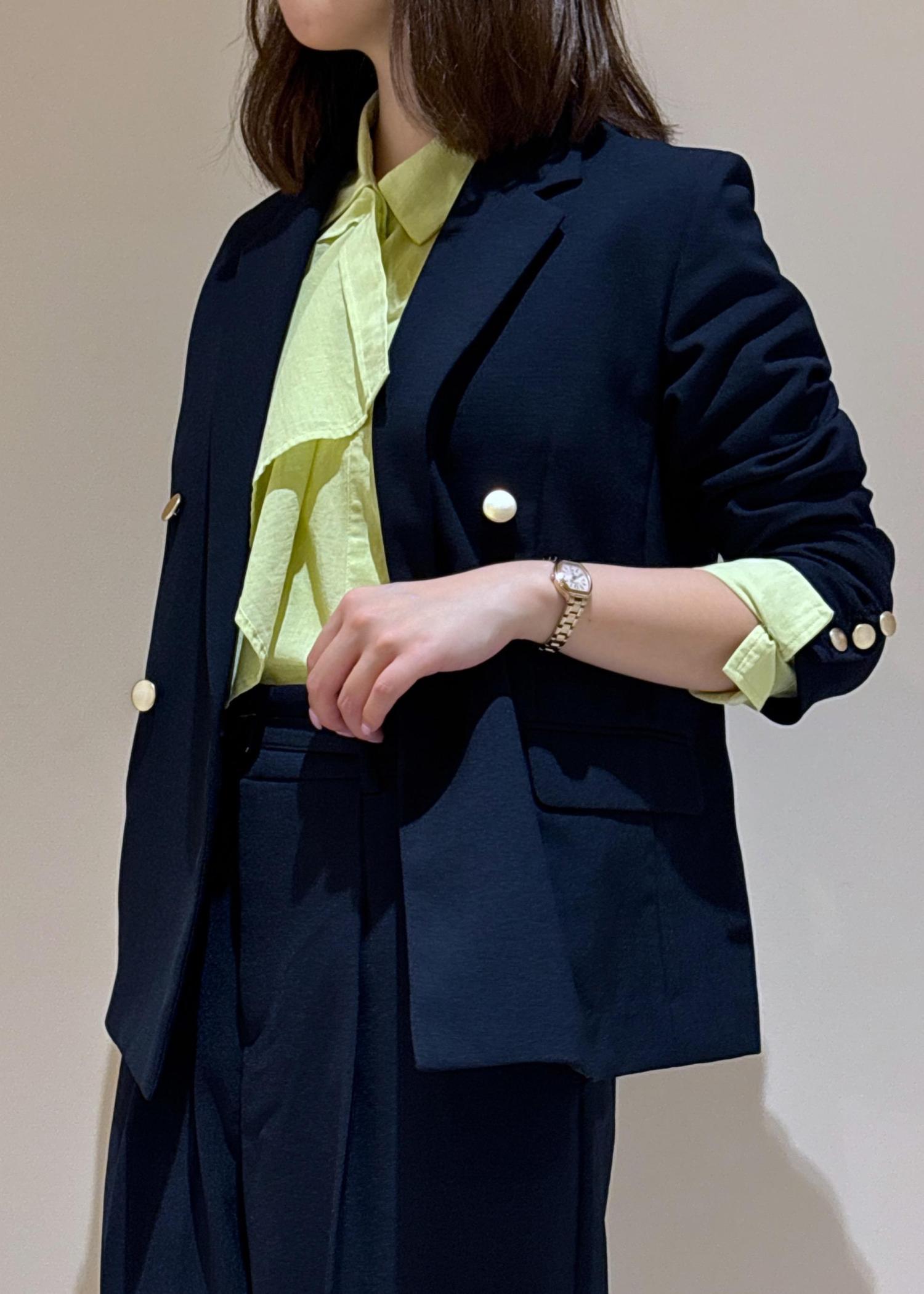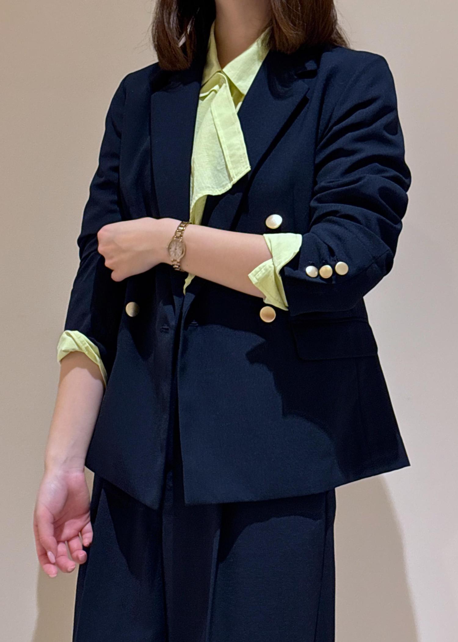 ロペピクニック人気アイテムのカナパ金ボタンジャケットとハイウエストパンツのセットアップを使ったお仕事コーデ。