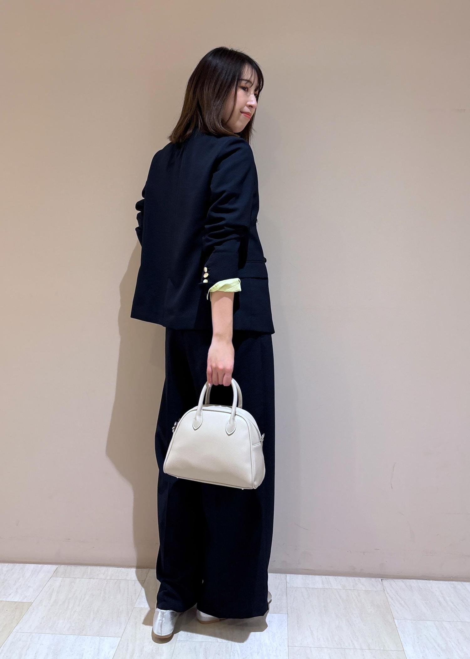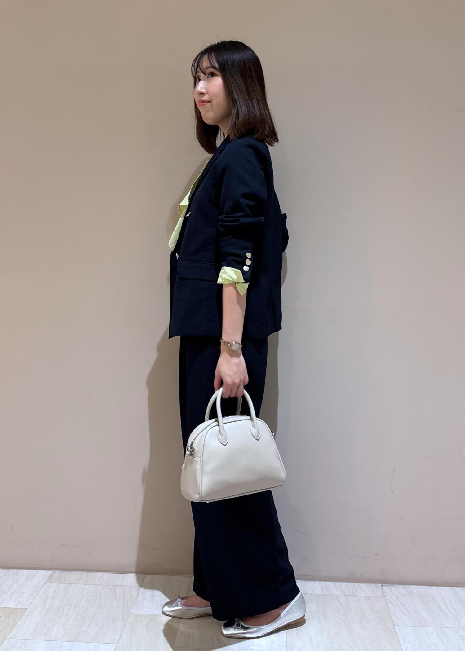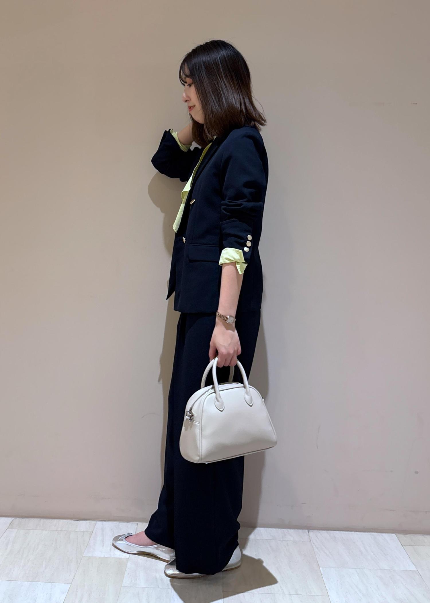 淡いイエロー×ネイビーで柔らかい印象になるように小物はホワイトやシルバーで合わせました。
