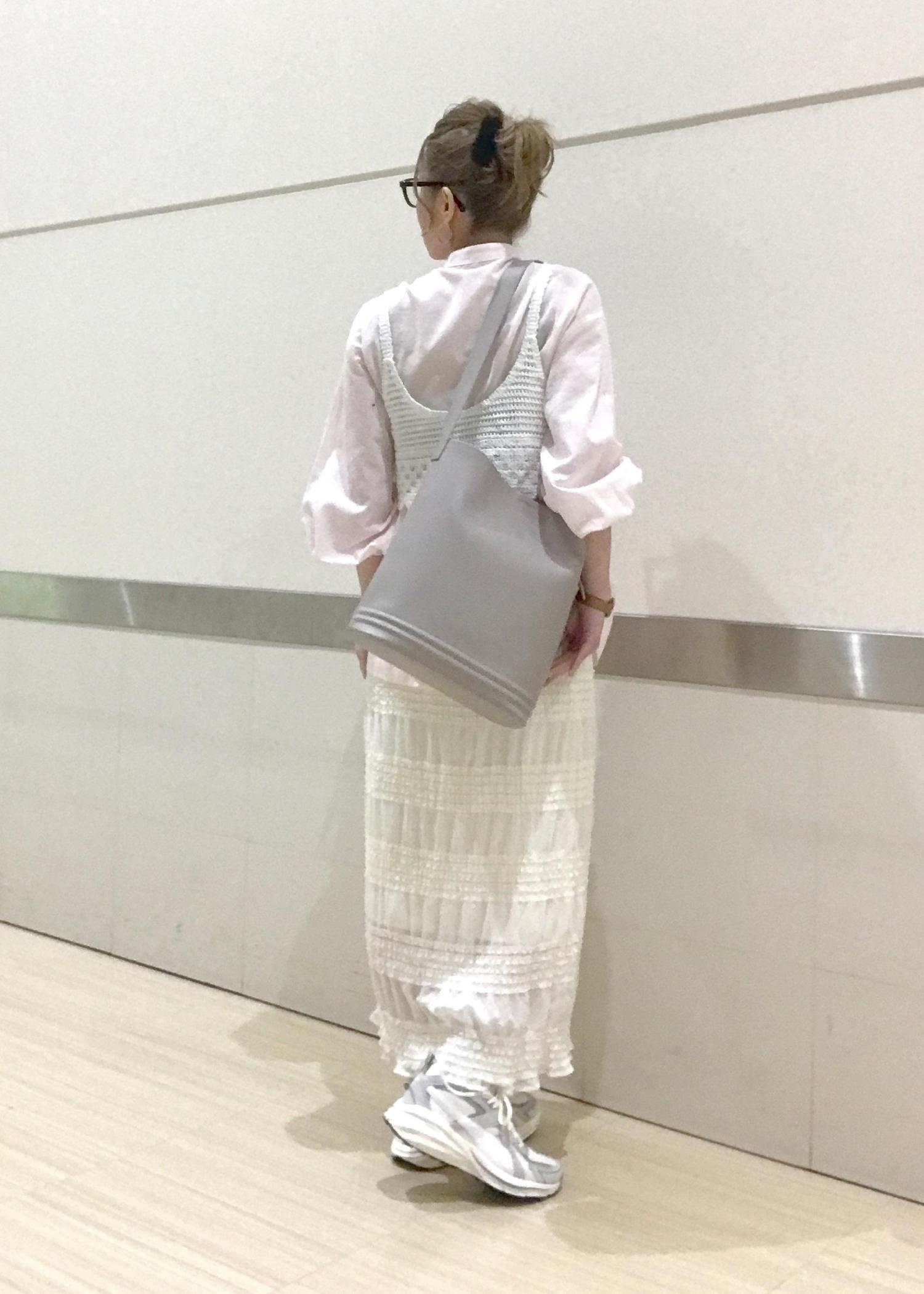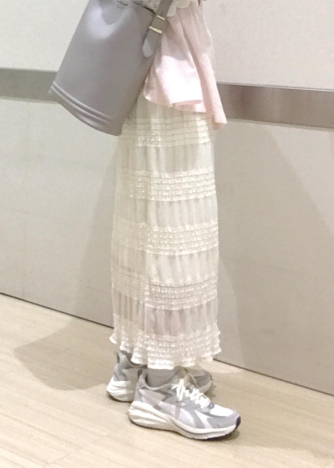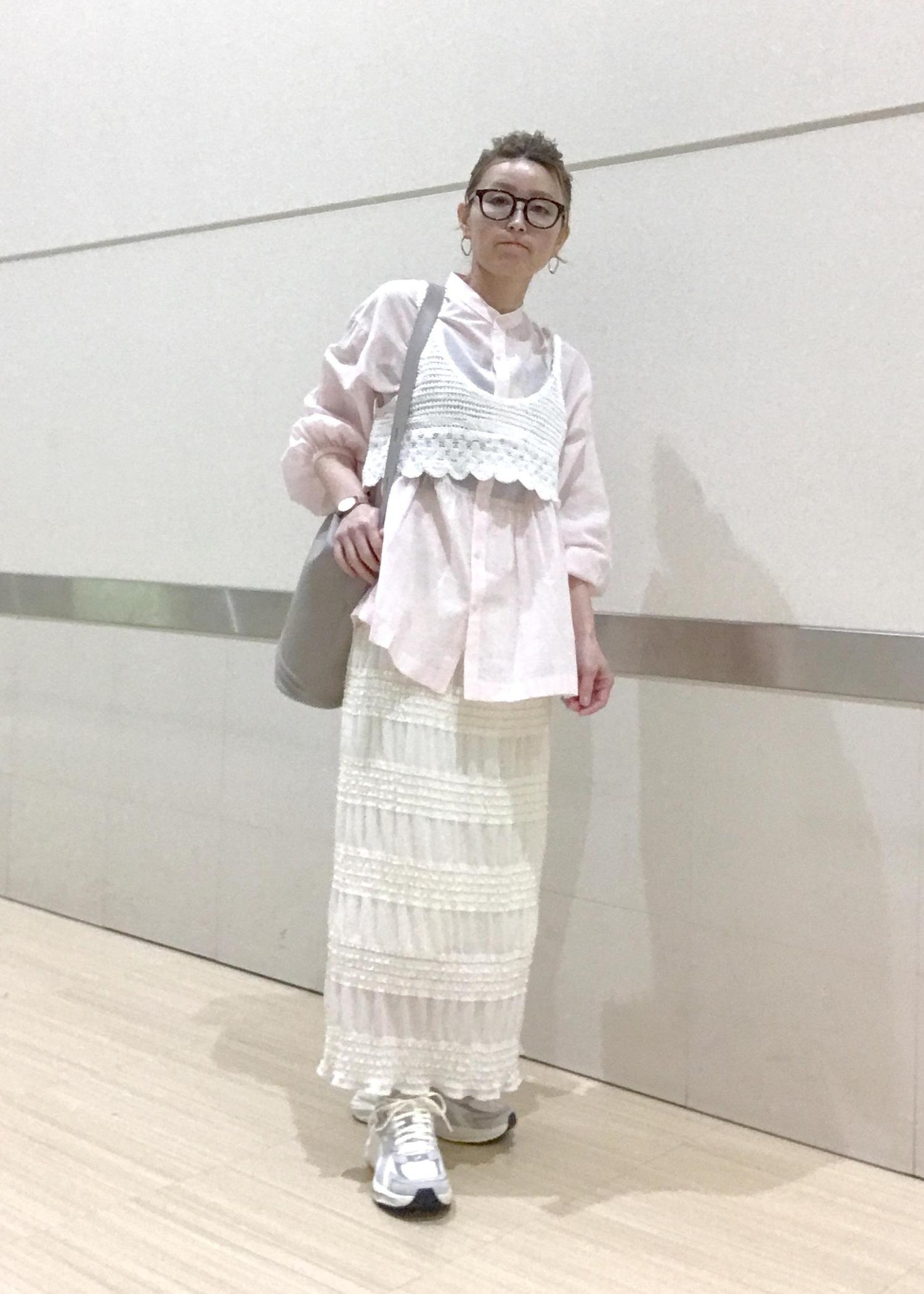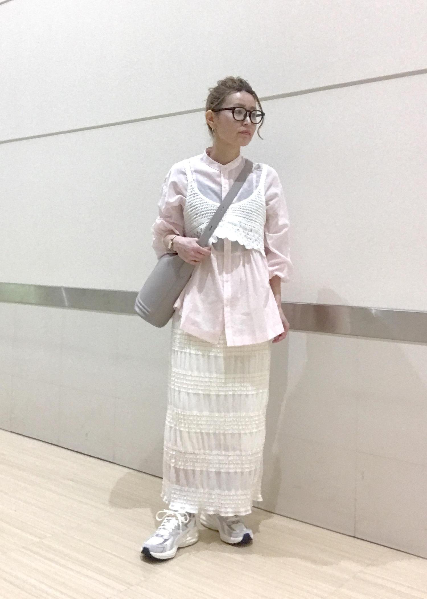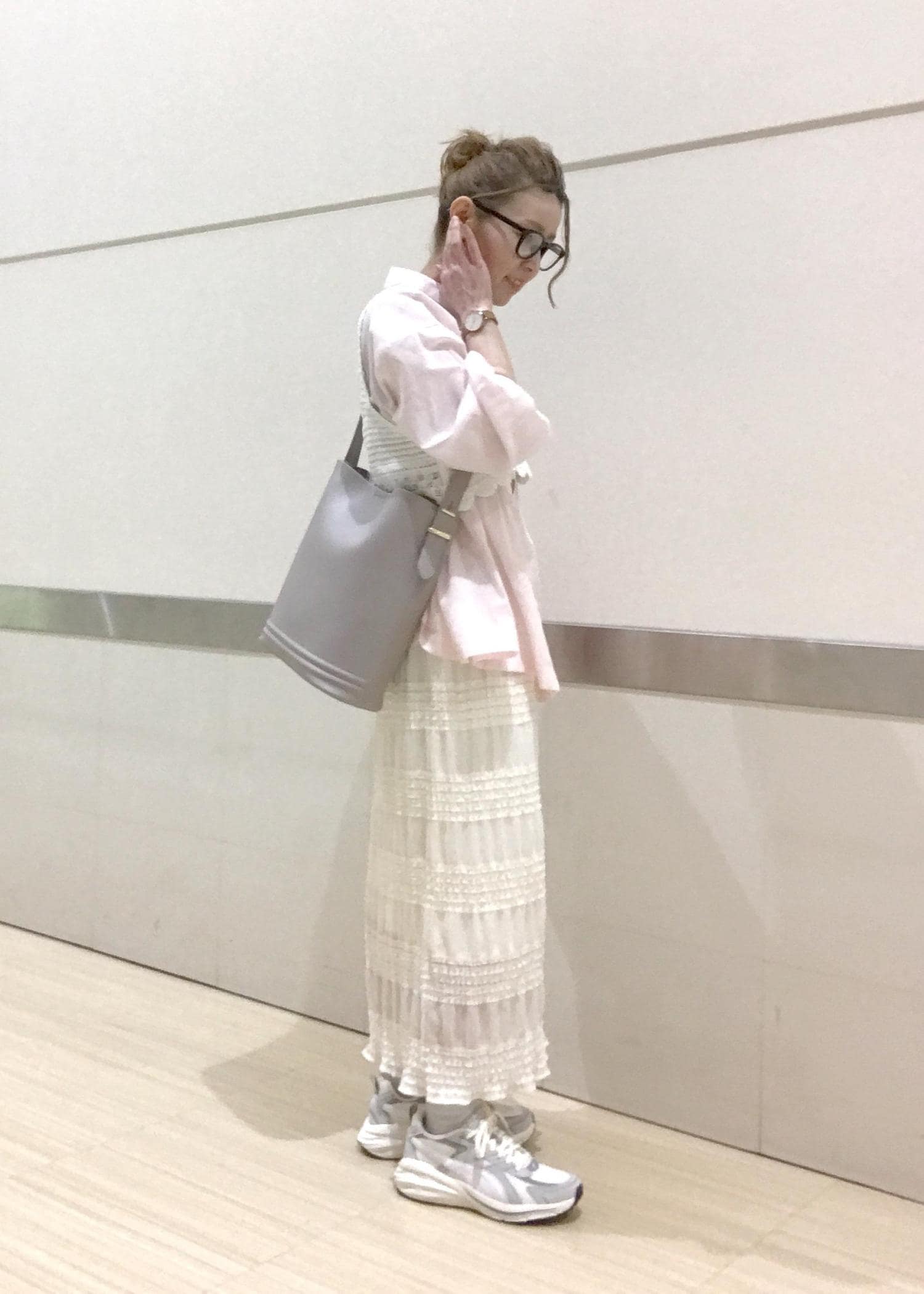 春らしいピンクのペプラムシャツに甘くなりすぎないよう足元はスニーカーを合わせたスタイリングにしました…♪