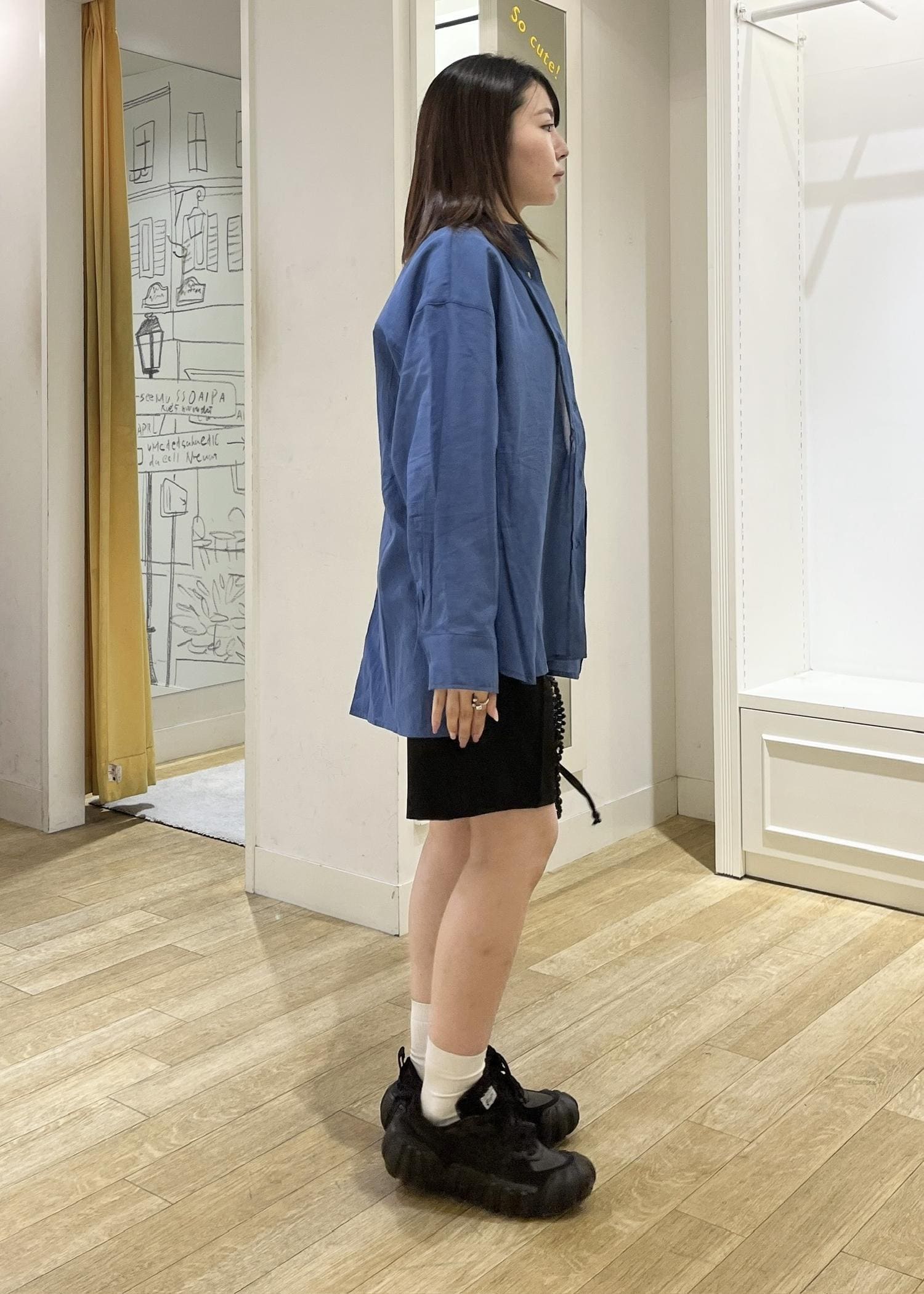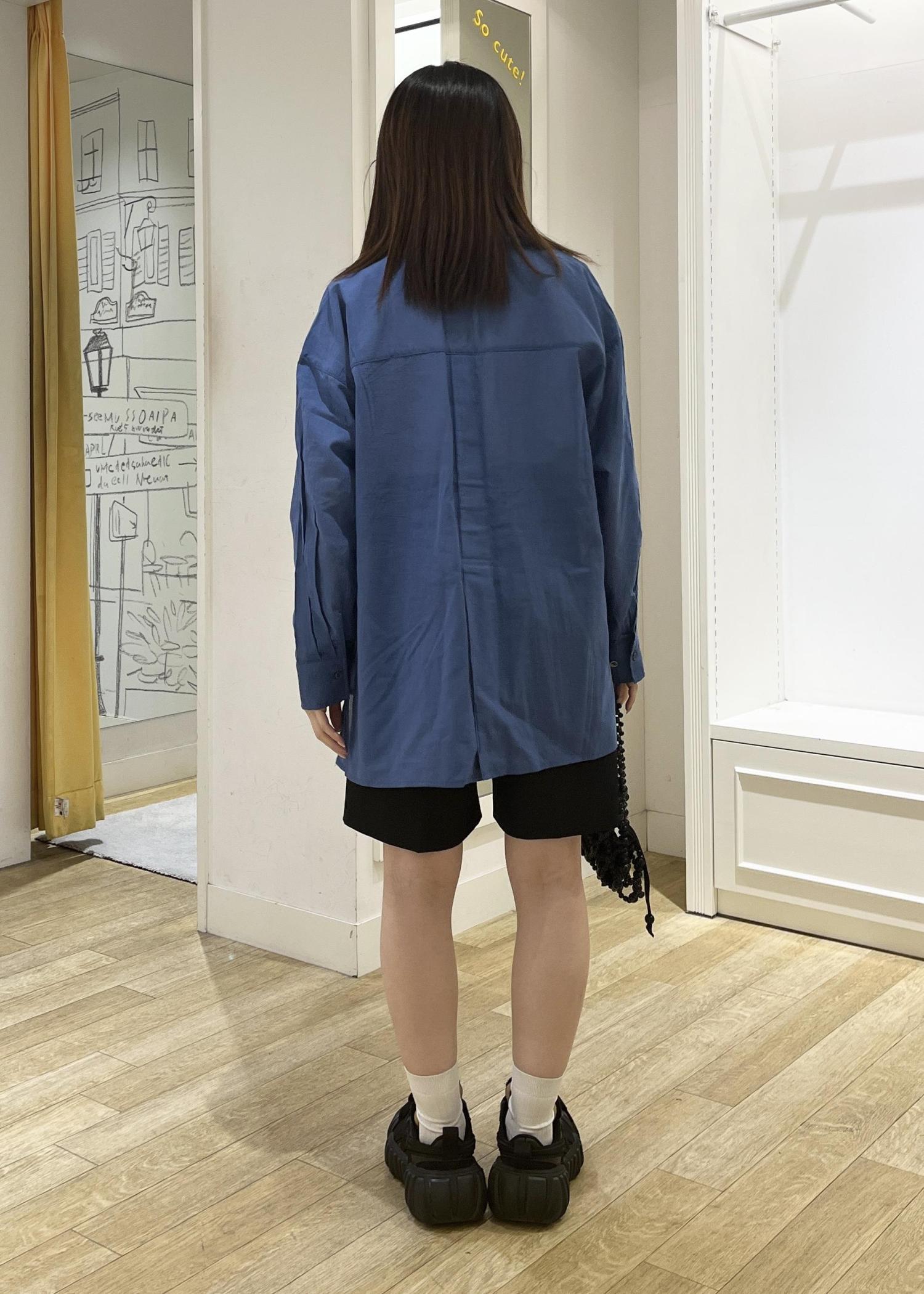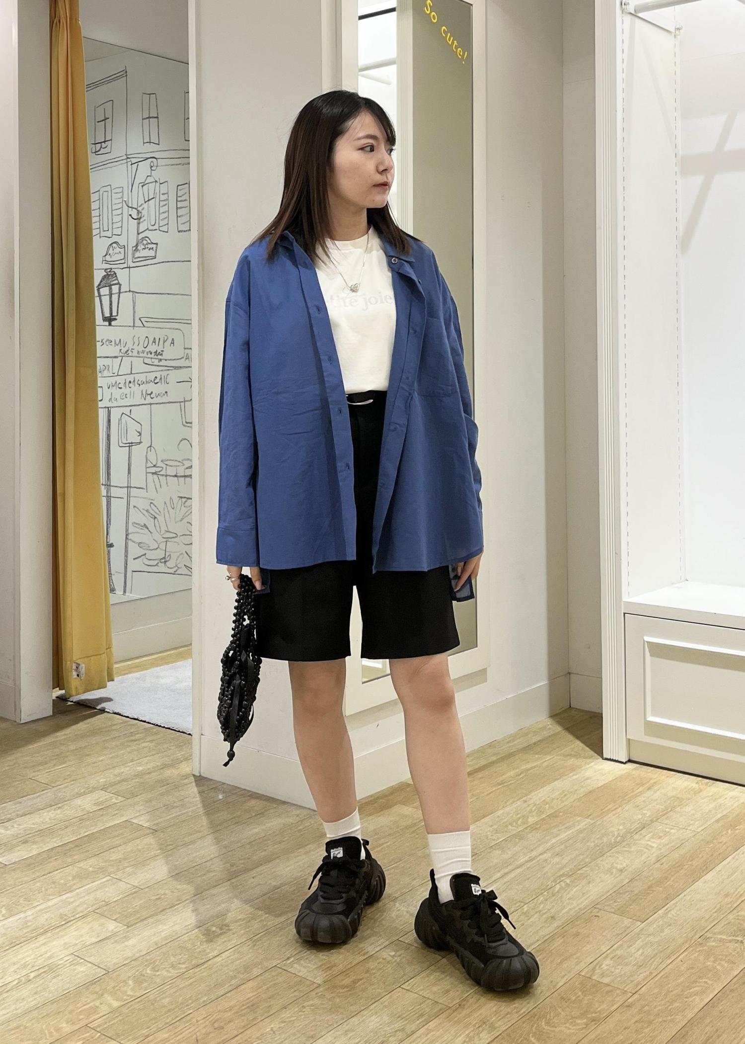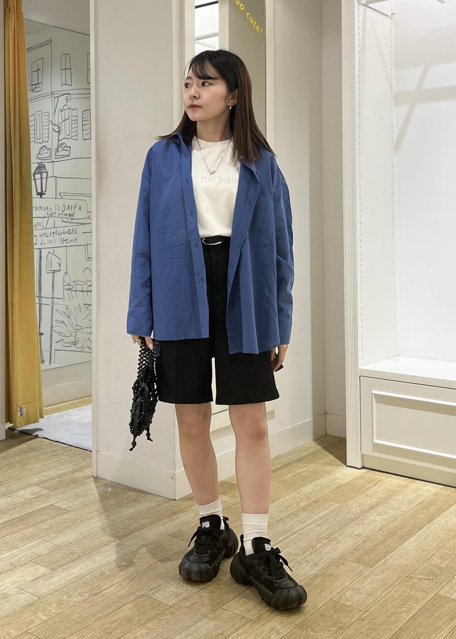 綿100%のブルーのシャツをメインにしたコーディネートです。