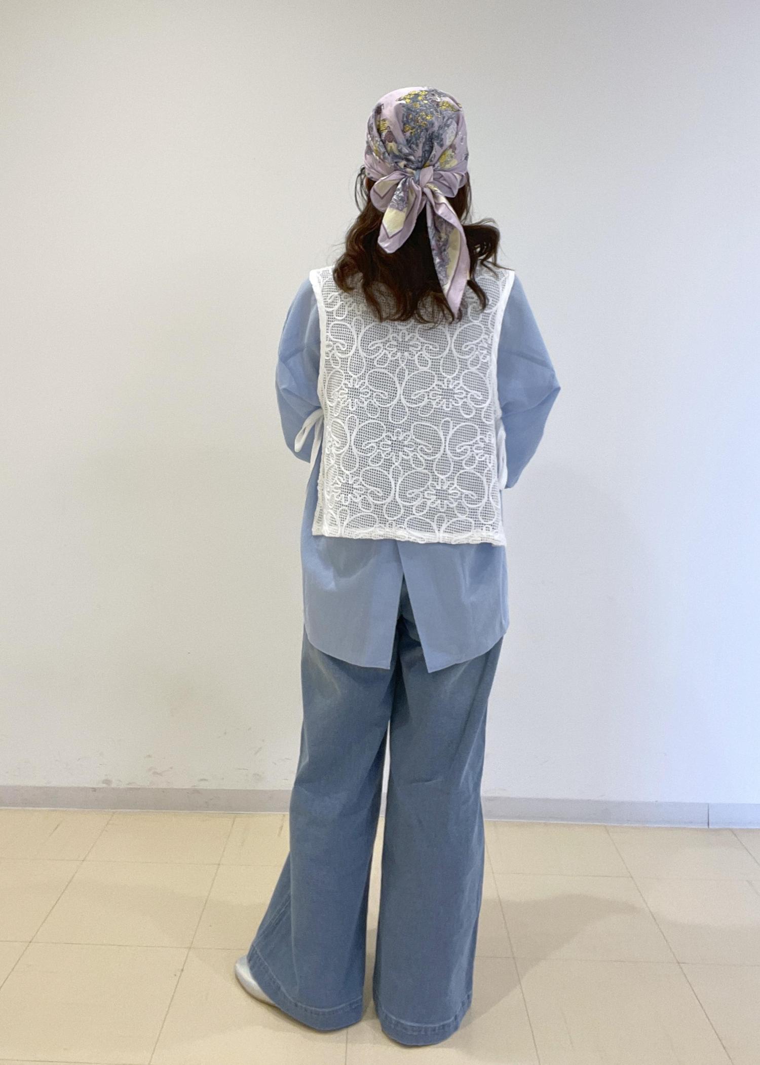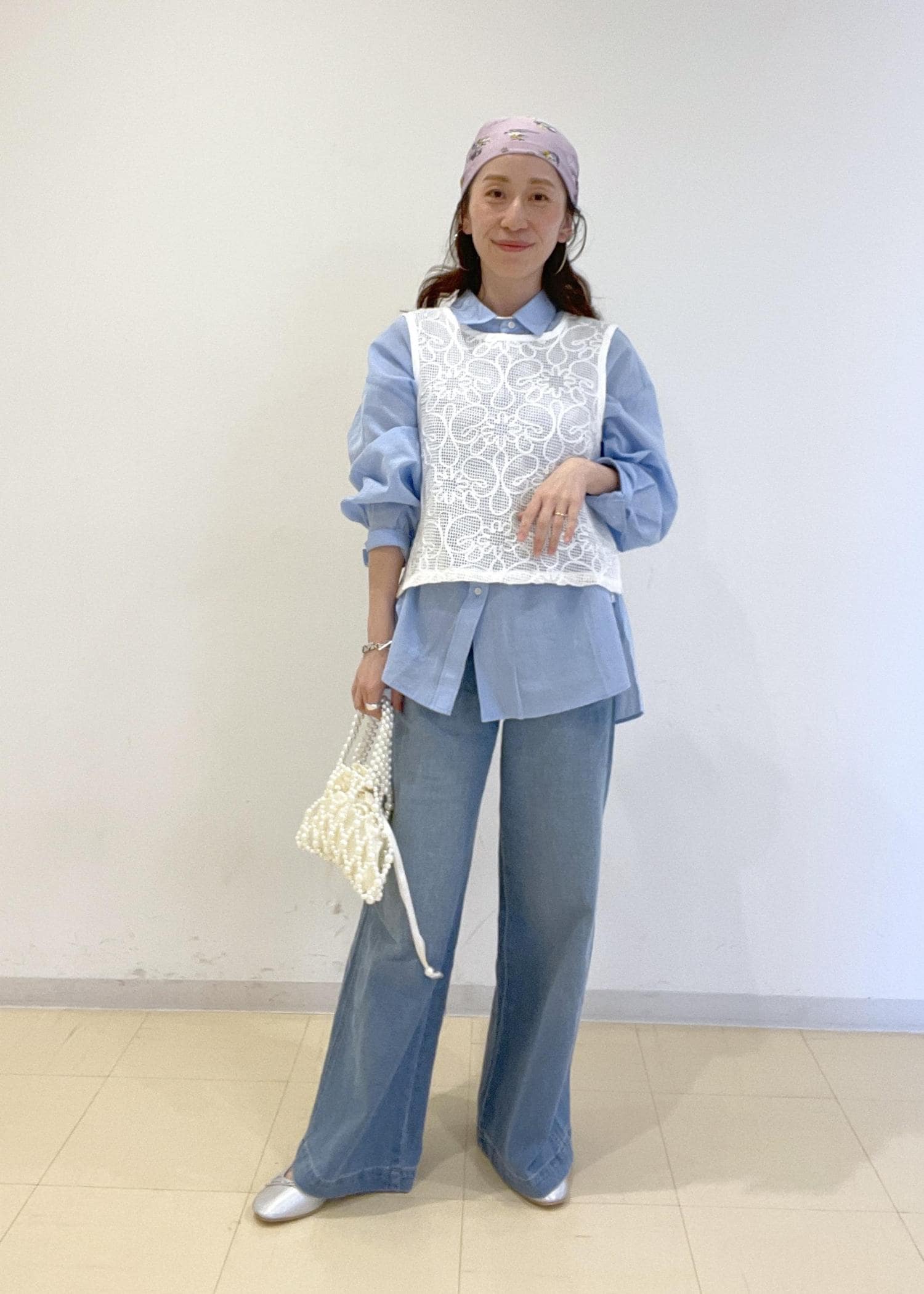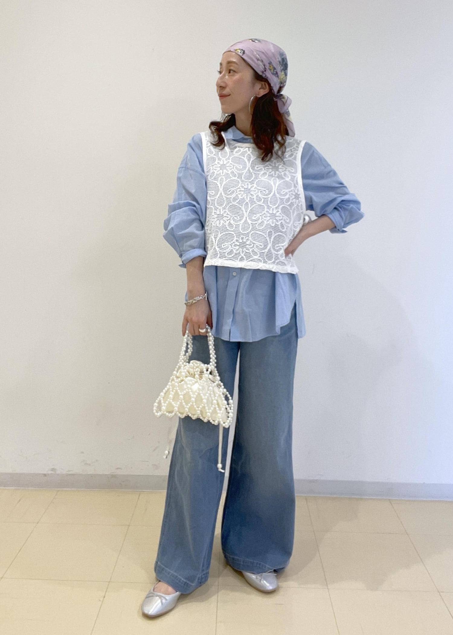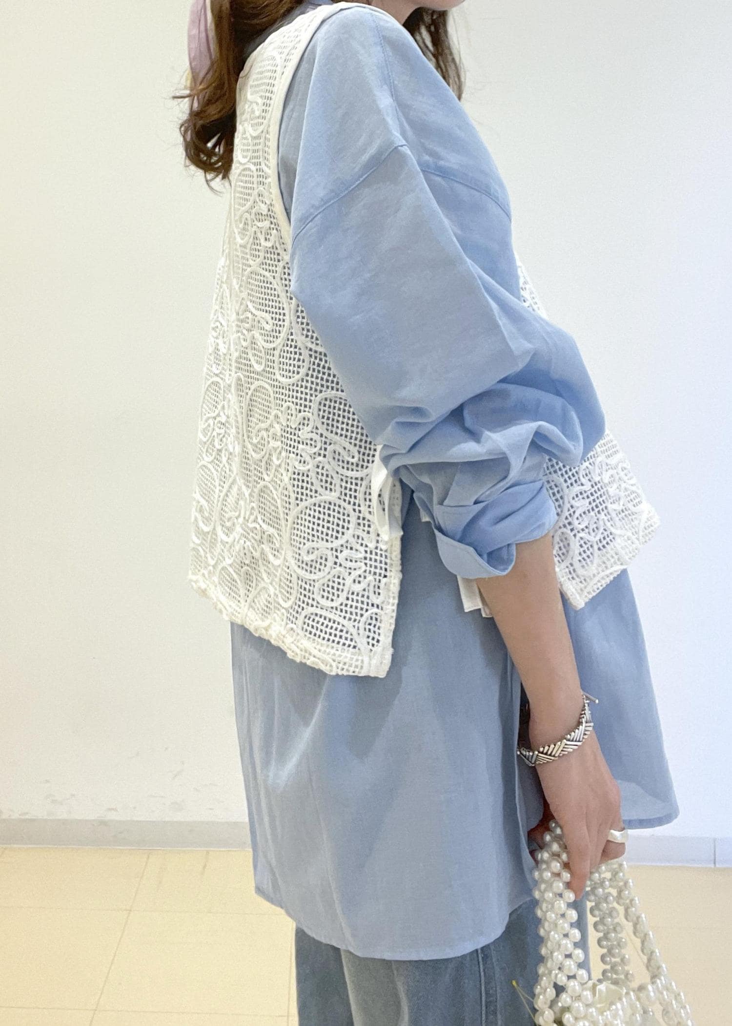 綿100%でさらっと着れるレギュラーシャツは1枚で着ても、羽織としても使えるアイテムですが、今回はレースのベストを重ねてみました☺︎