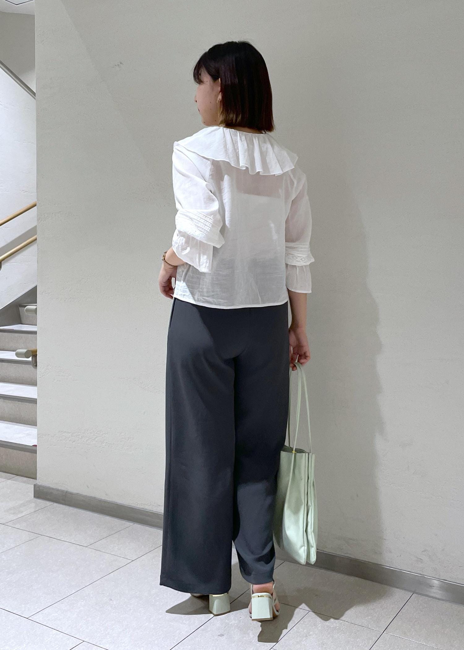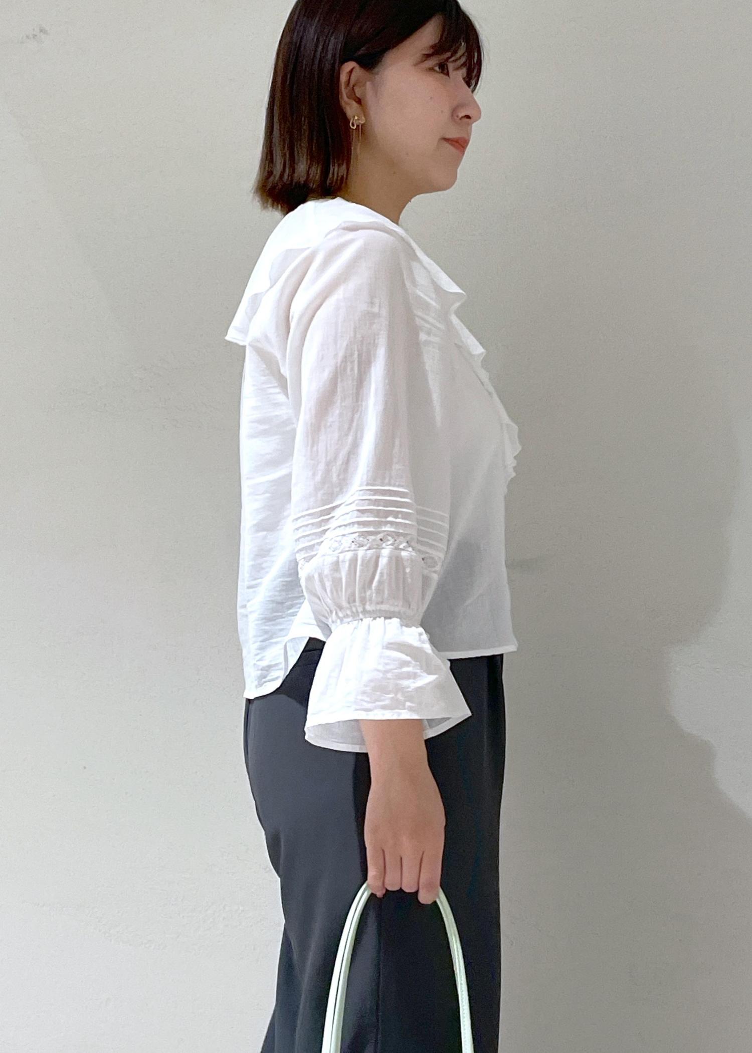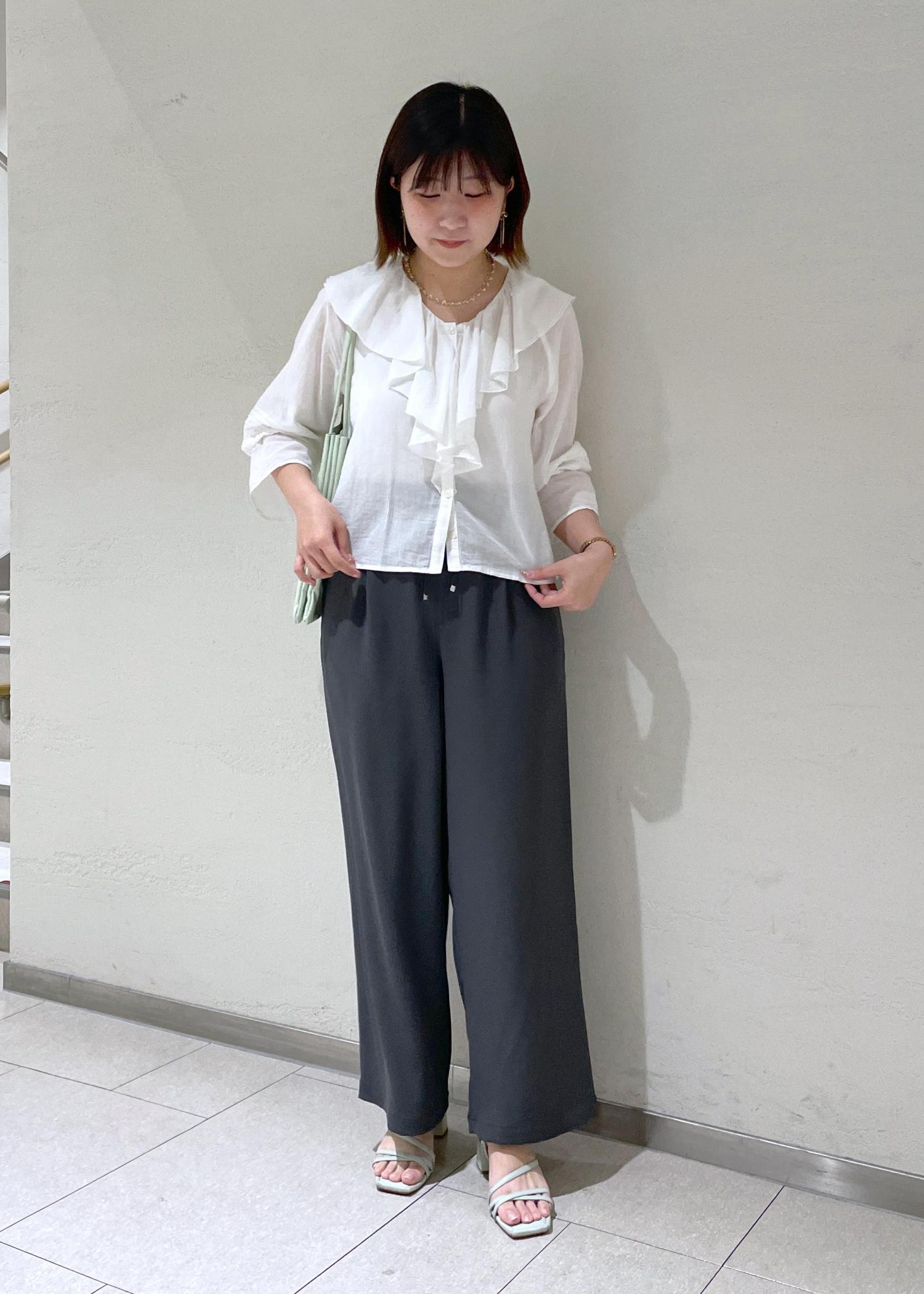 フリルが甘い印象なので体型カバーできるとろみパンツで合わせて引き締めました。