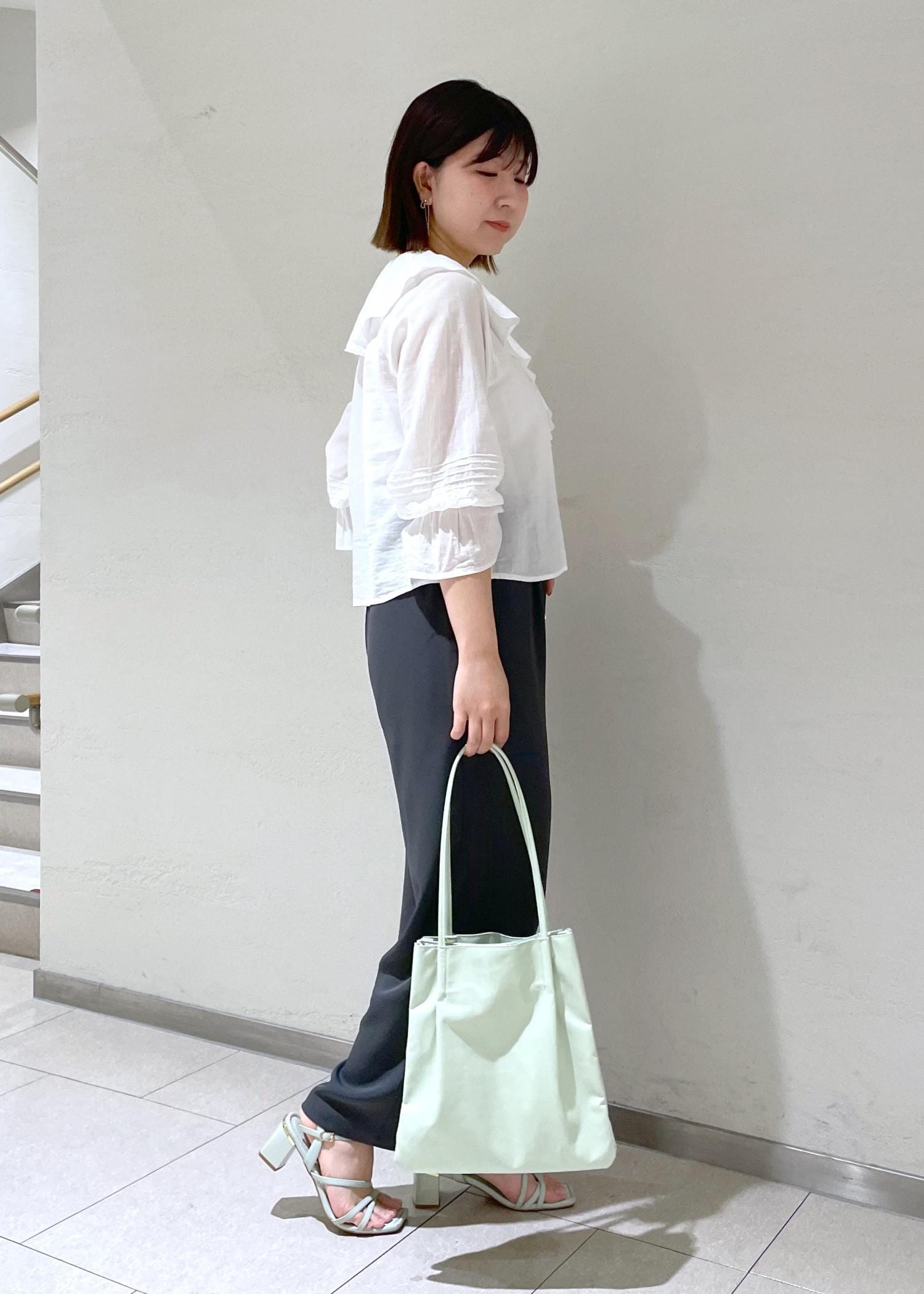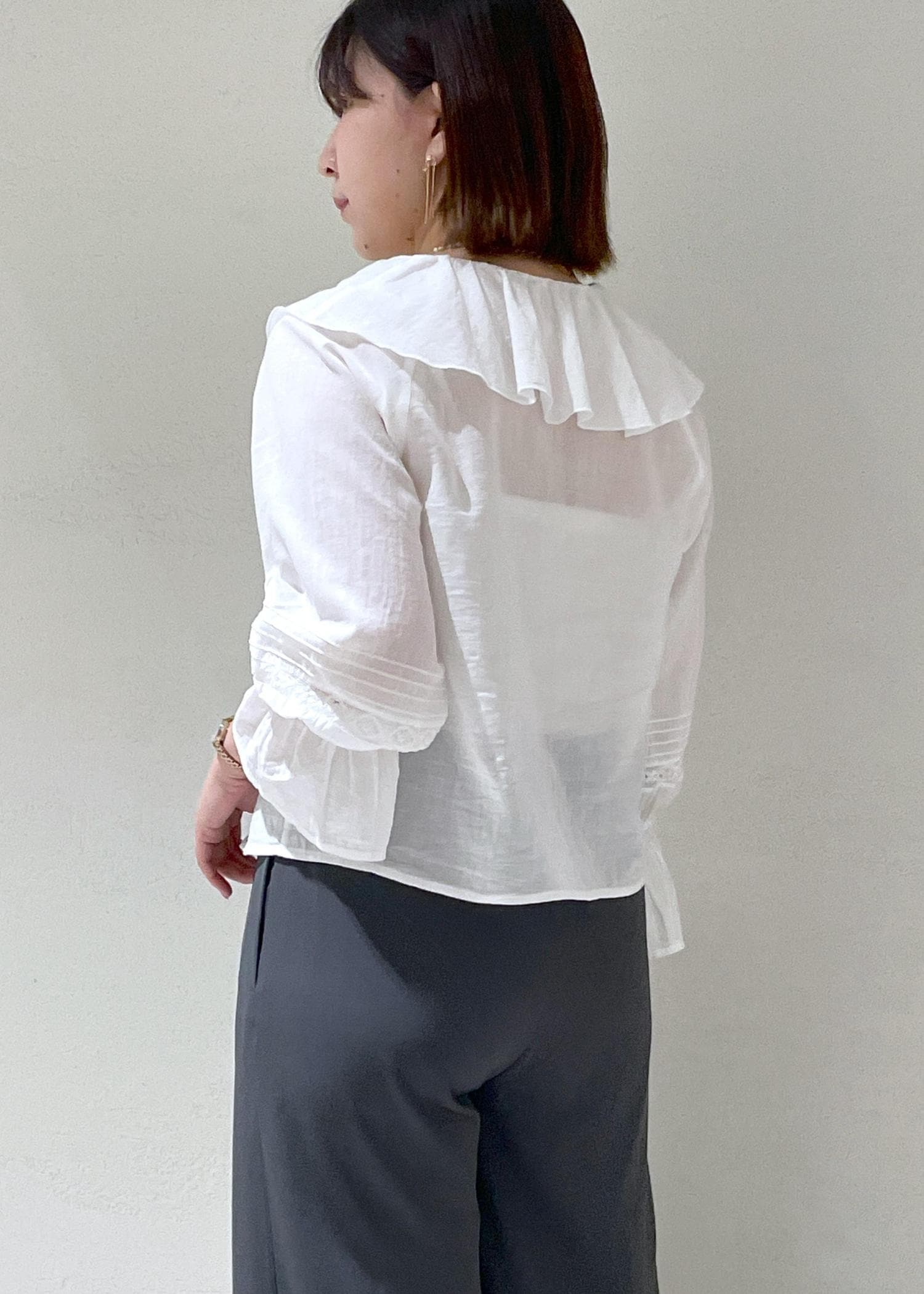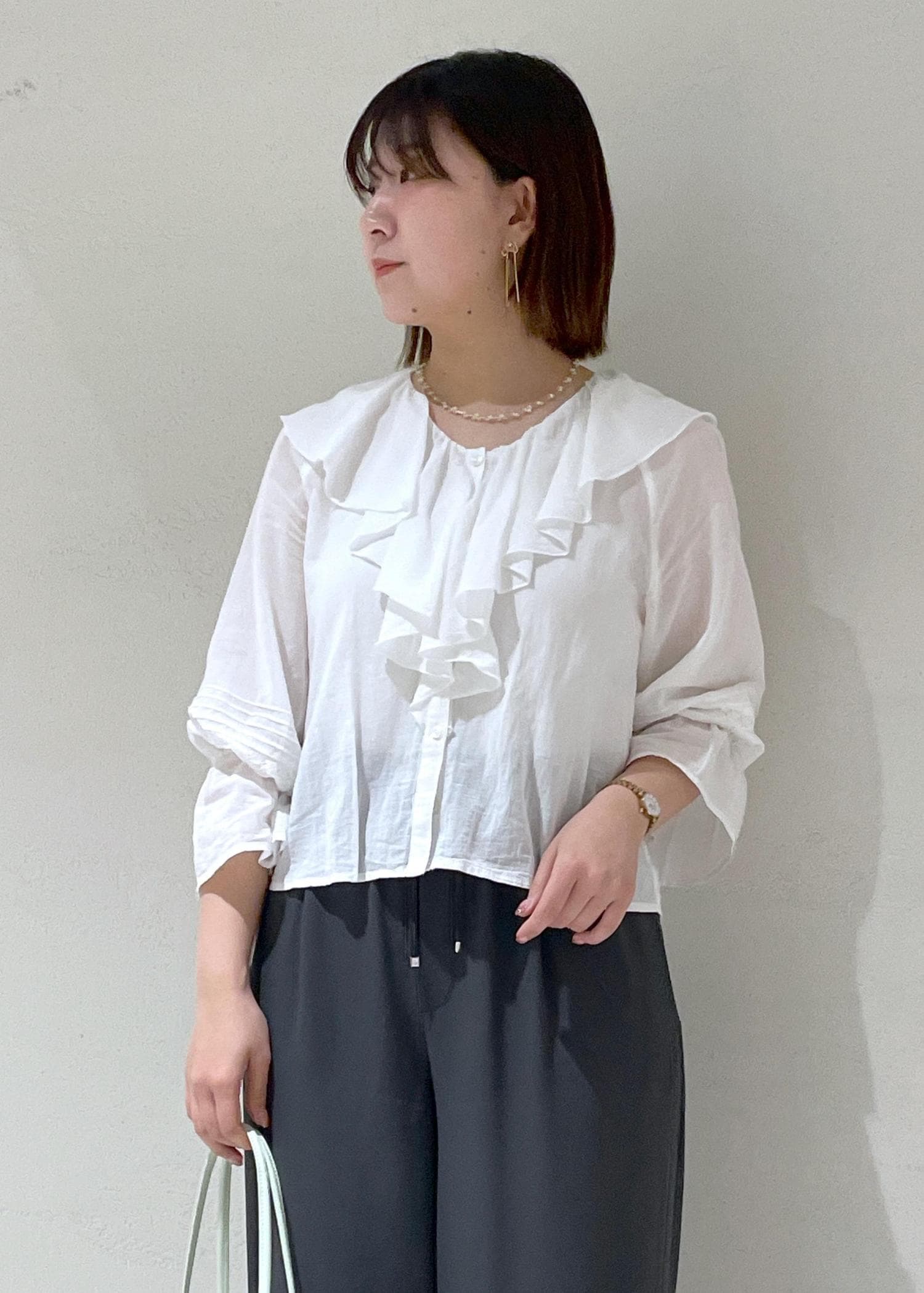 フリルが甘い印象なので体型カバーできるとろみパンツで合わせて引き締めました。