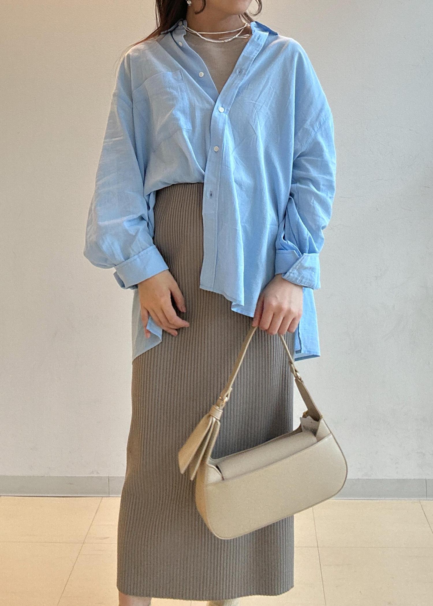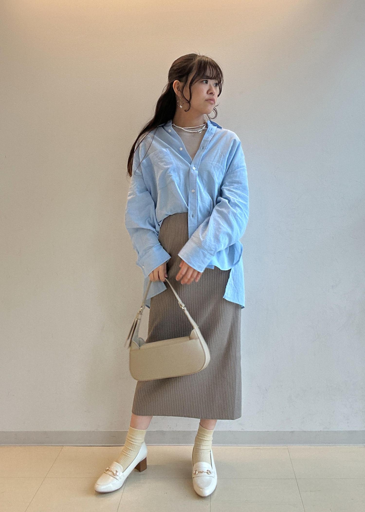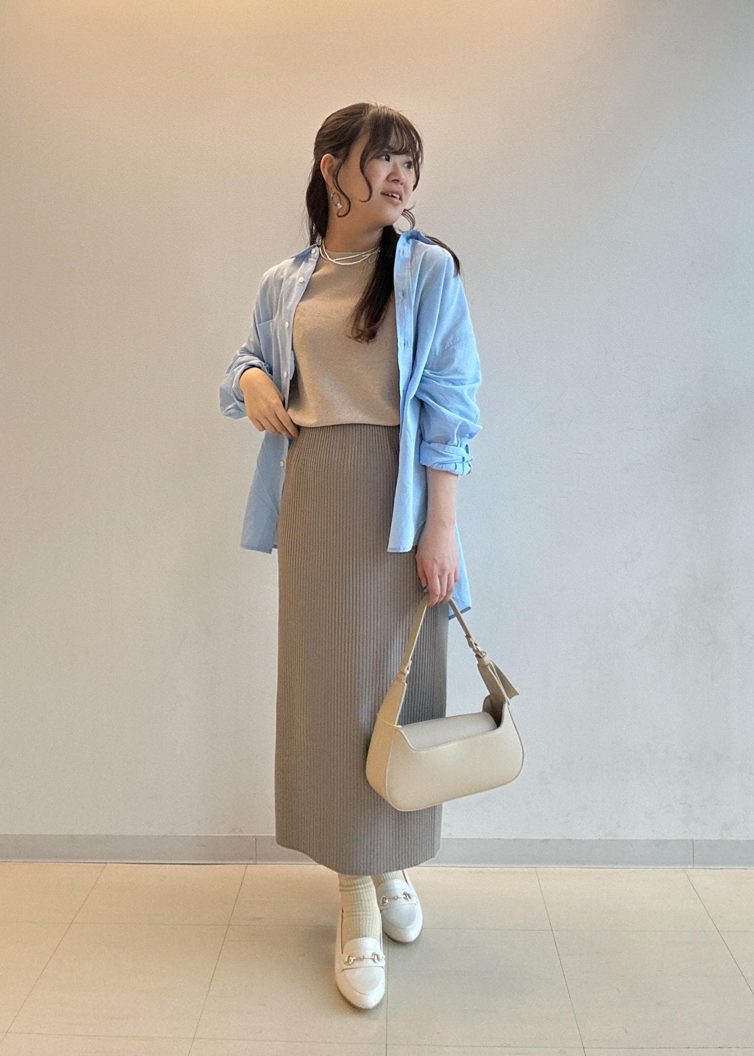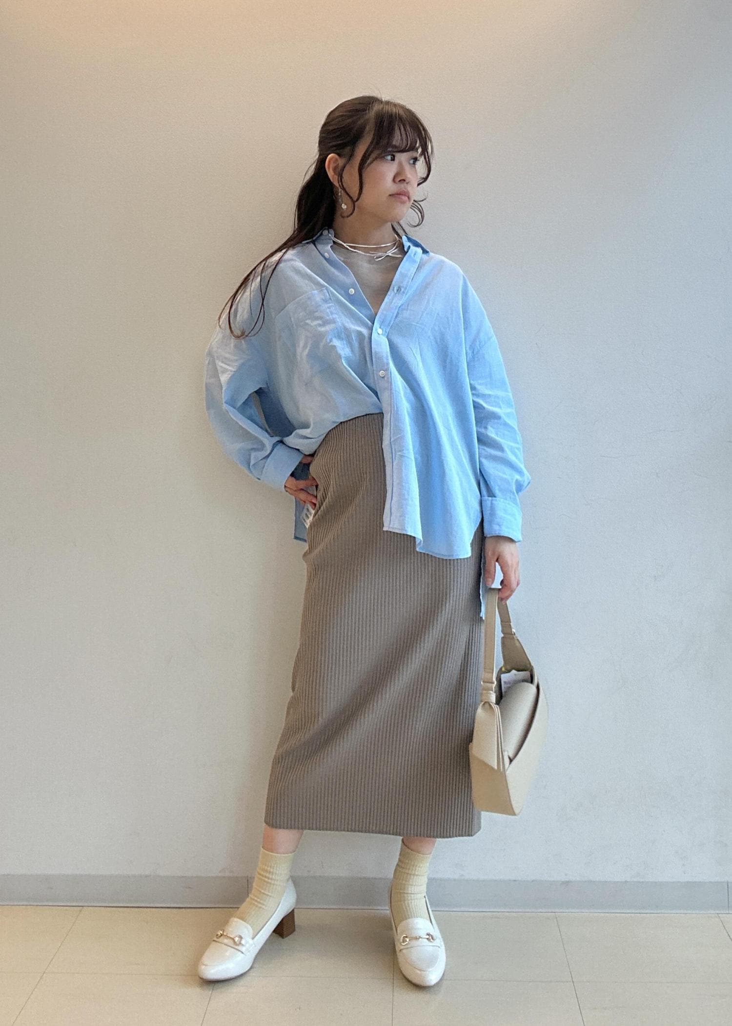 このサックスカラーのシャツがとても春らしく、一気に明るい印象に◎