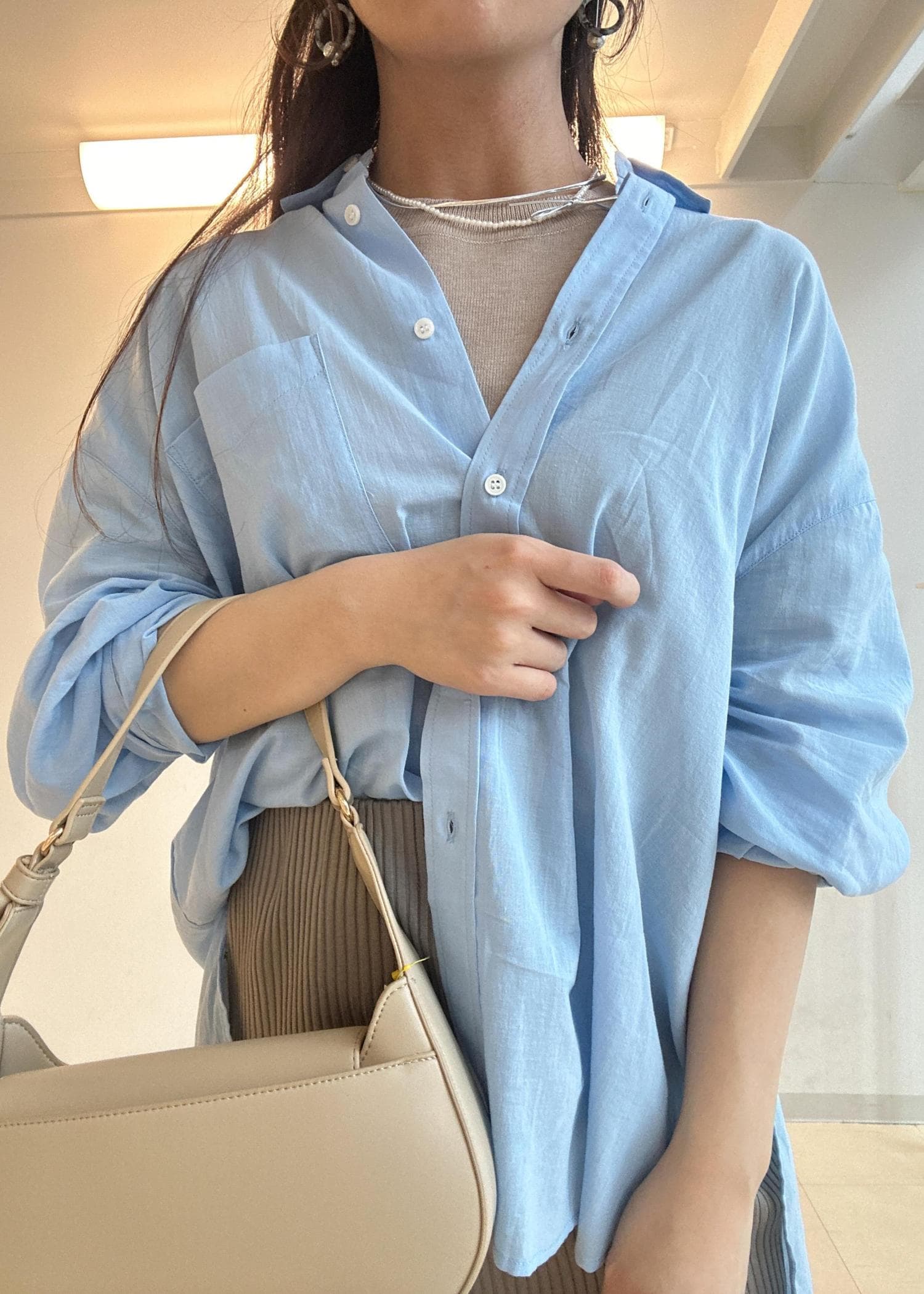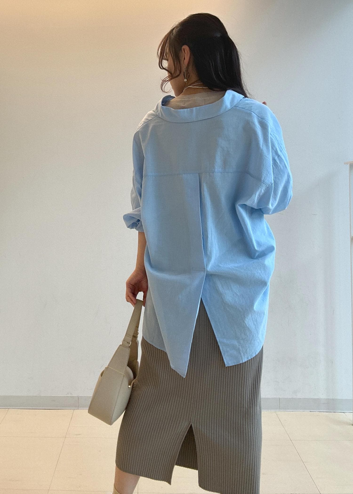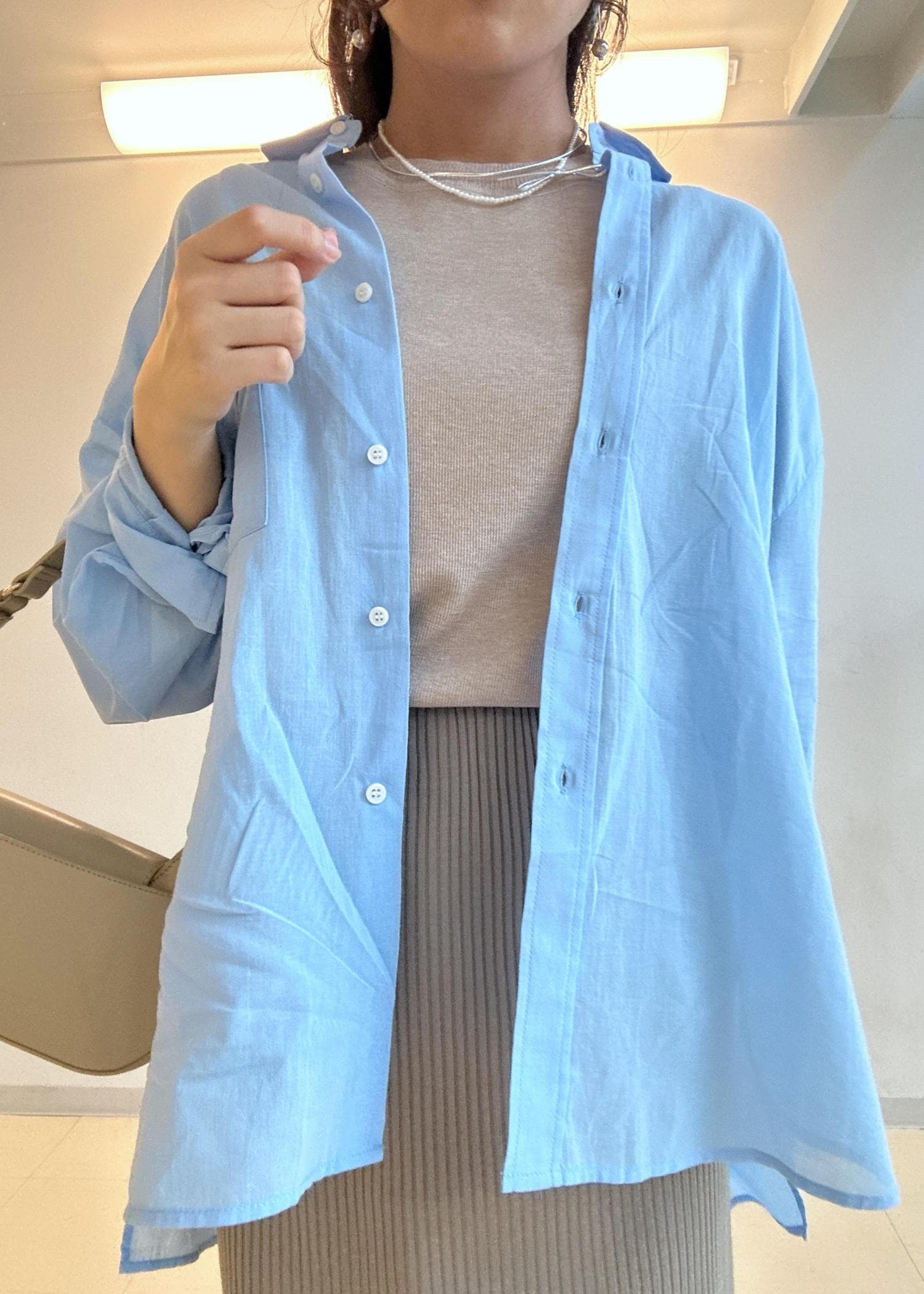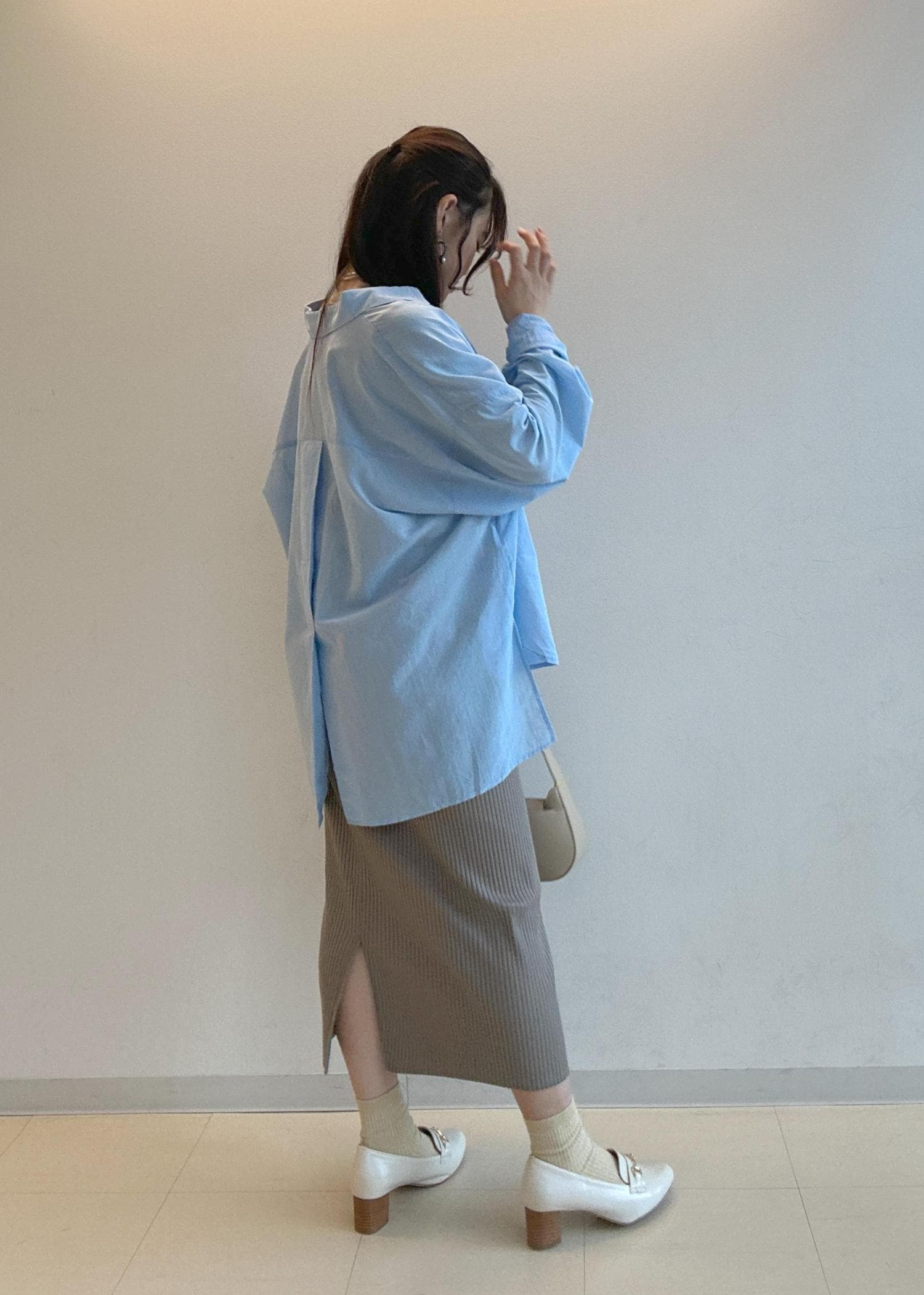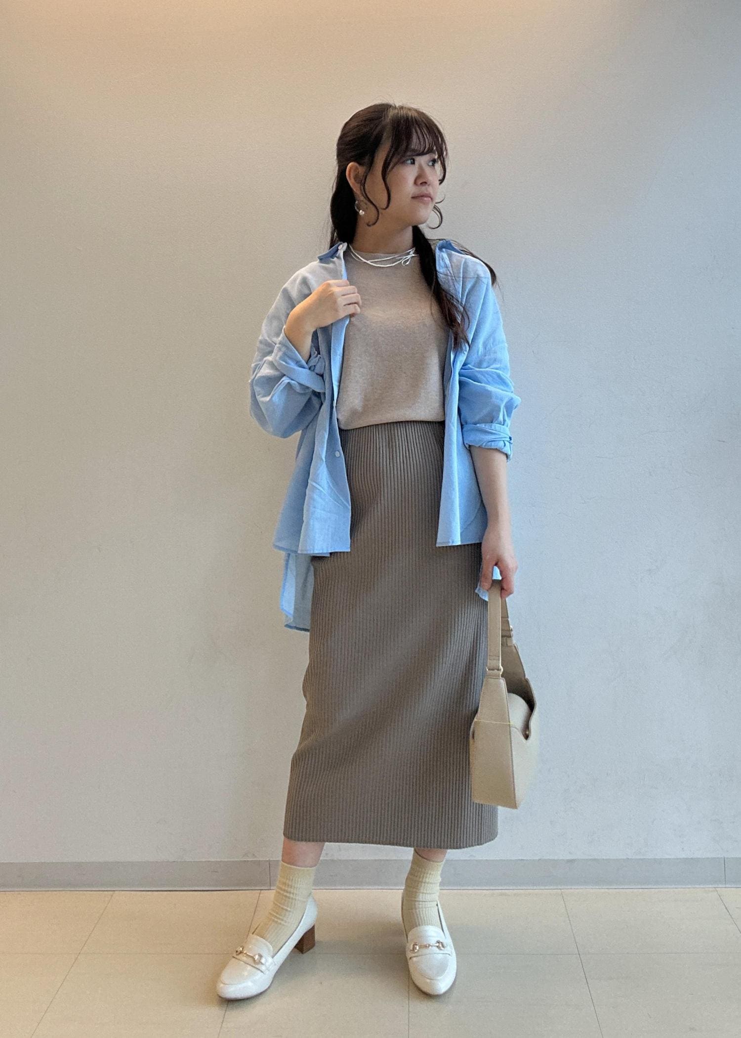 このサックスカラーのシャツがとても春らしく、一気に明るい印象に◎