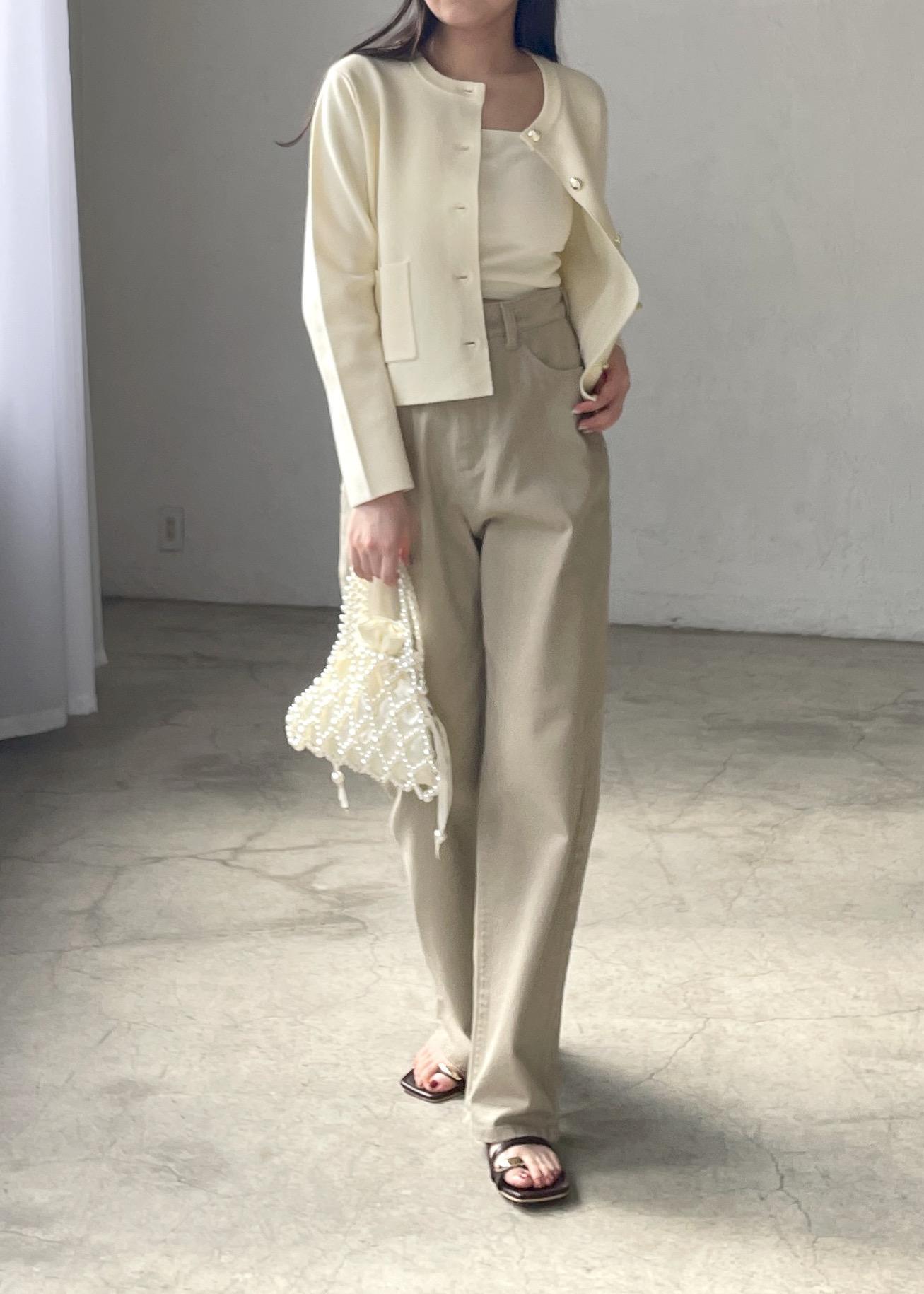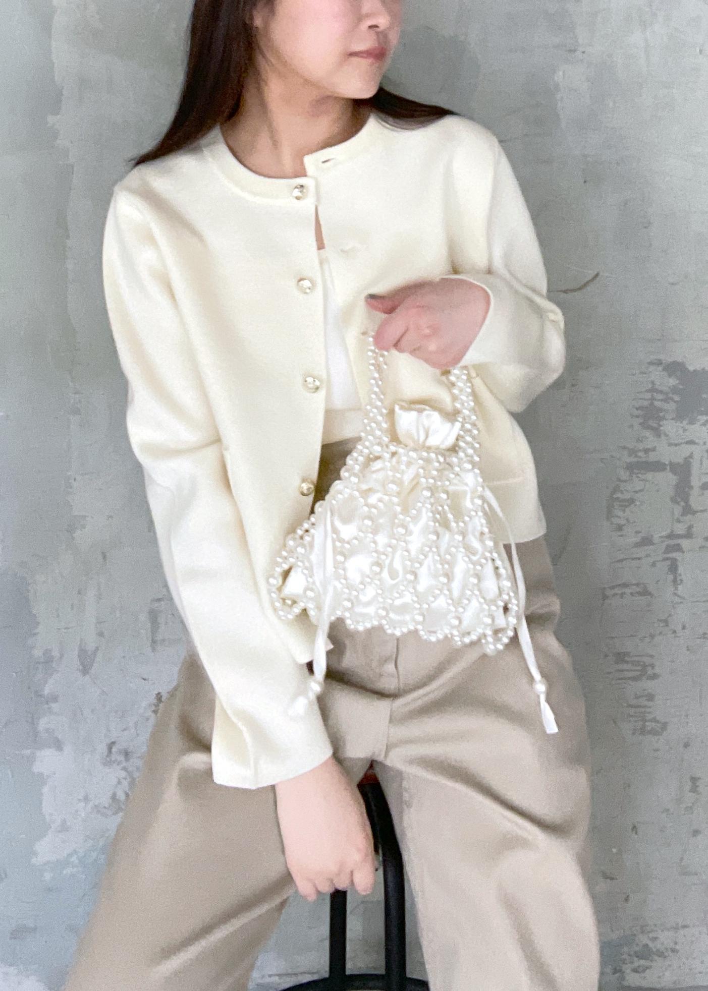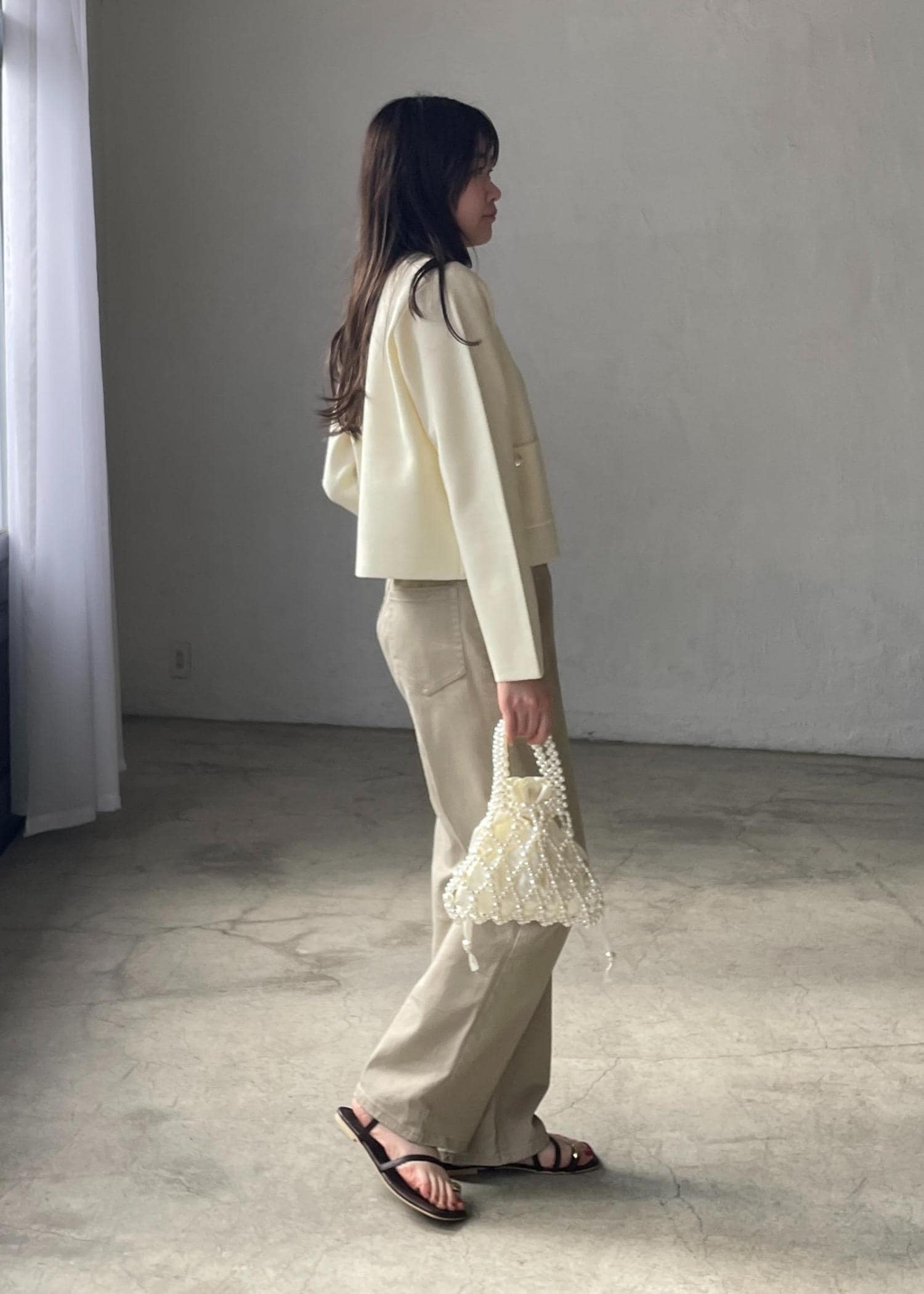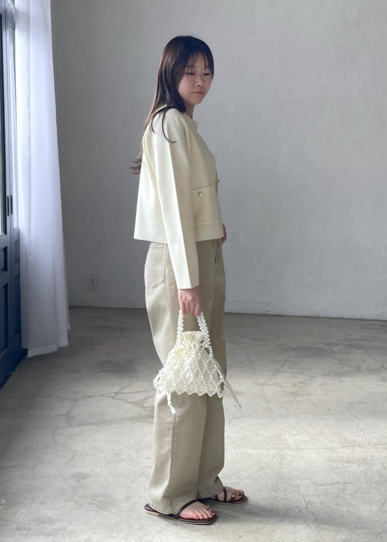 パールのバッグを持つことによって、カジュアルさと上品さのバランスをとりました。