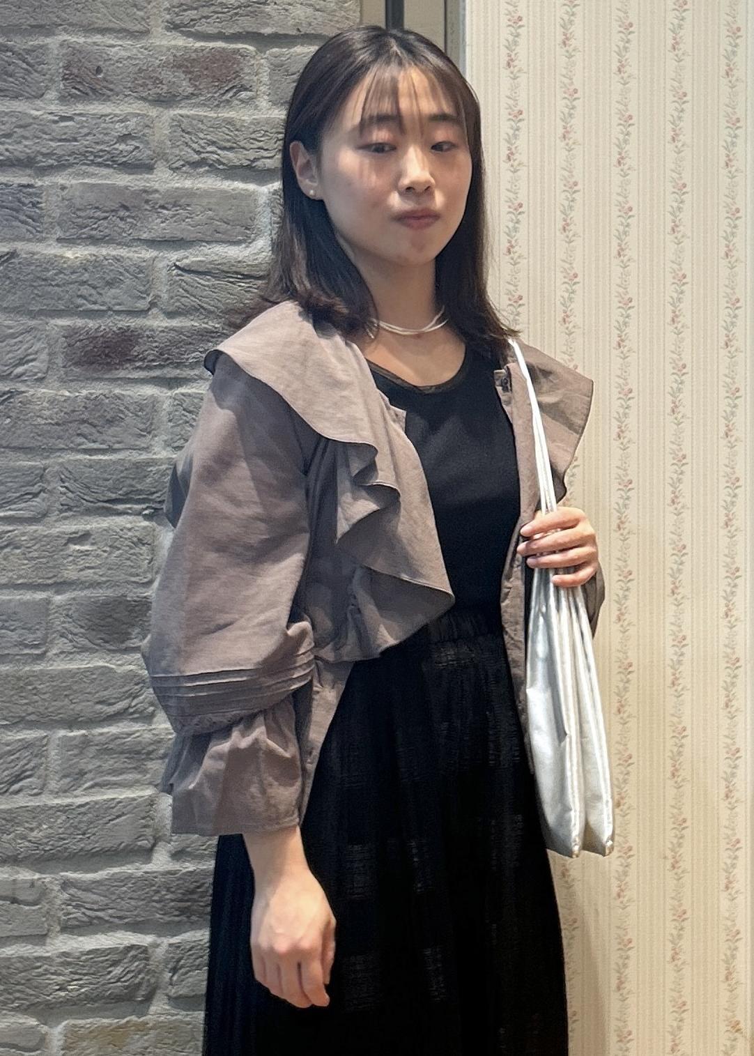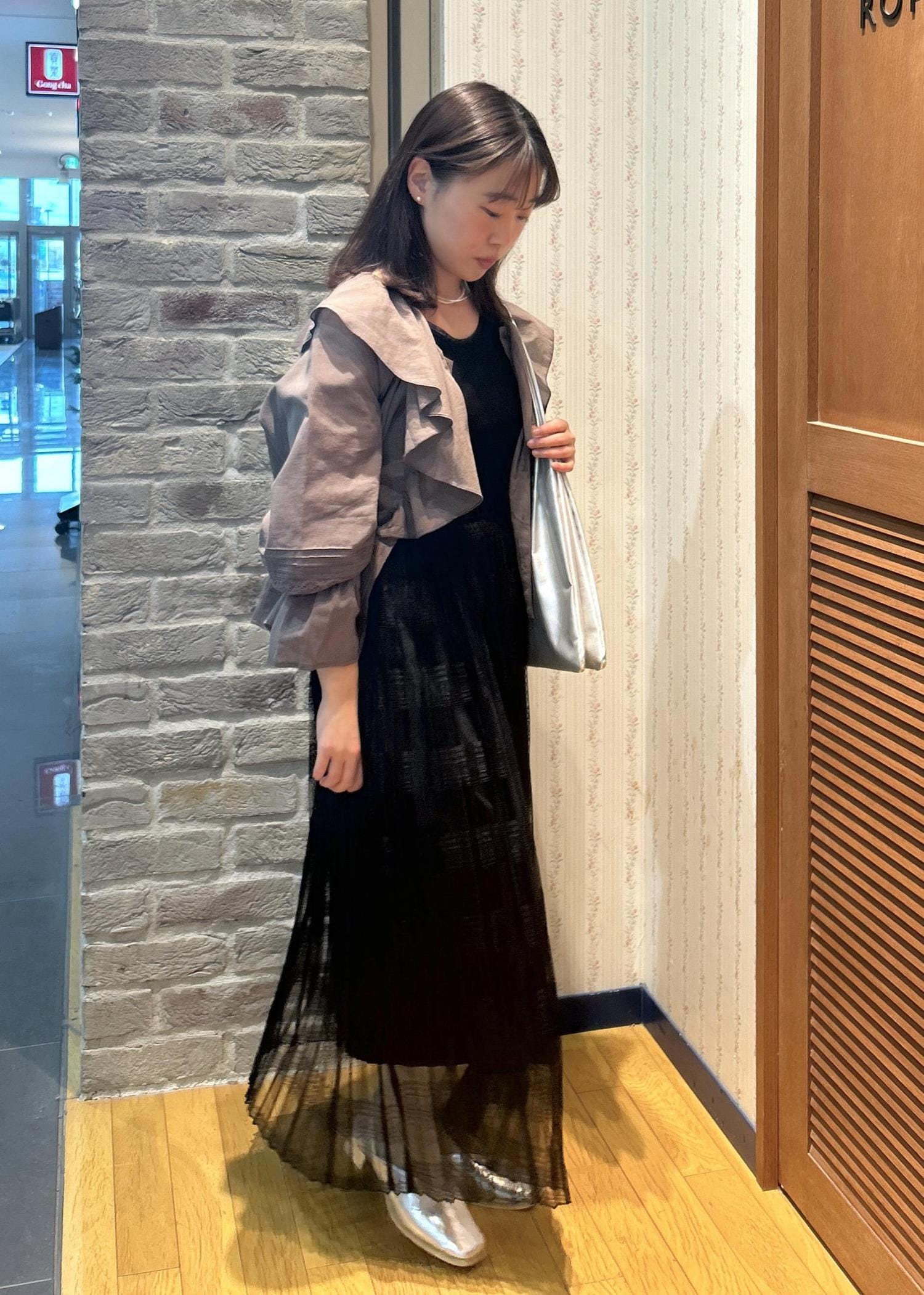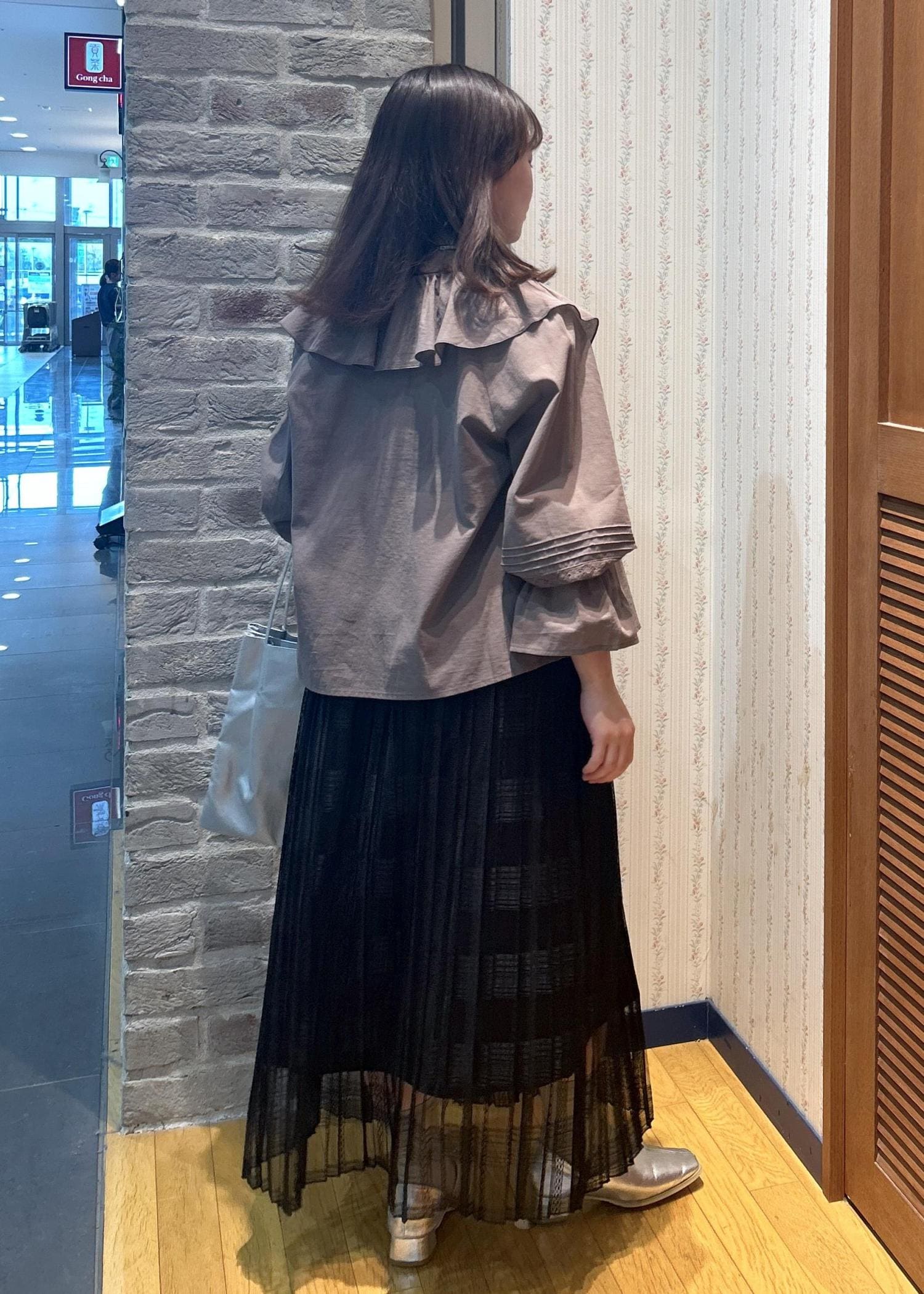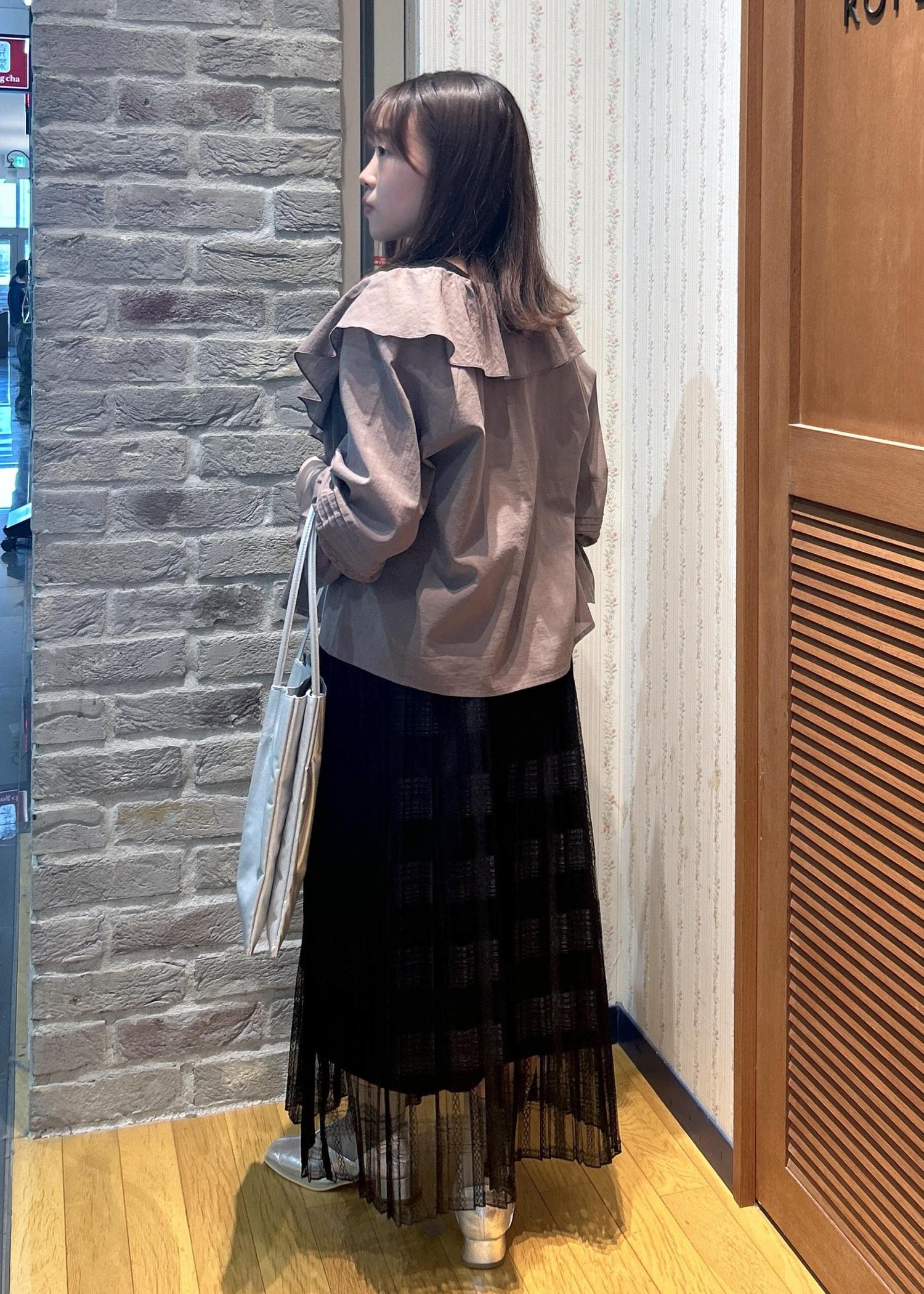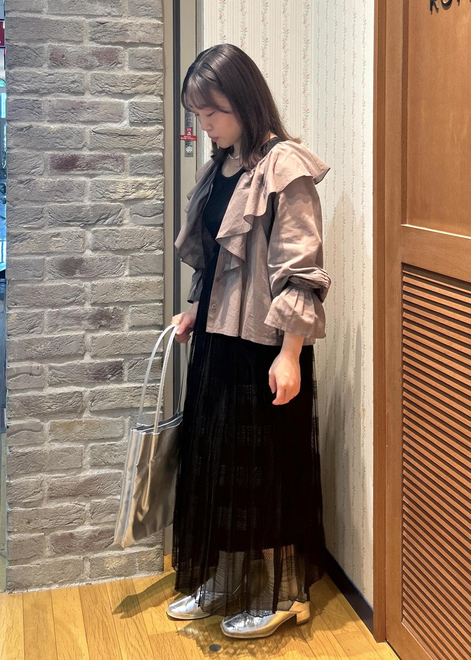ふわっとかわいいフリルブラウスは、ブラックやシルバーの大人っぽいアイテムと組み合わせて、甘すぎないモード寄りなスタイルにしてみました!