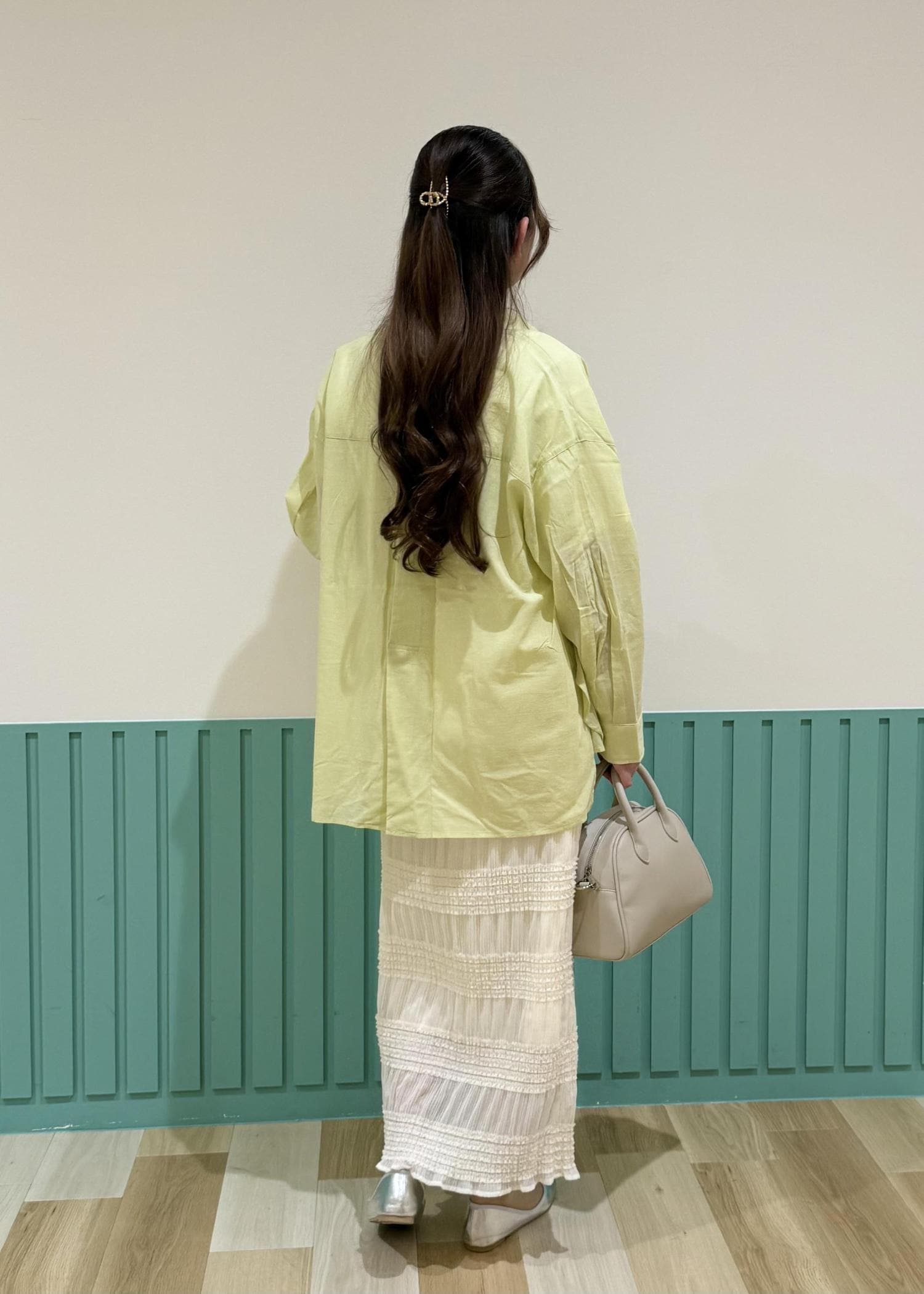 今回は大人気の綿ボイルバックタックシャツを使って爽やかな春カラーコーデを組んでみました。