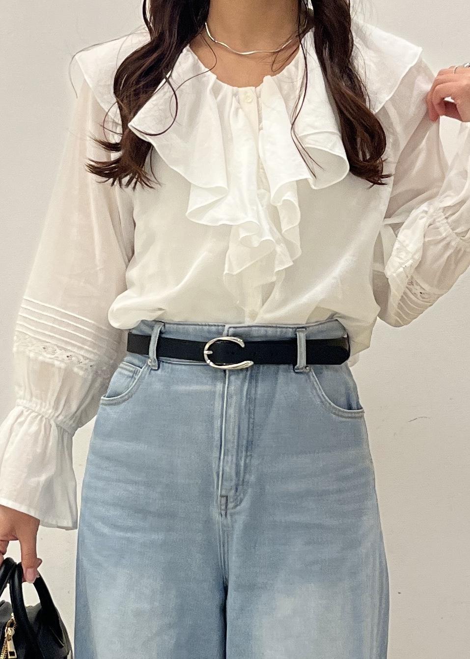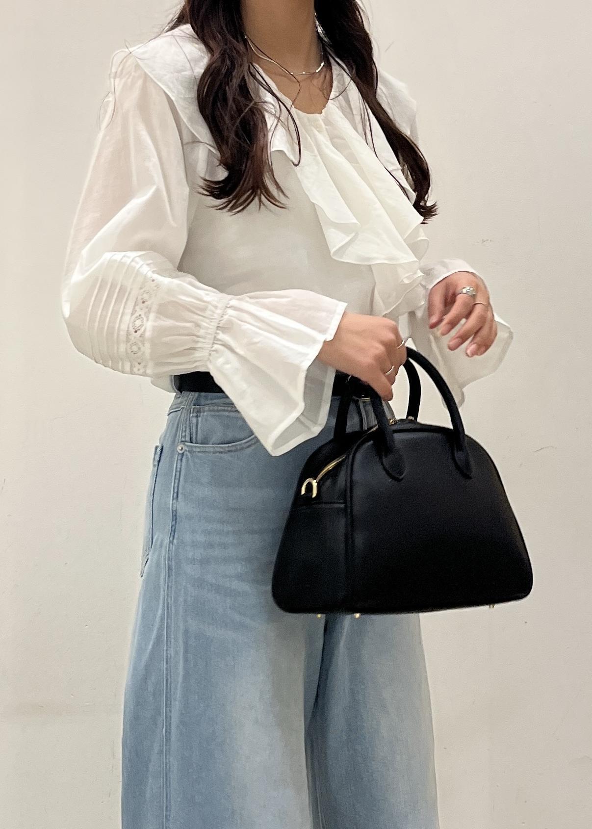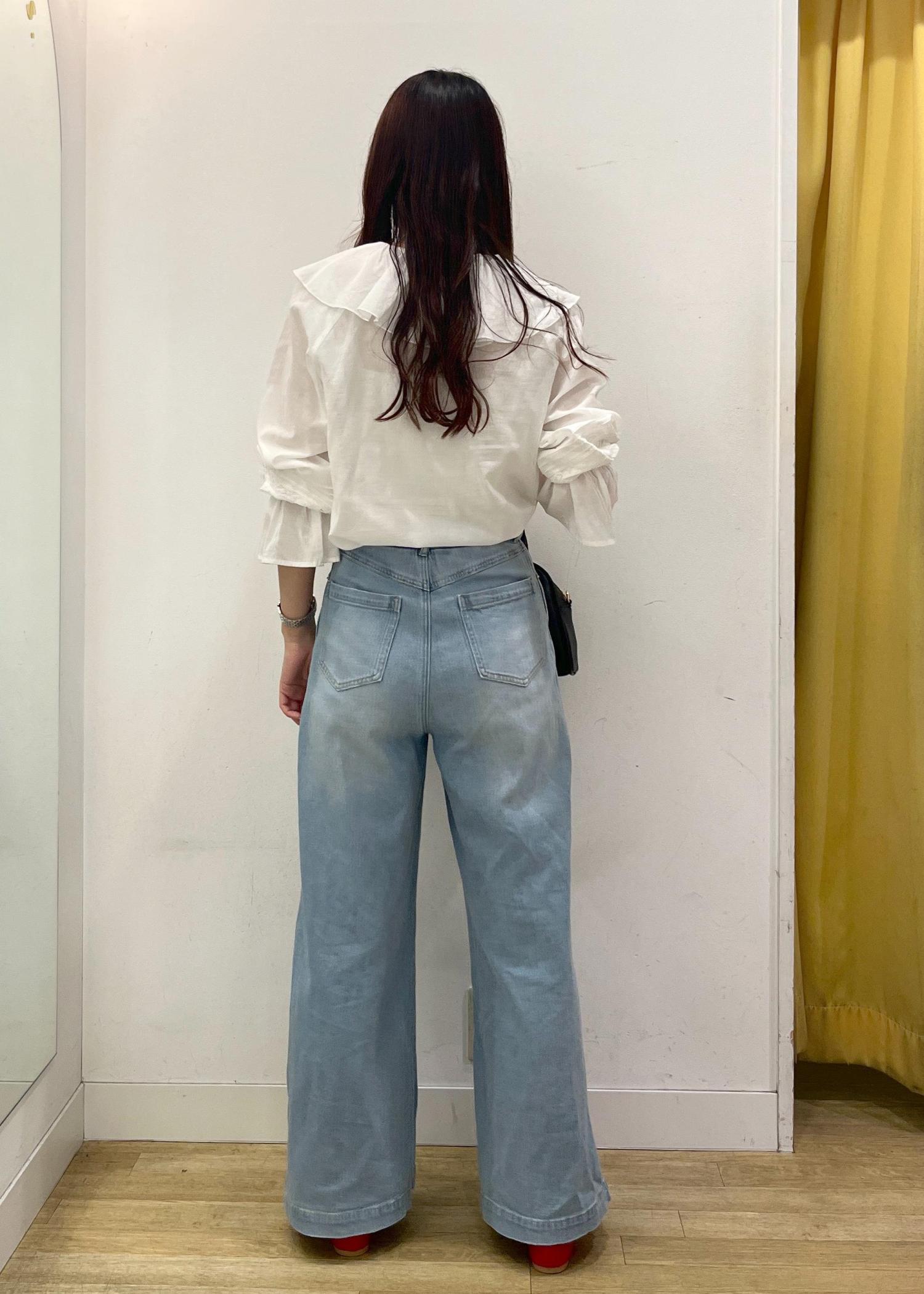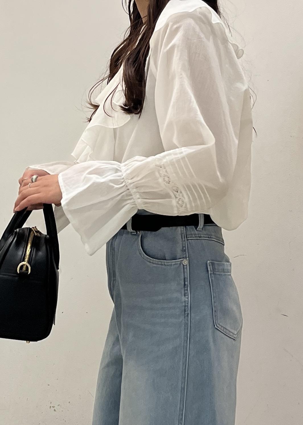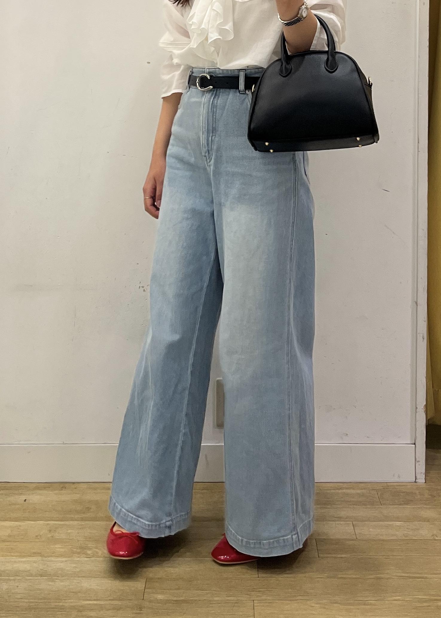 お出かけにオススメのコーディネートです♪フリルブラウスでガーリーな印象ですが、ボトムをデニムで合わせてカジュアル感もプラスしたコーデになっています♪アクセントに足元を赤で合わせています♪