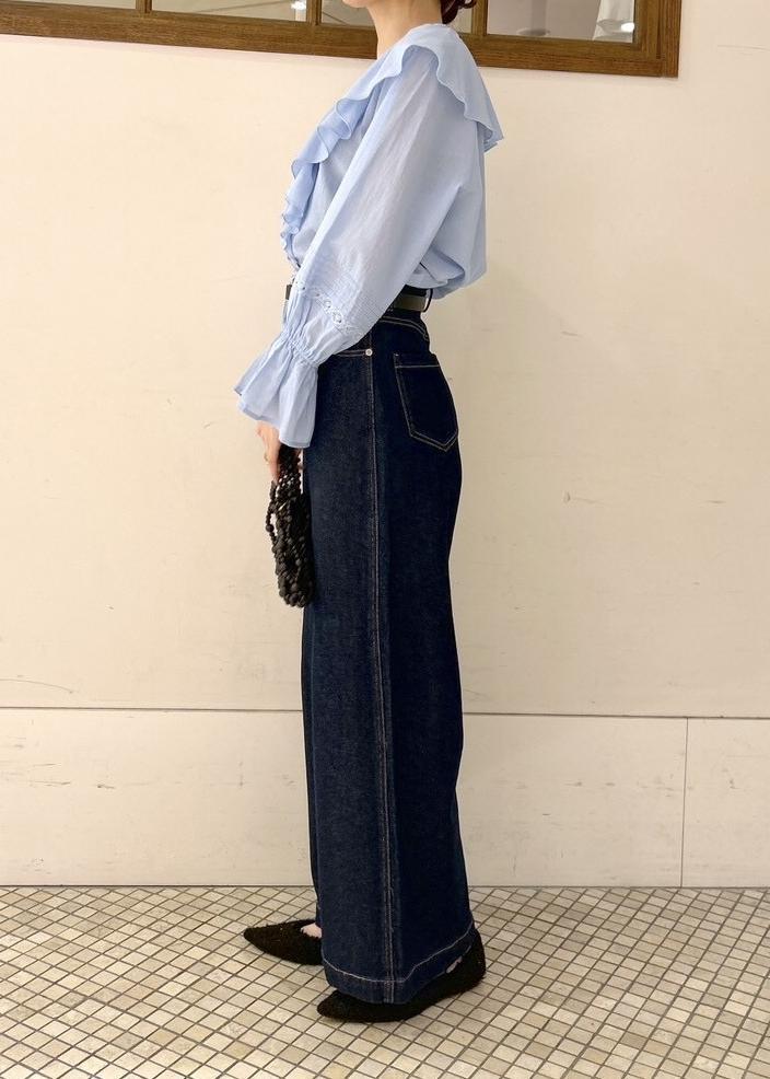 甘めのフリルブラウスをデニムでカジュアルダウンしたスタイル♪