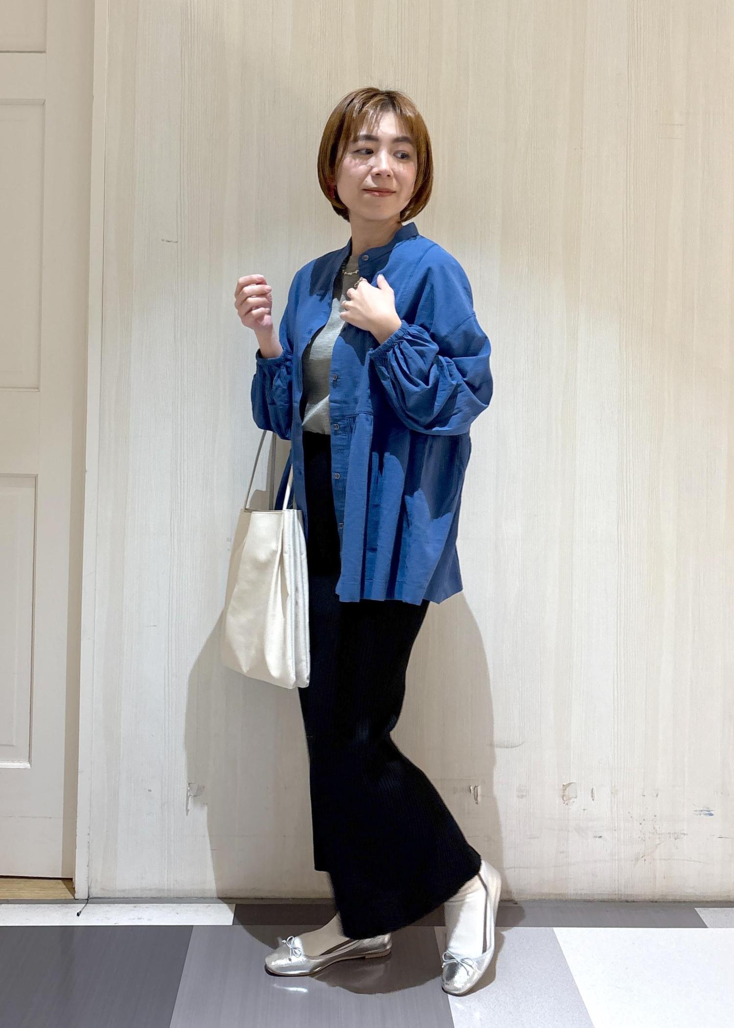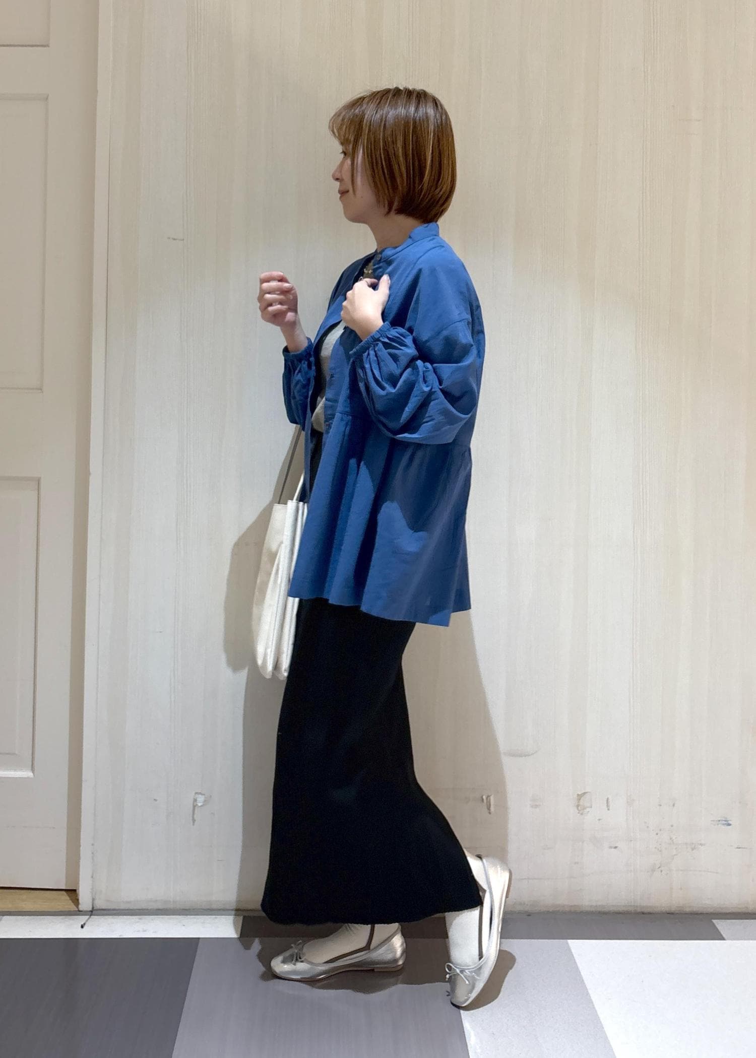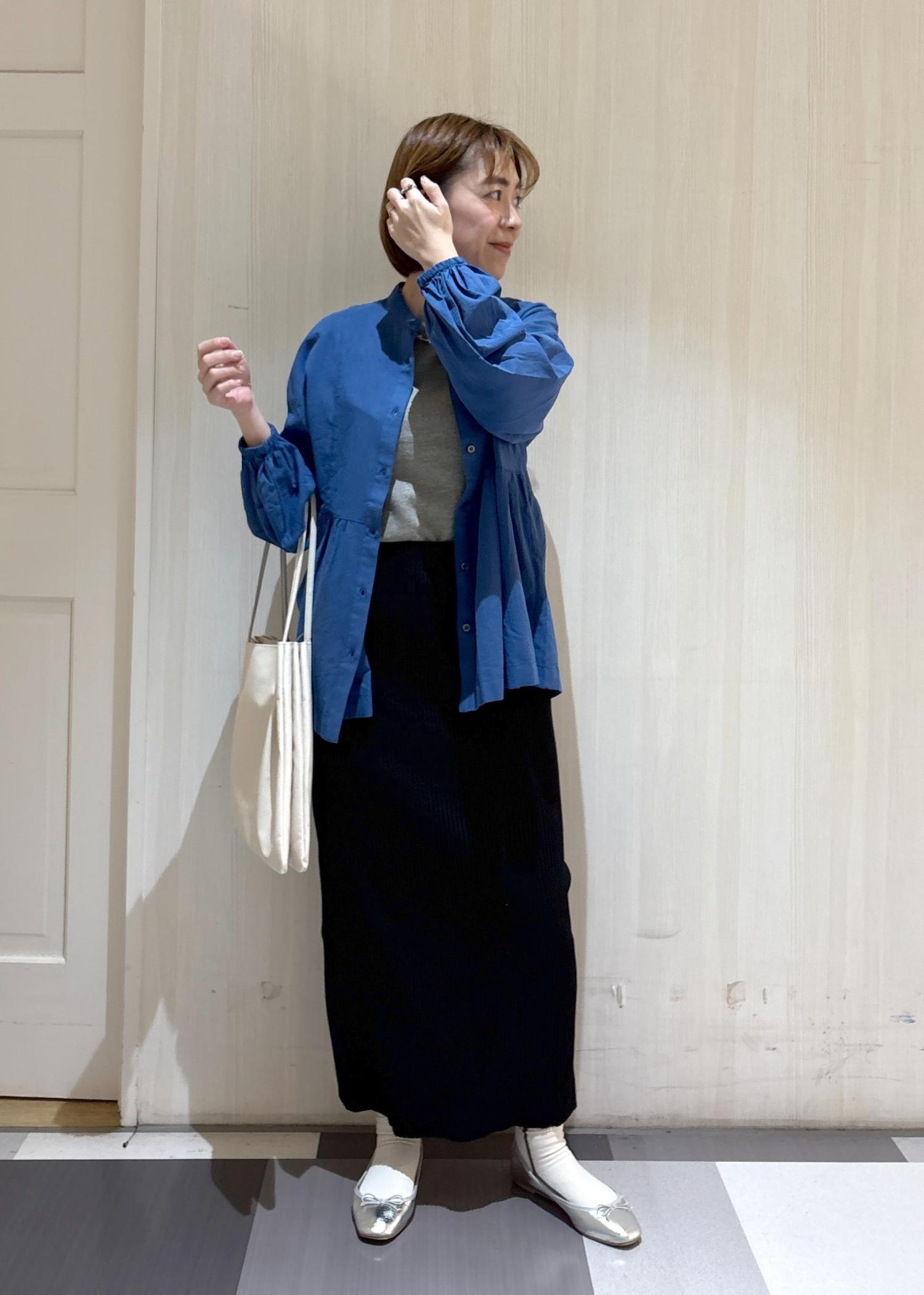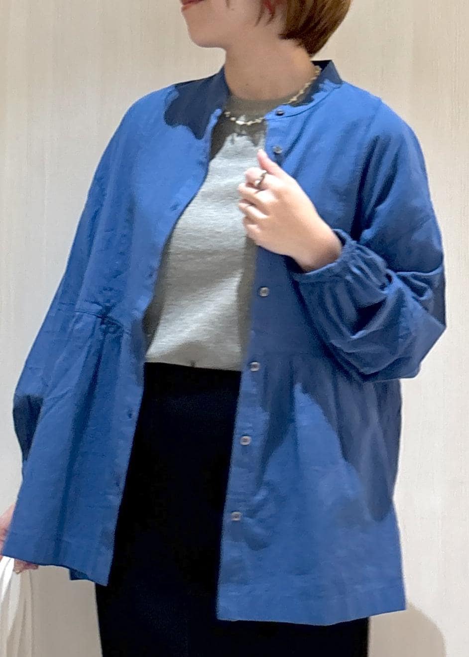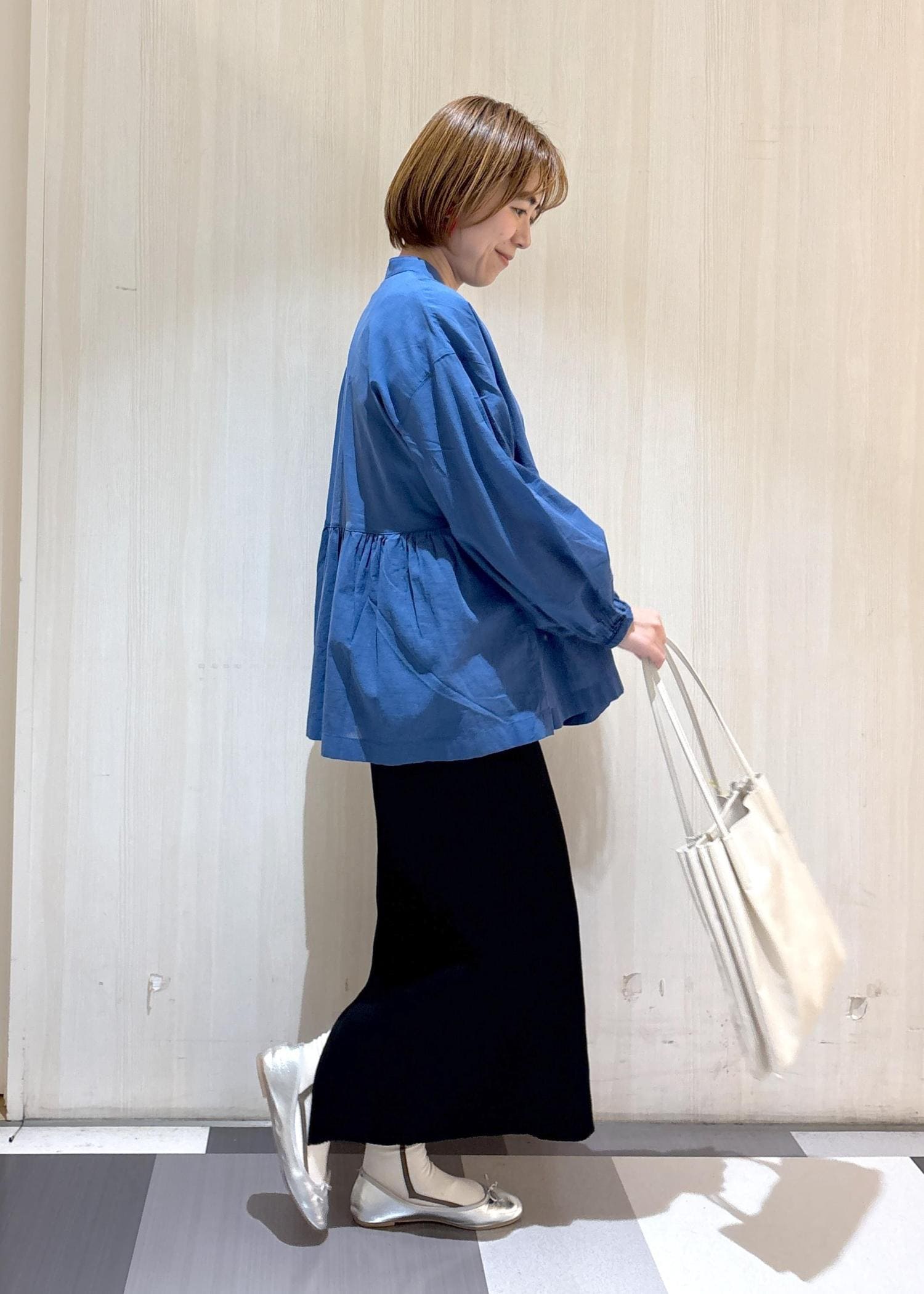 コンフォートブラウスのペプラムギャザータイプは、デザインがや素材の風合いが甘めなので、その分中性的なブルーをチョイスしました。