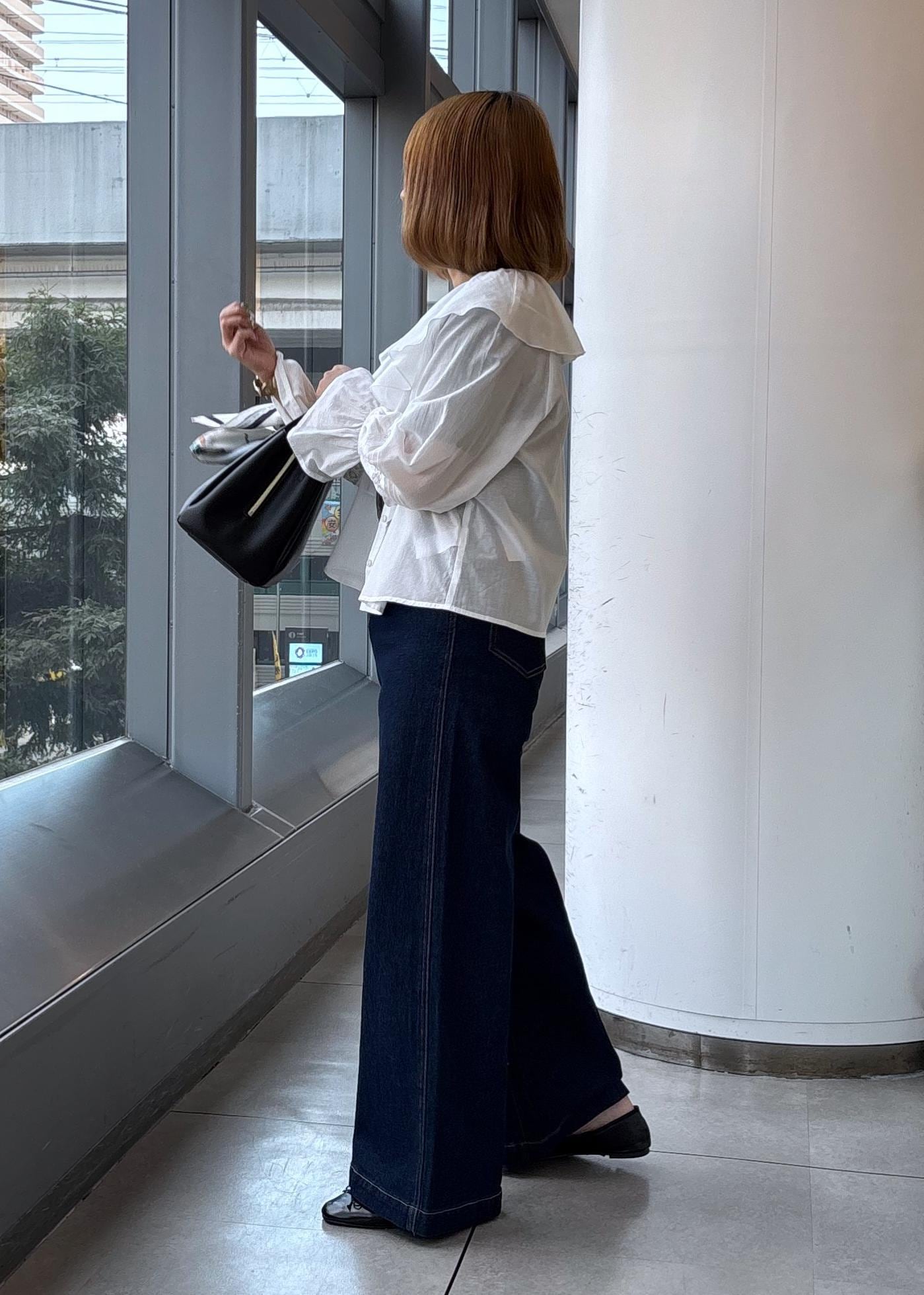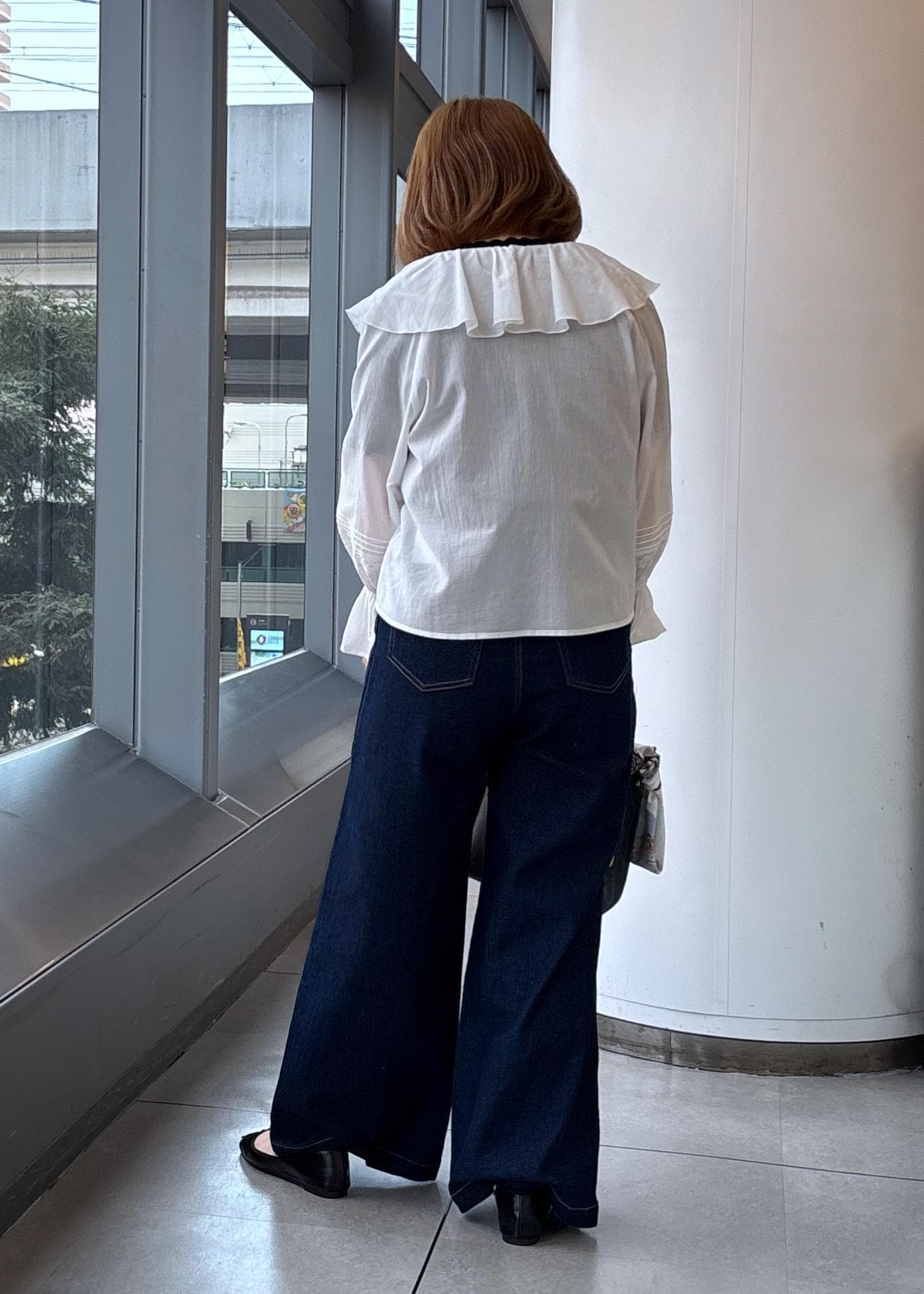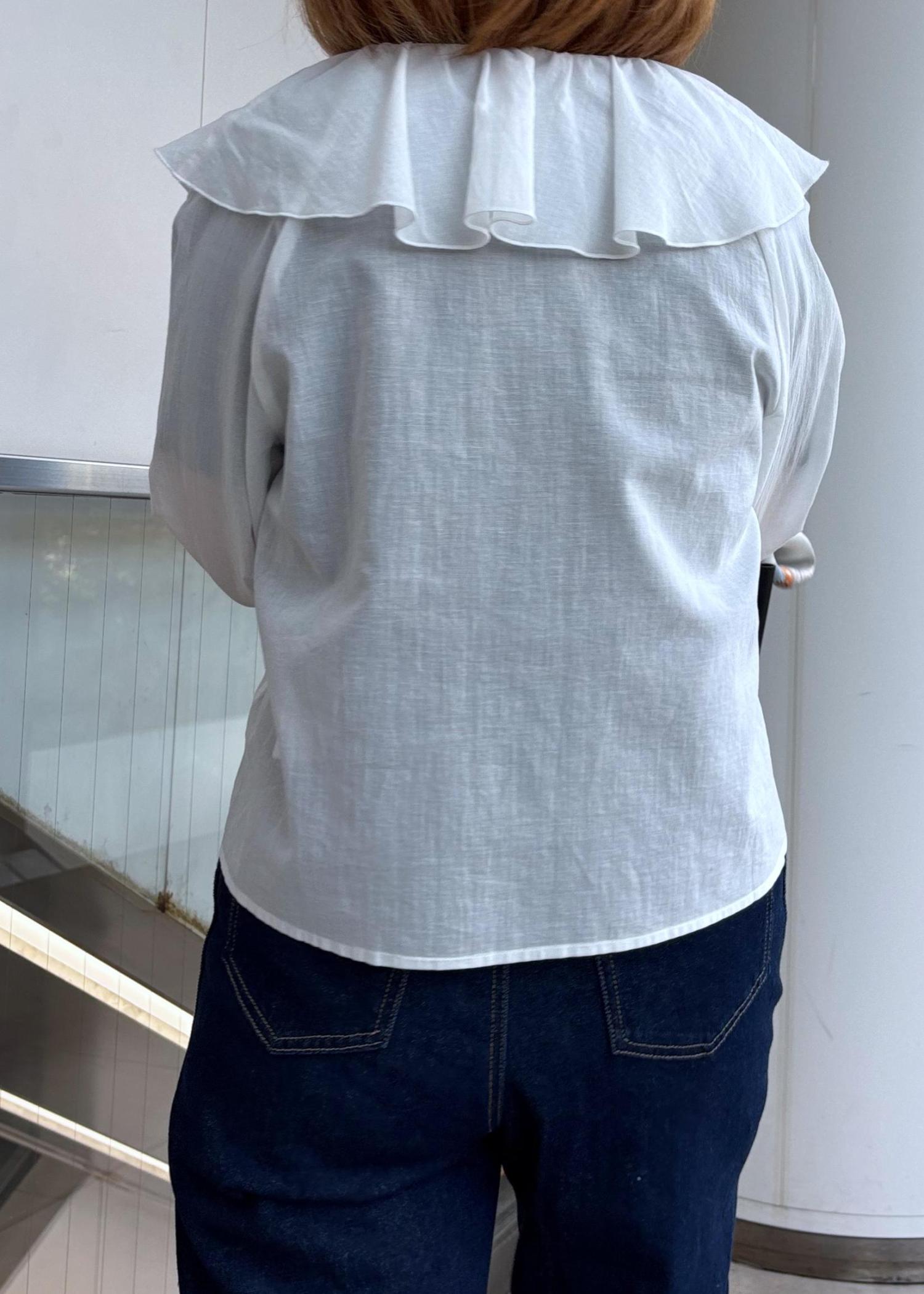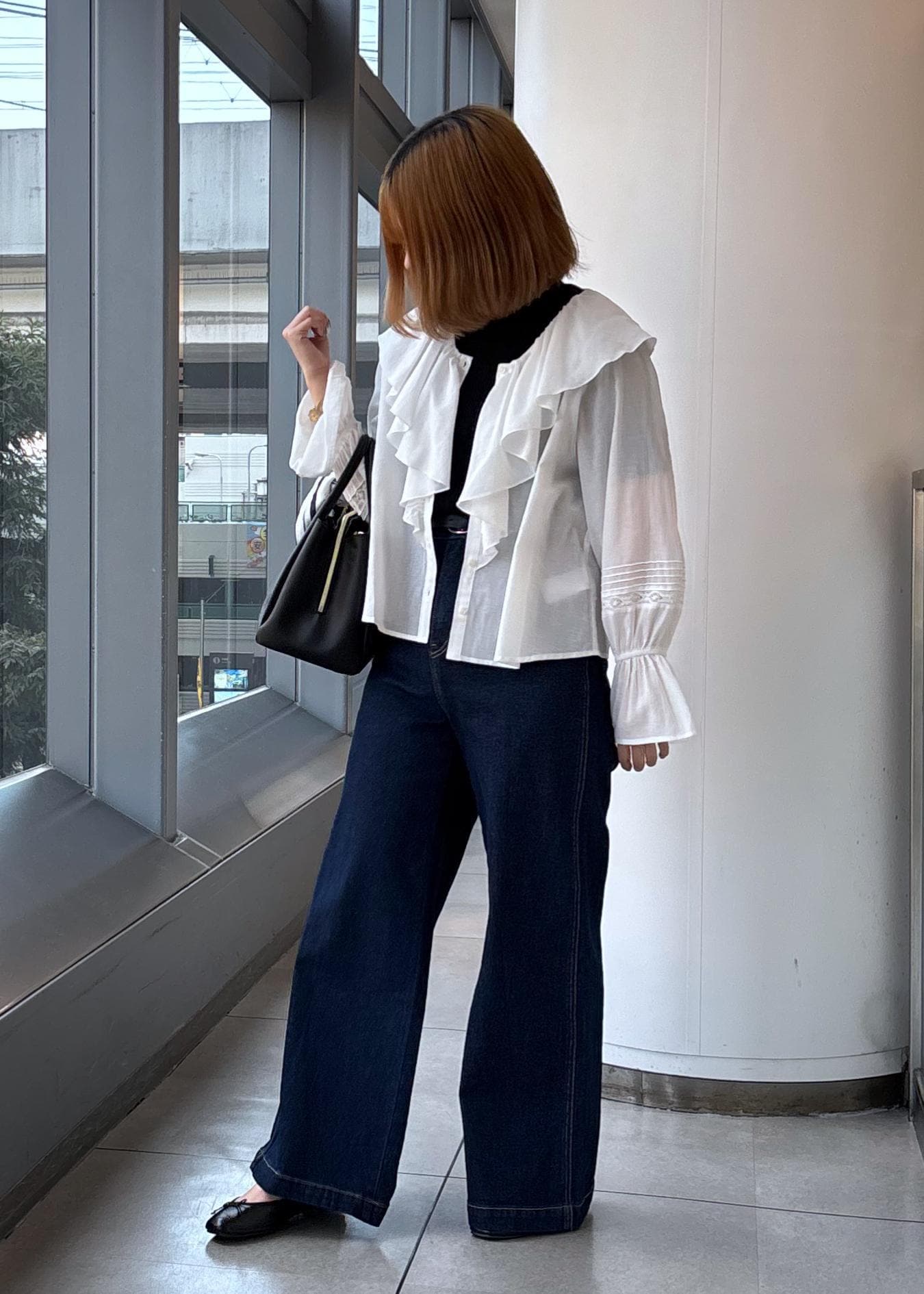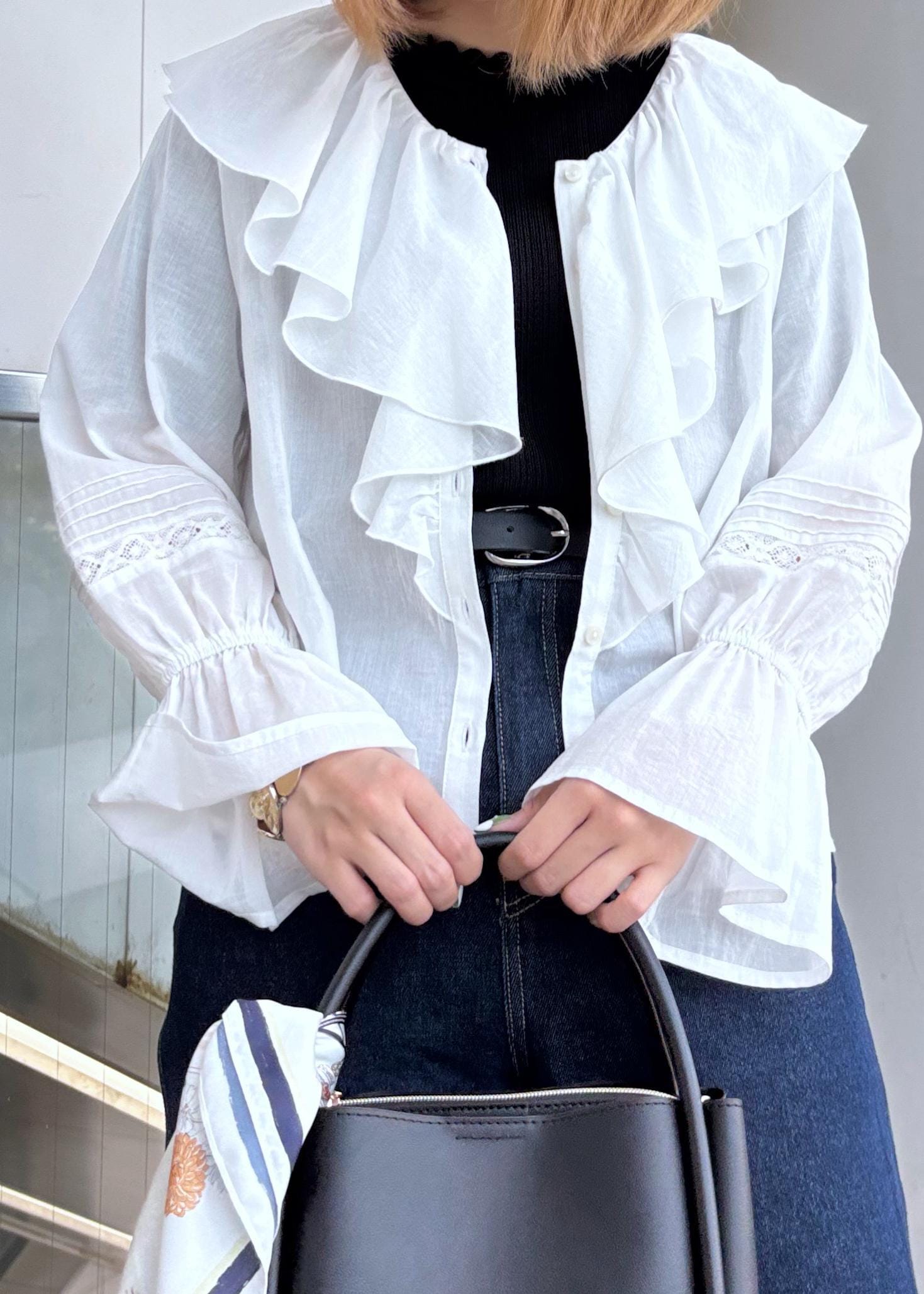 ブラウスは首周りの大きなフリルが特徴的な、程よい透け感で甘すぎない程よい可愛さのある一枚です。