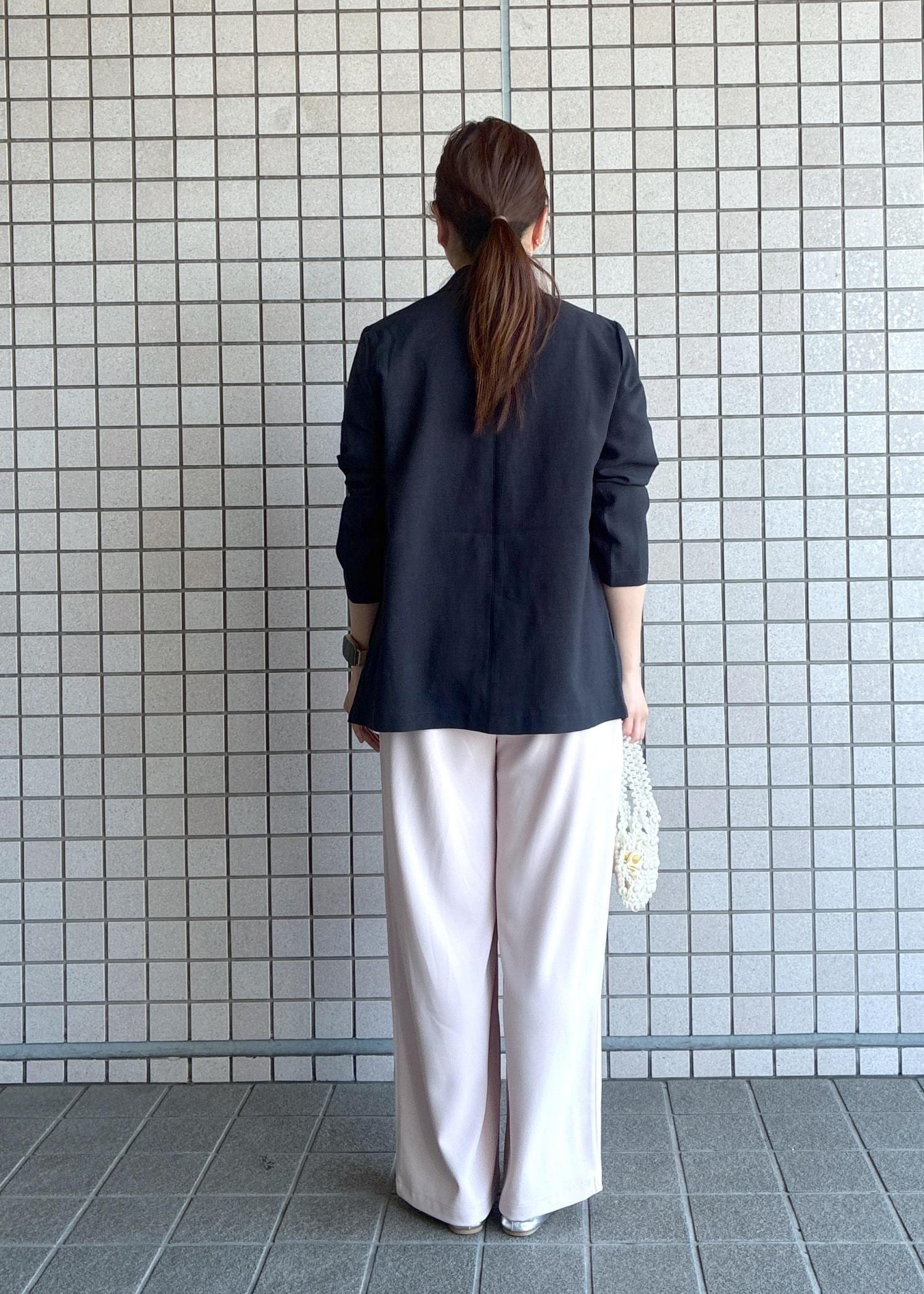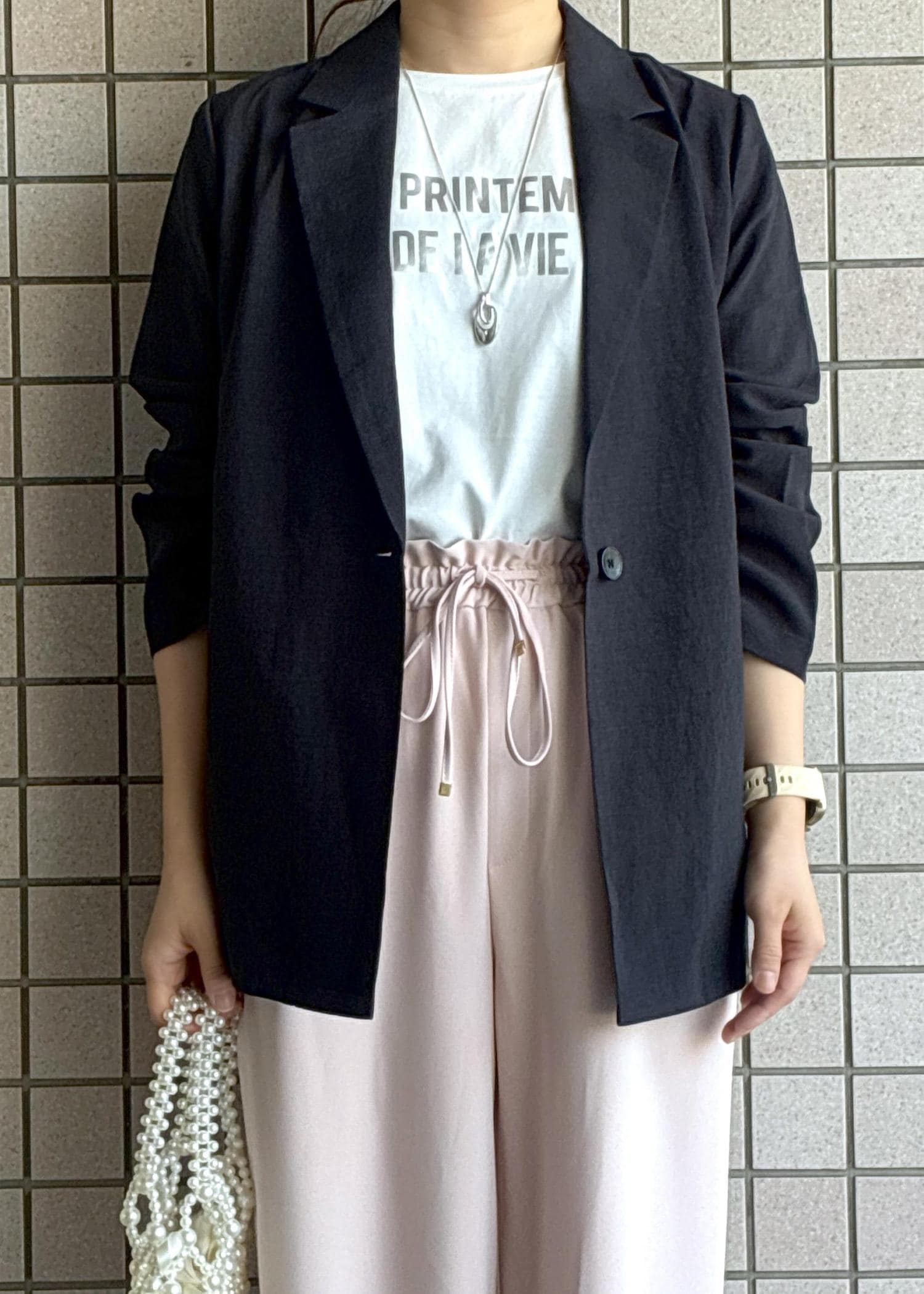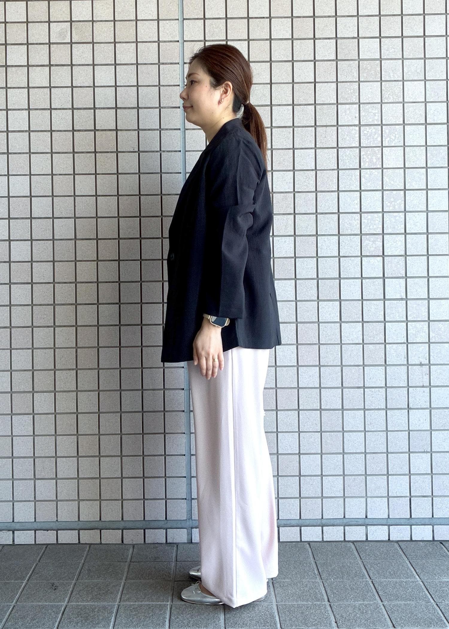 ジャケットできちんともあり、カラーしパンツで抜け感をだしてます。