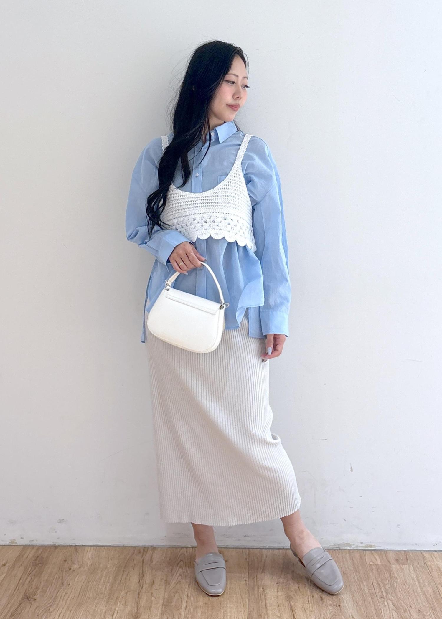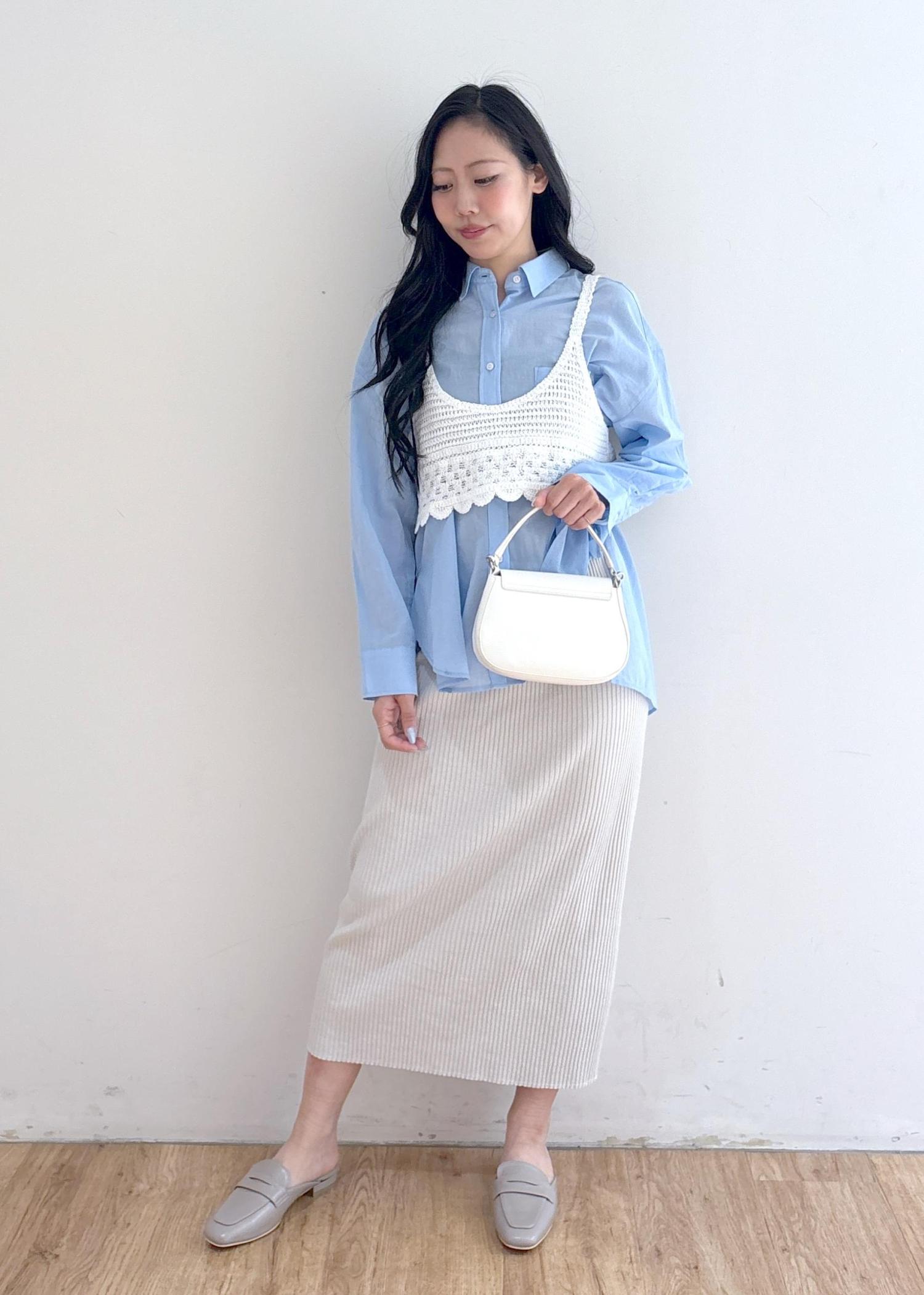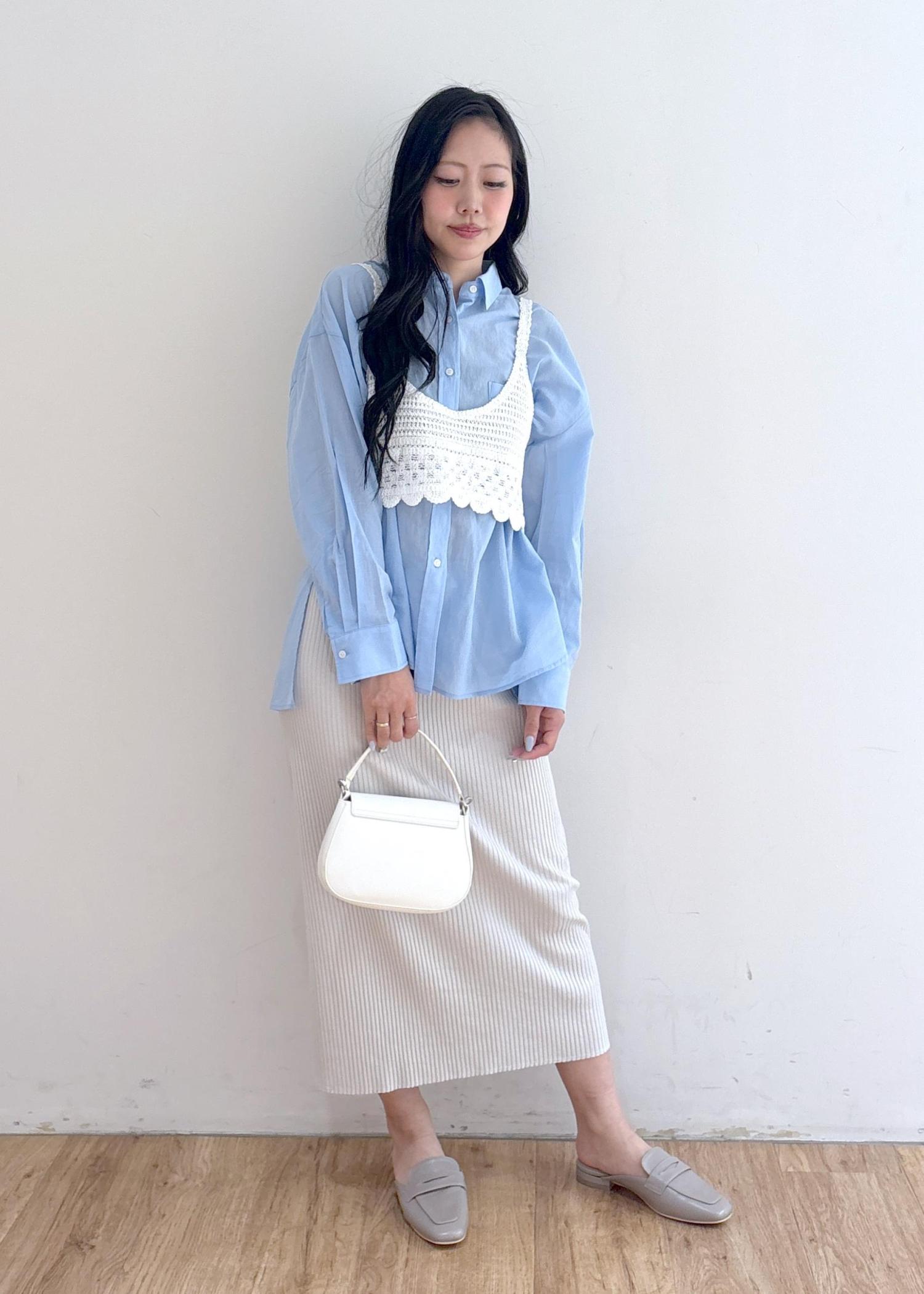 Iラインのスカートとローファーミュールを合わせて上品さを取り入れつつ、ビスチェをレイヤードしてトレンド感もあるコーディネートにしてみました!