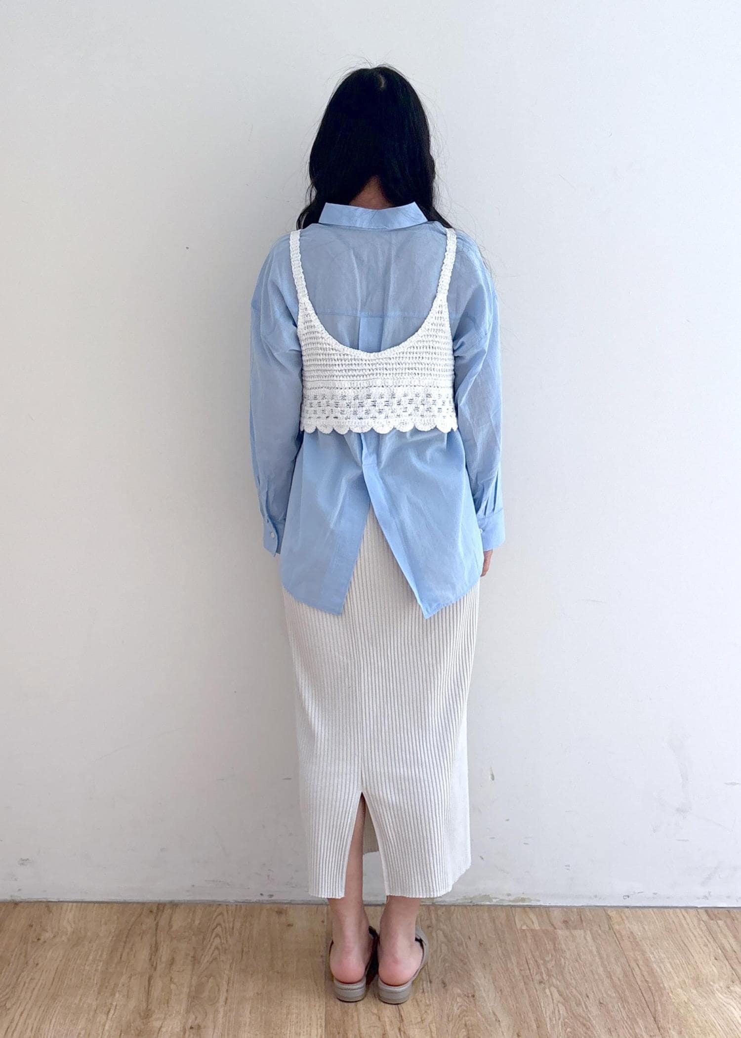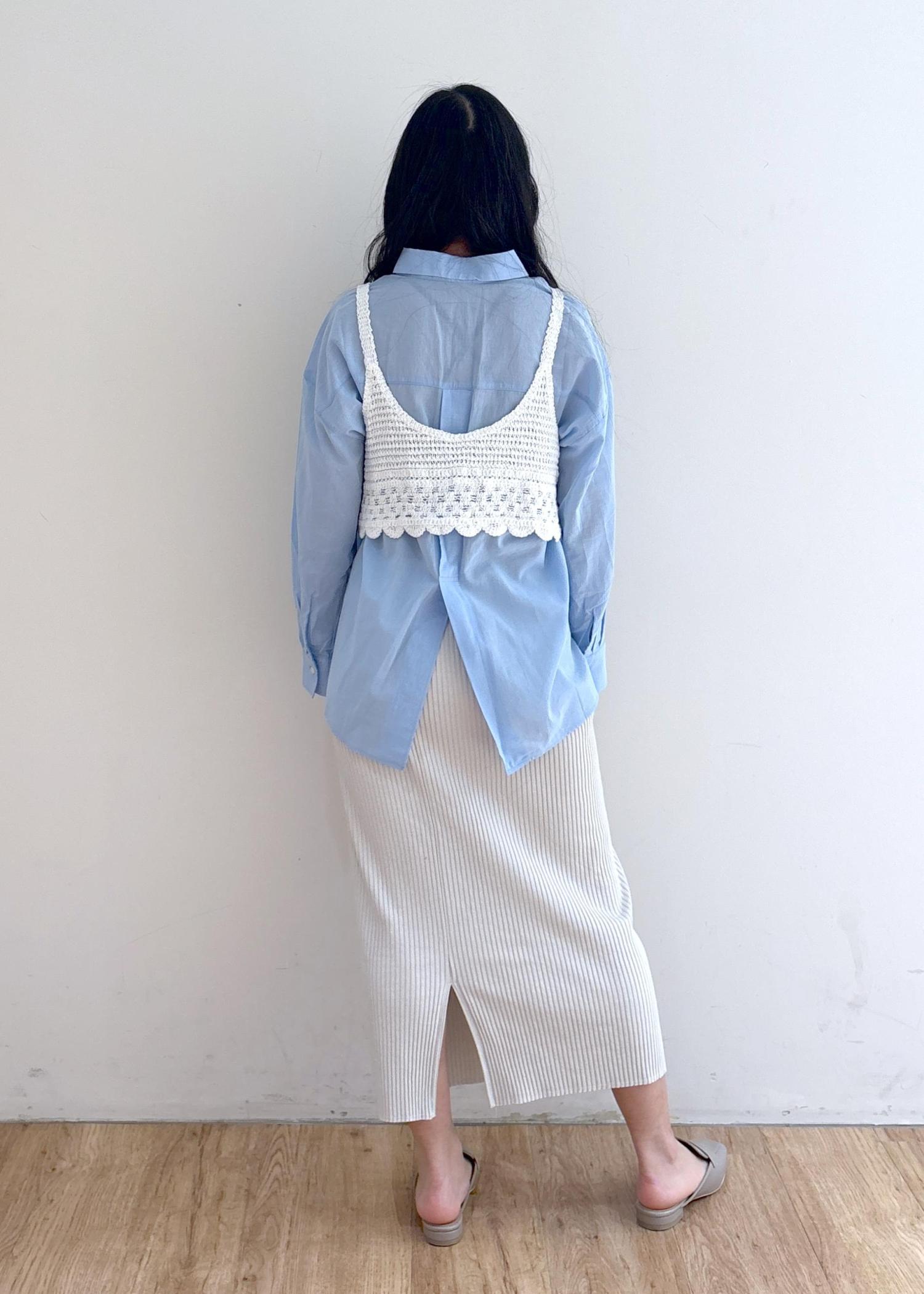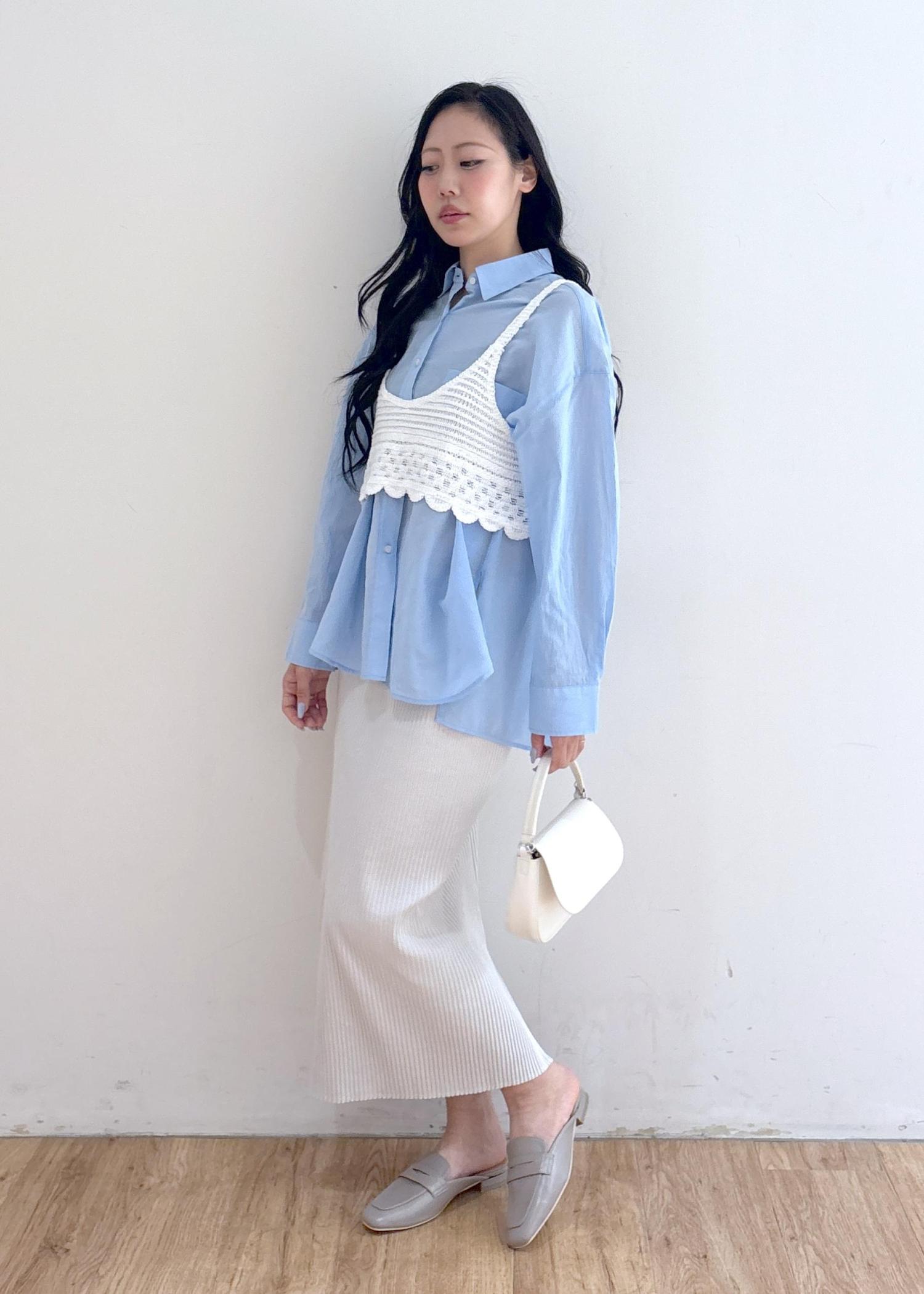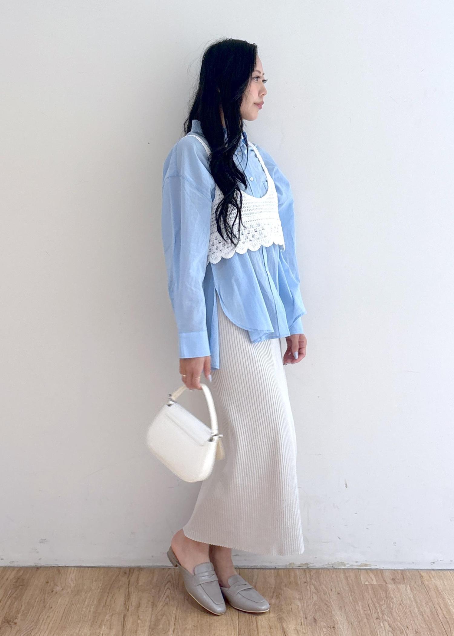 Iラインのスカートとローファーミュールを合わせて上品さを取り入れつつ、ビスチェをレイヤードしてトレンド感もあるコーディネートにしてみました!