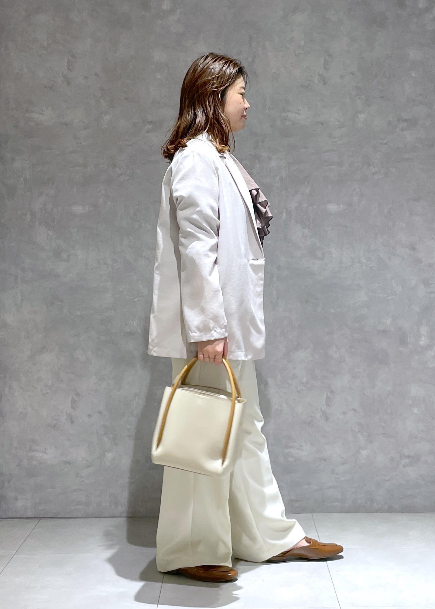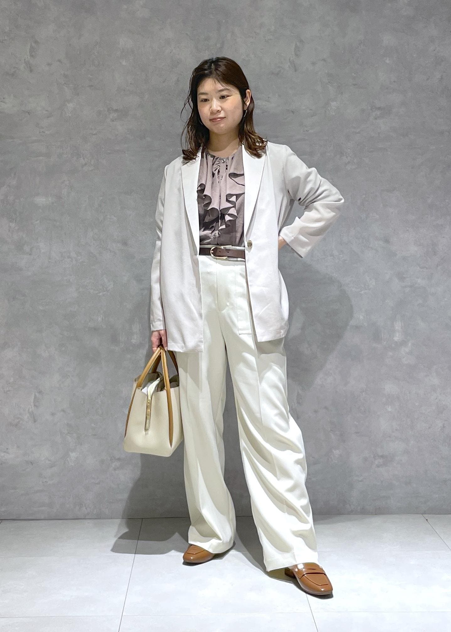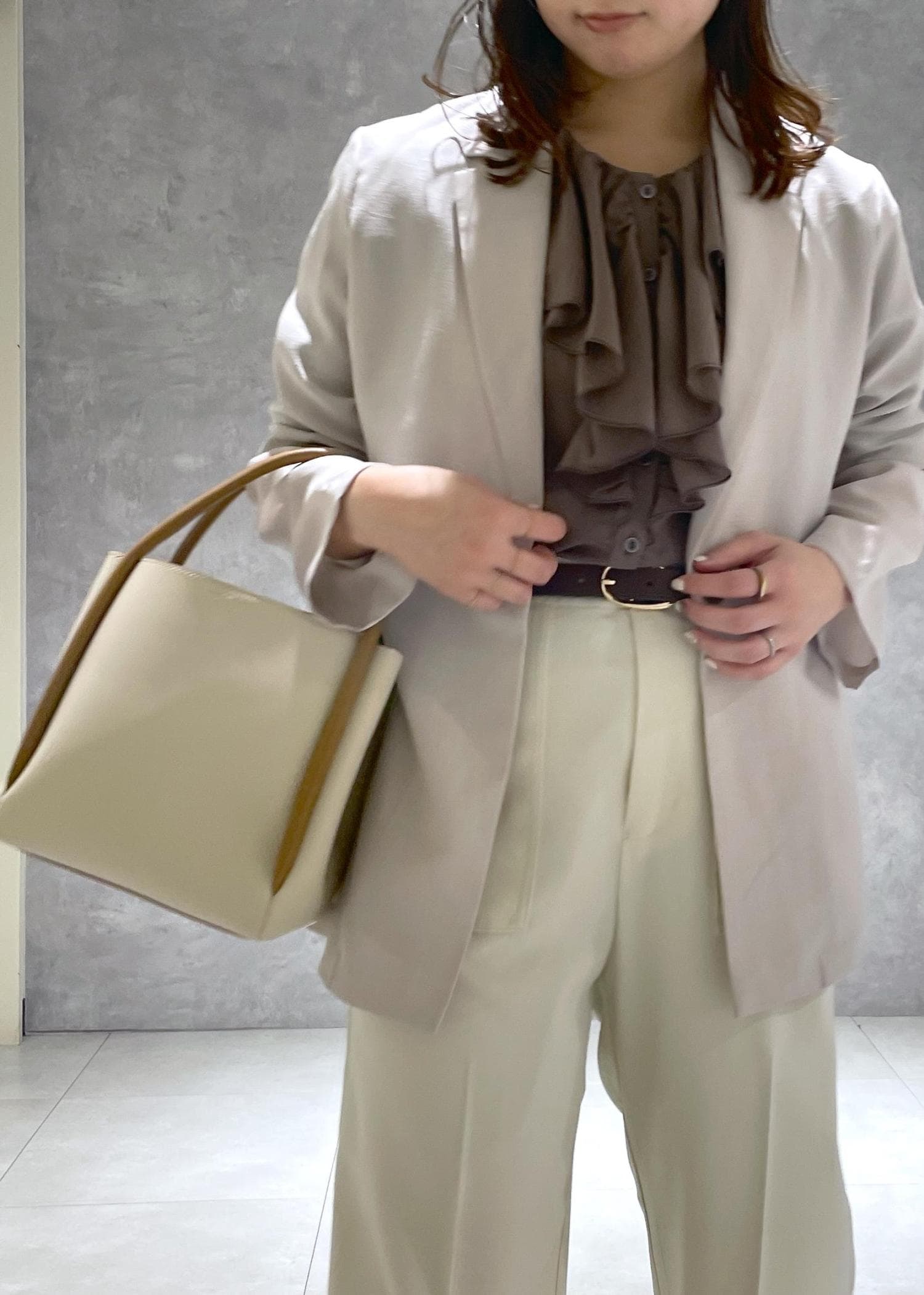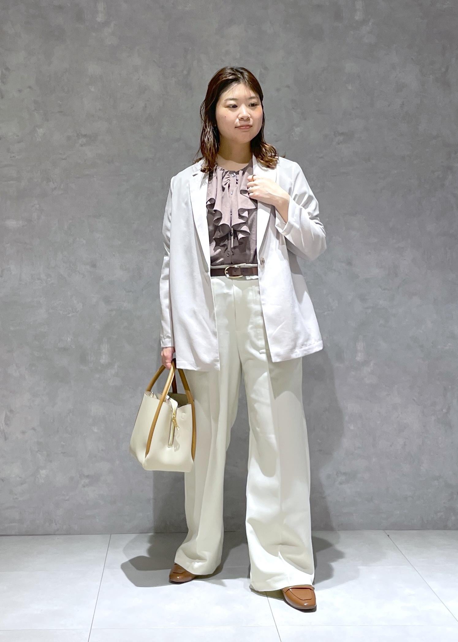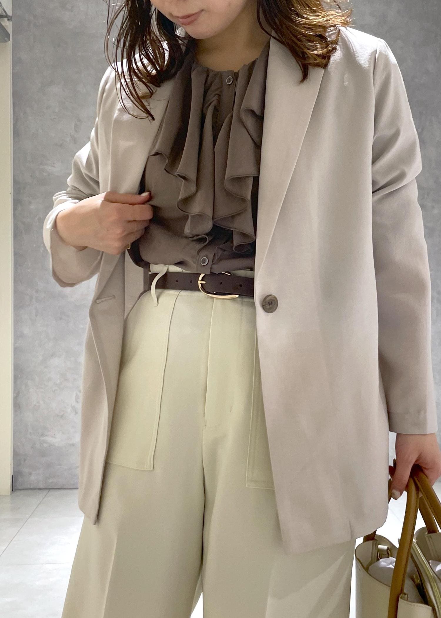 華やかなフリルブラウスにベージュのジャケットを合わせ、上品なワントーンコーデにしてみました。パンツスタイルで動きやすいのでお仕事にもぴったりです!