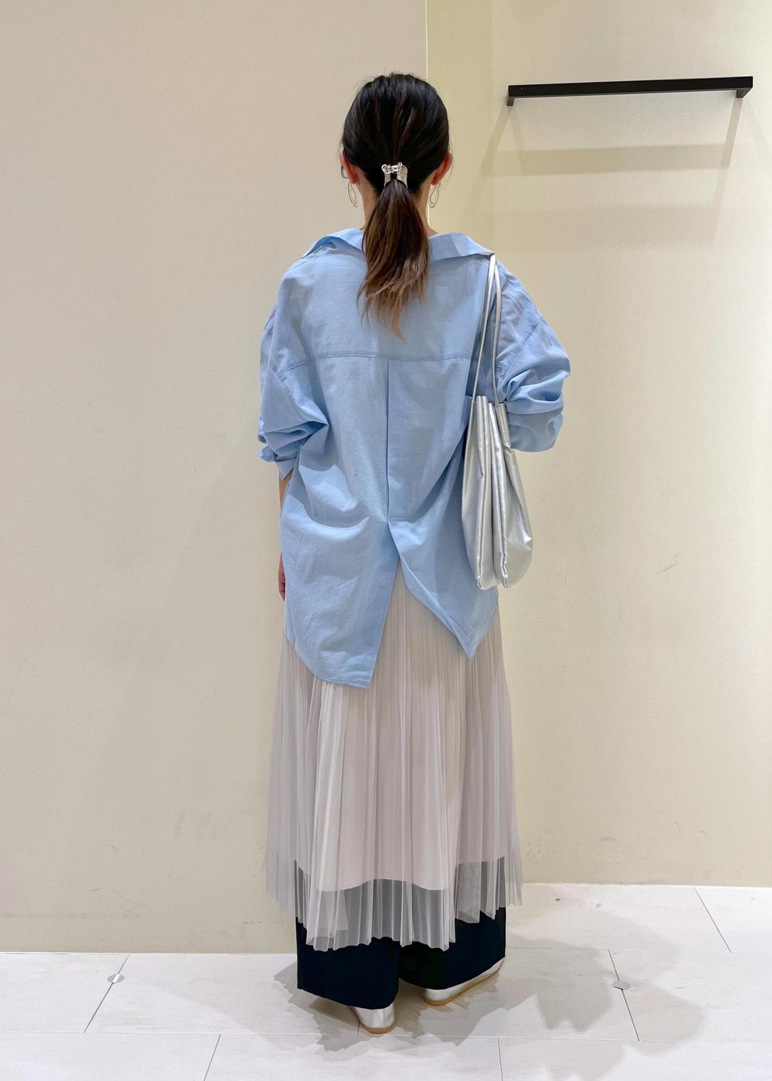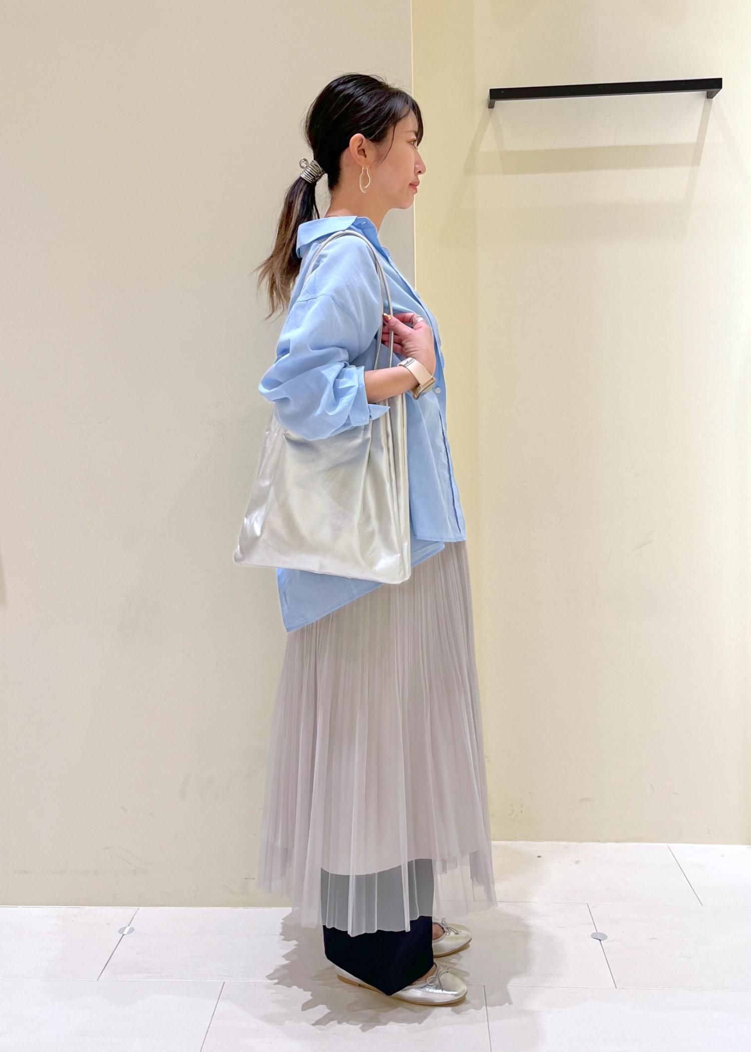 ブルー系×シルバーの小物でまとめたレイヤードコーデ。