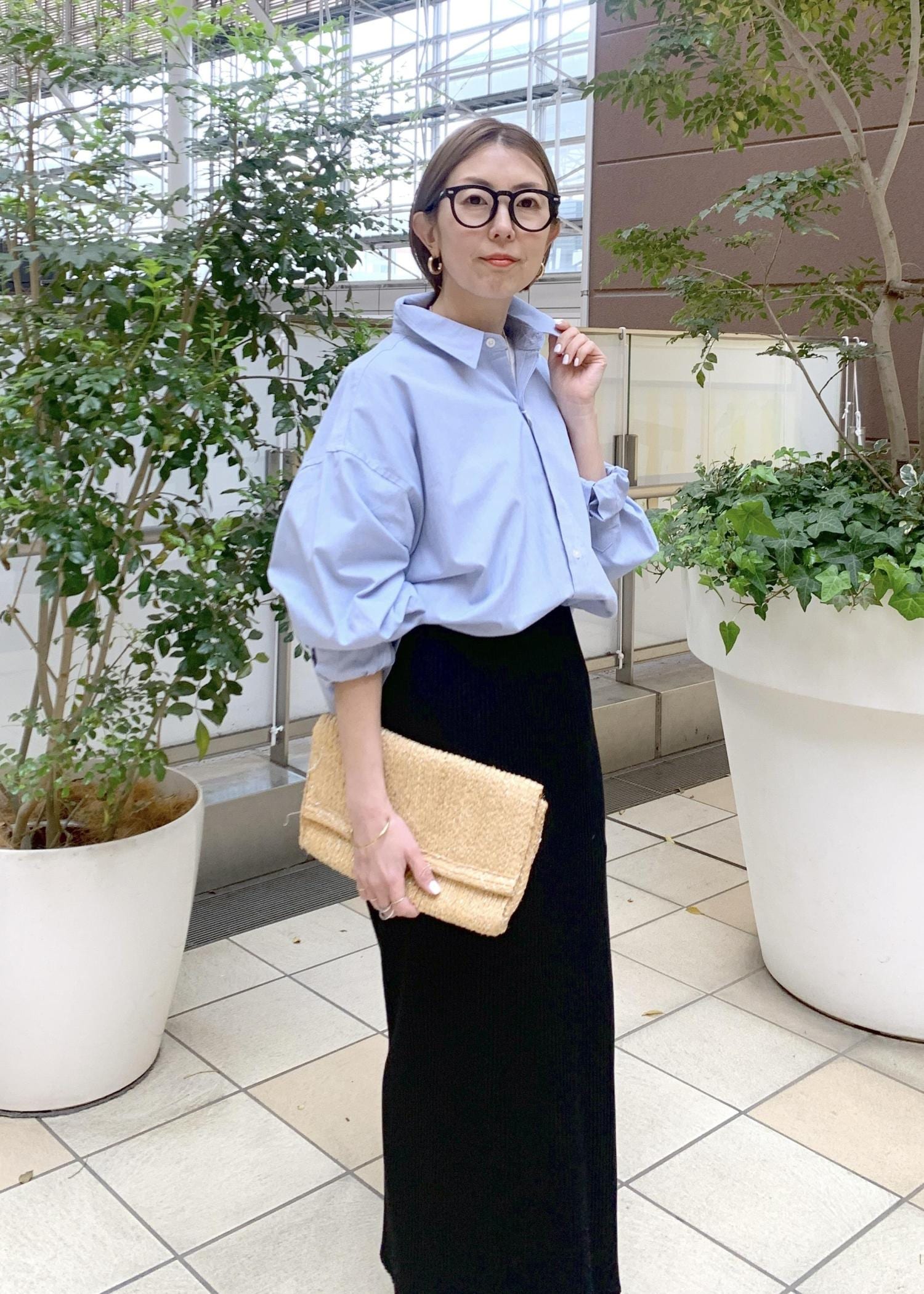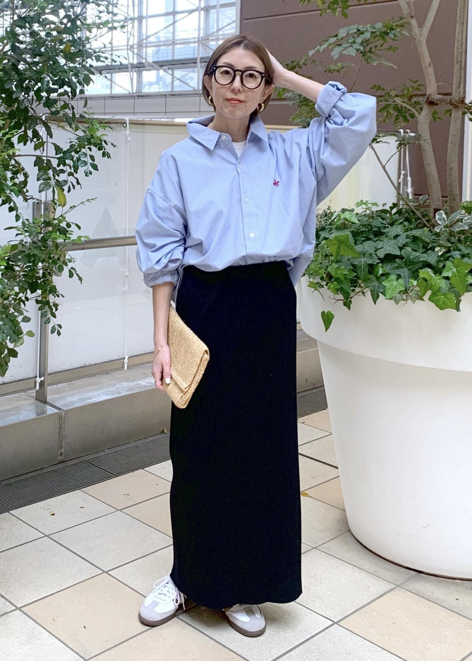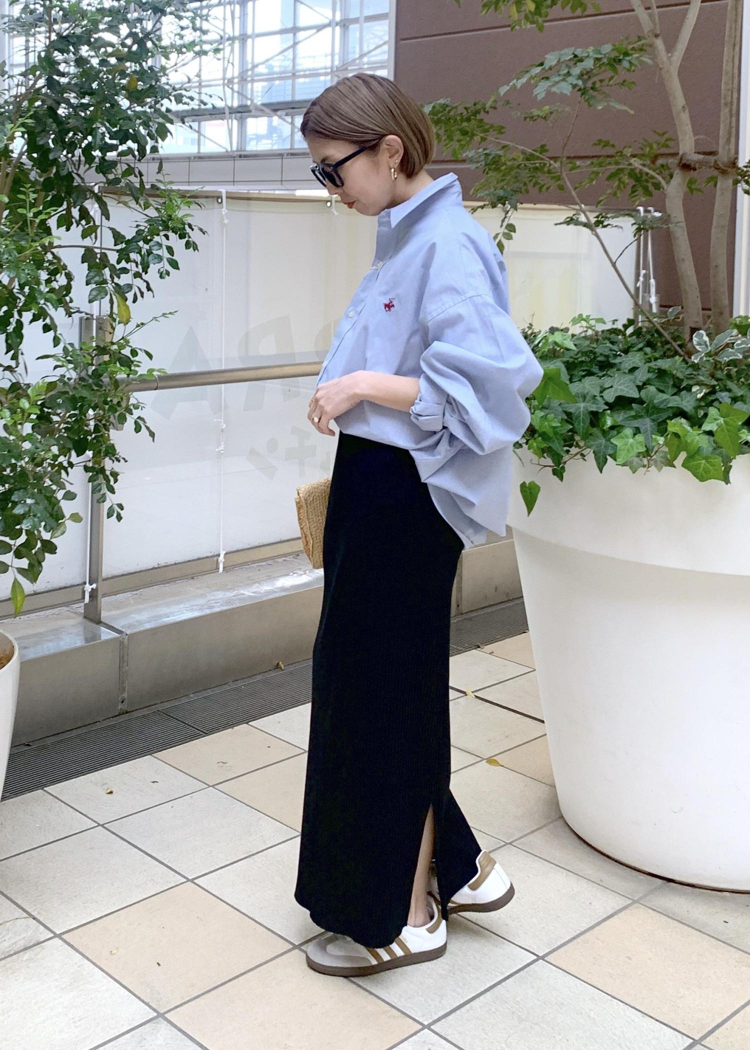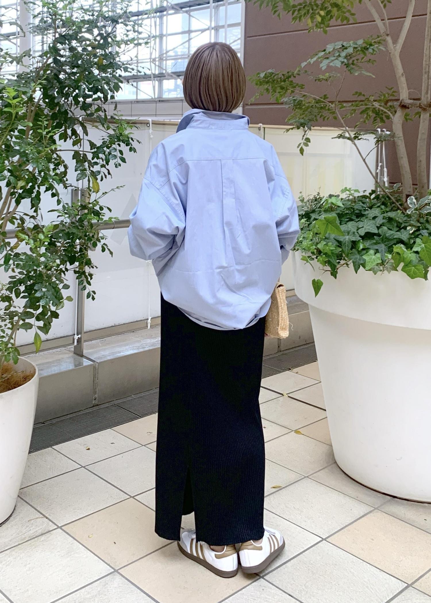 153cmの私には大分オーバーめなサイズ感だったので、前をシャツインしてスッキリとしたスタイリングに。 -