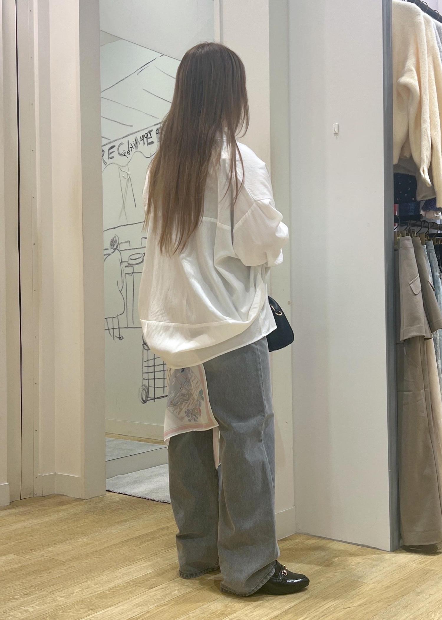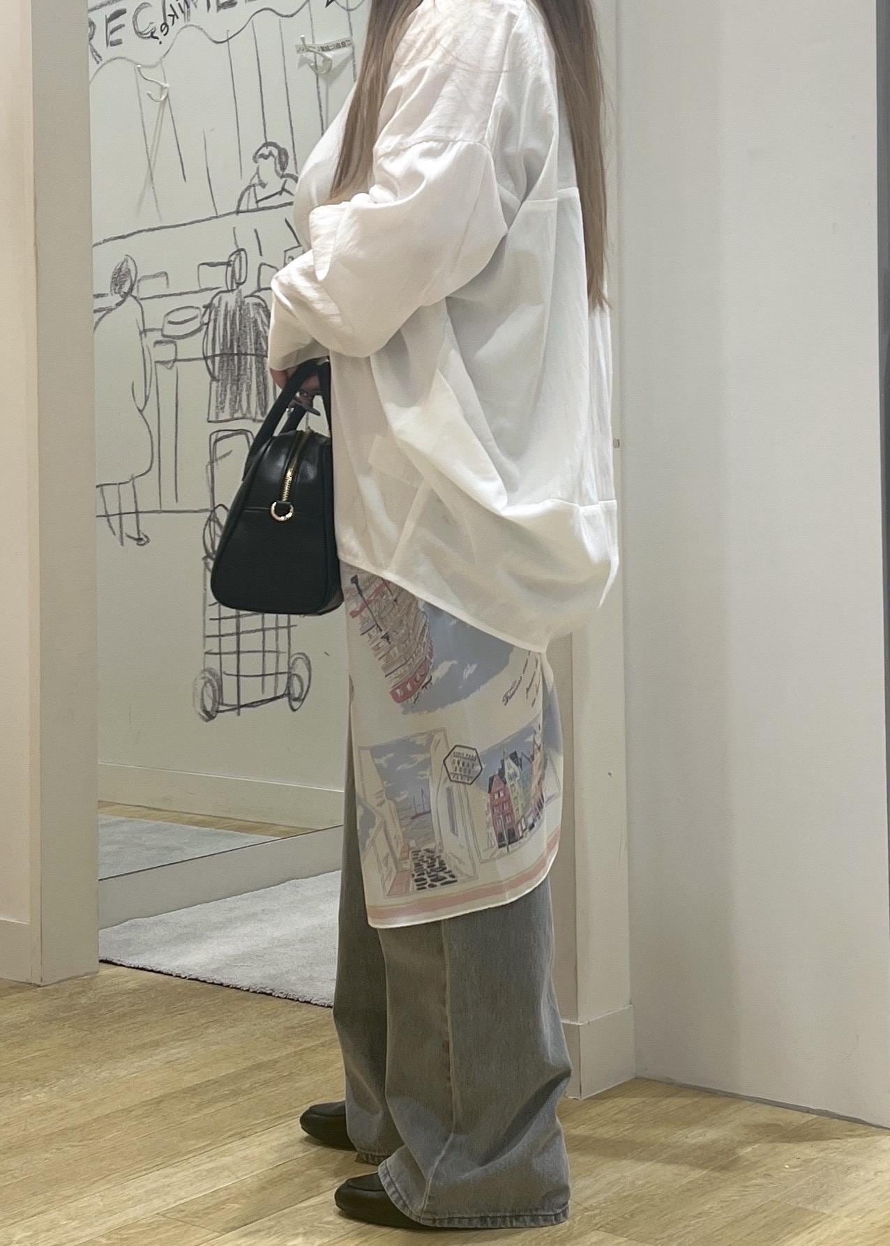 春ということで、ピンクのスカーフをプラスして少しふんわりとした要素も入るように意識しました