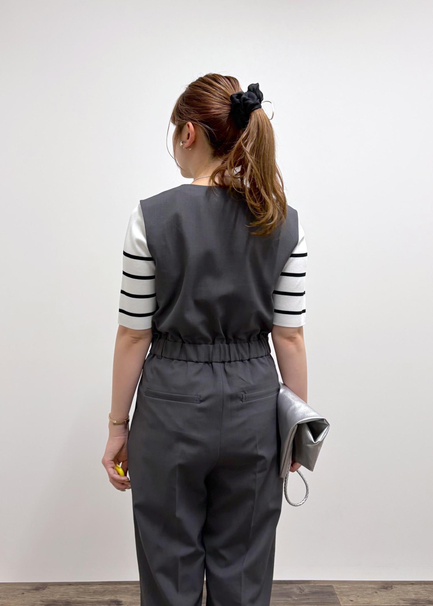 スッキリしたハーフスリーブトップスにノーカラーのオールインワンを合わせた大人っぽコーデ。