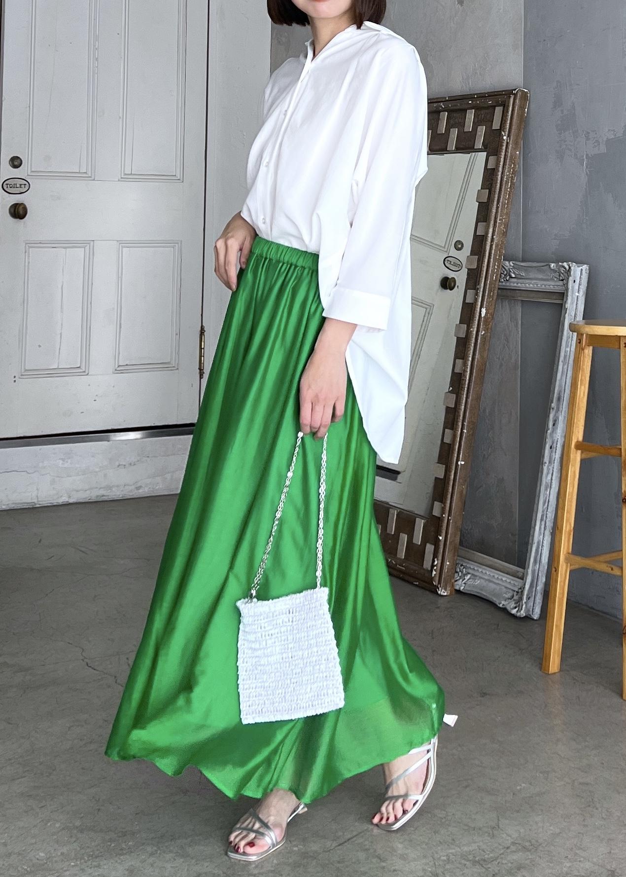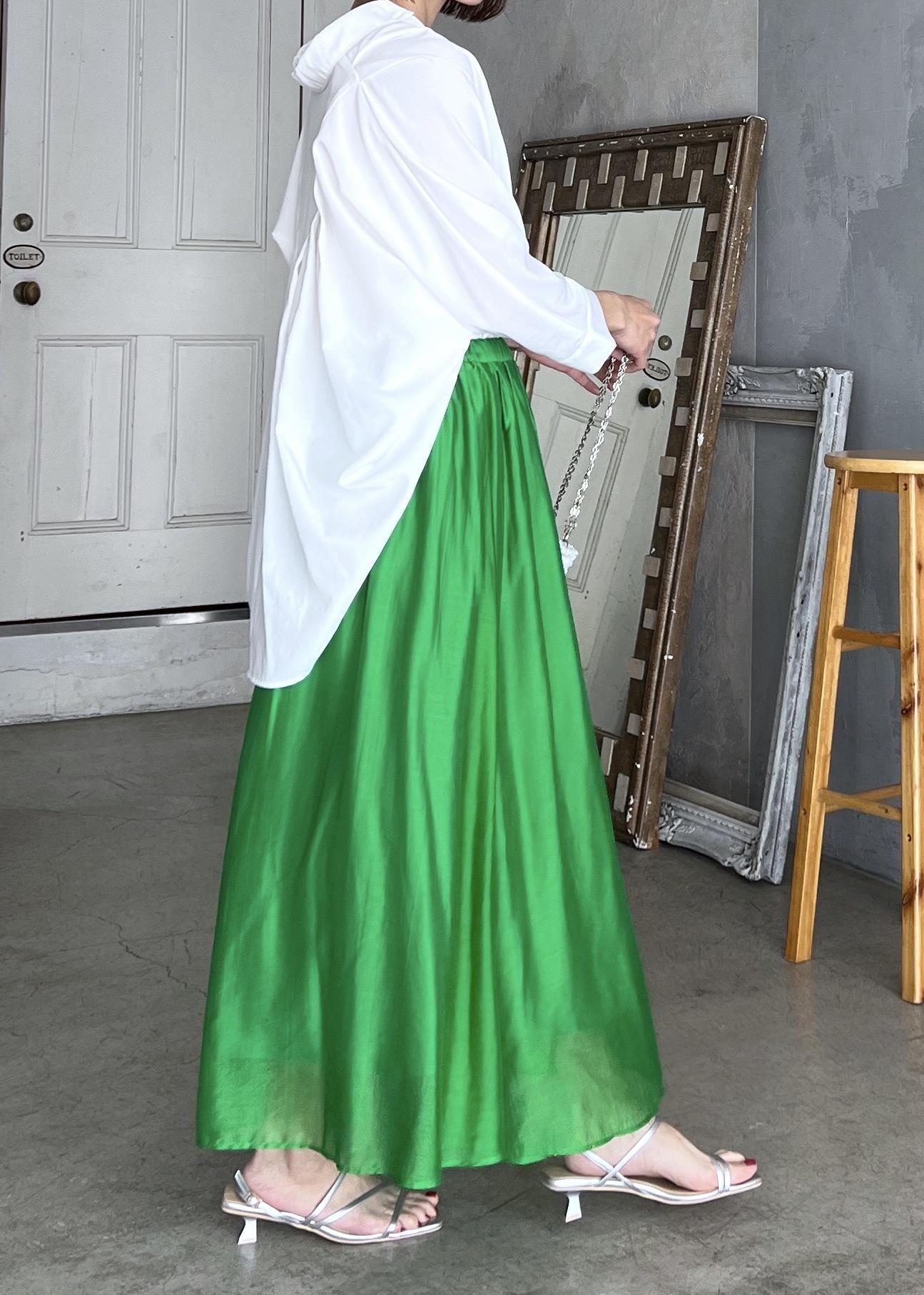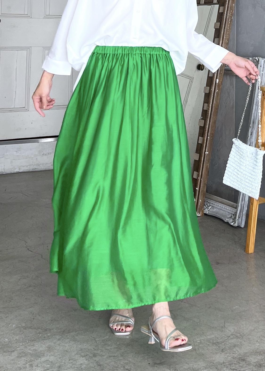 着るだけで華やかなグリーンのスカートは、ふんわり柔らかい生地のスカートで履き心地も楽ちん。