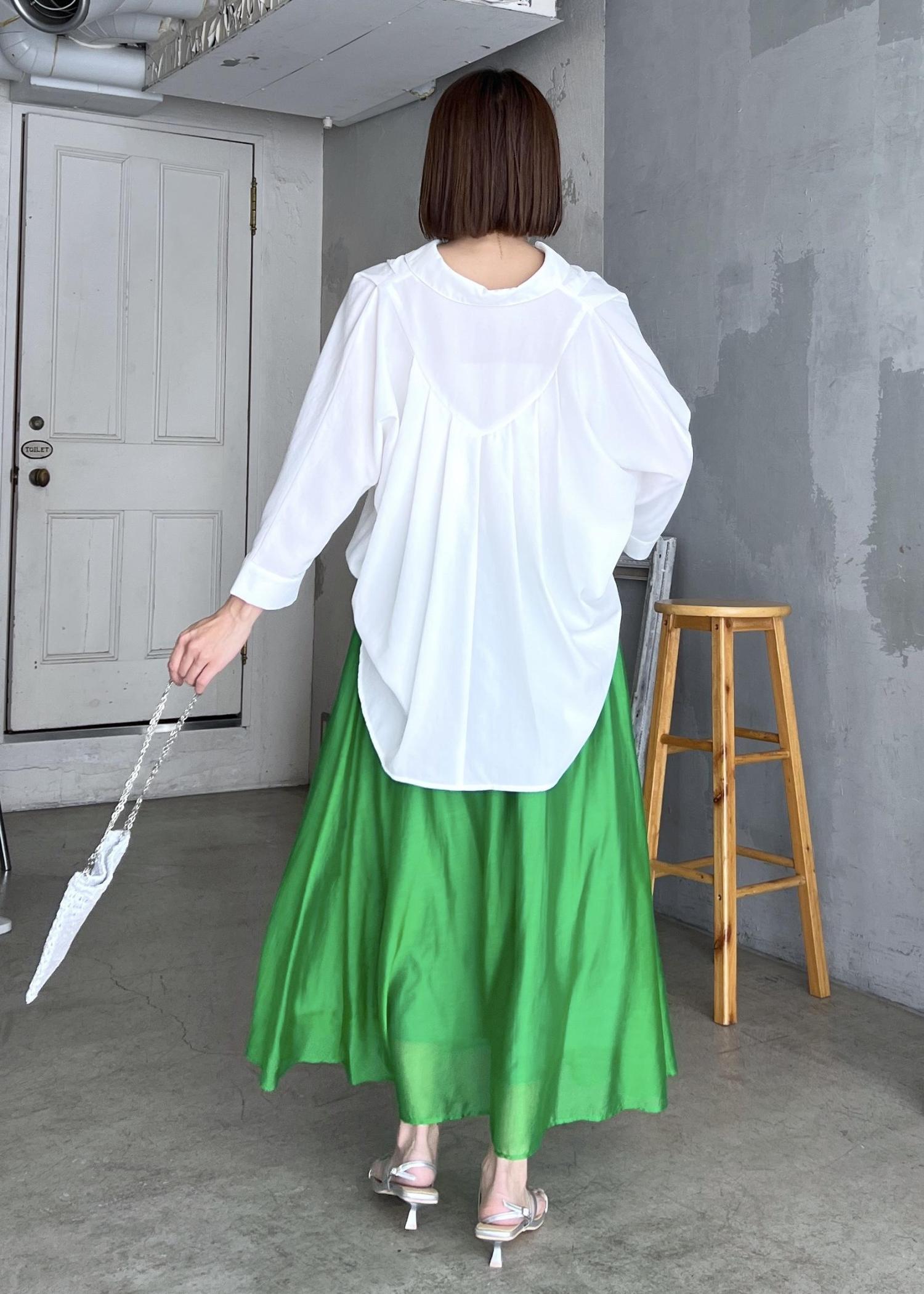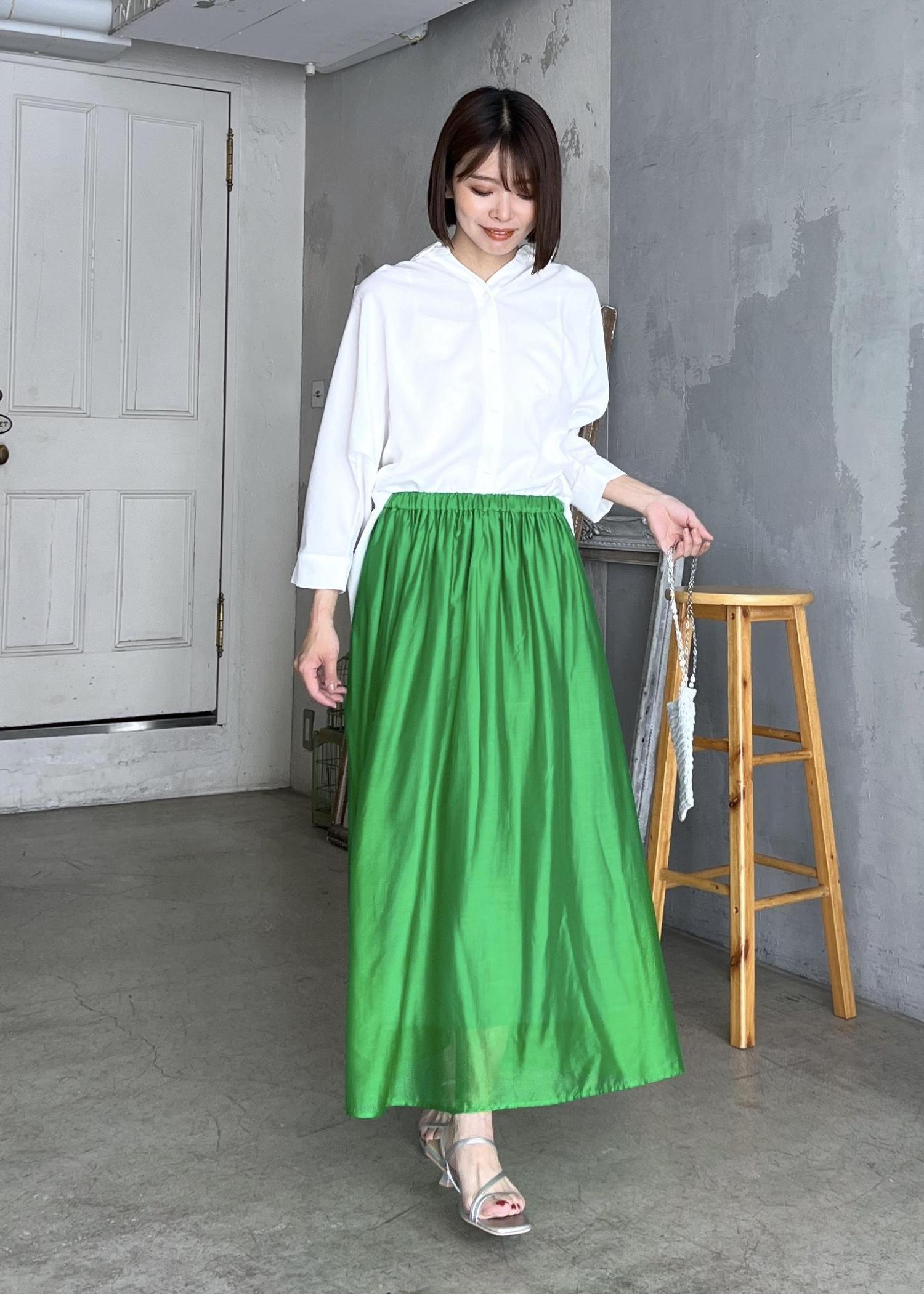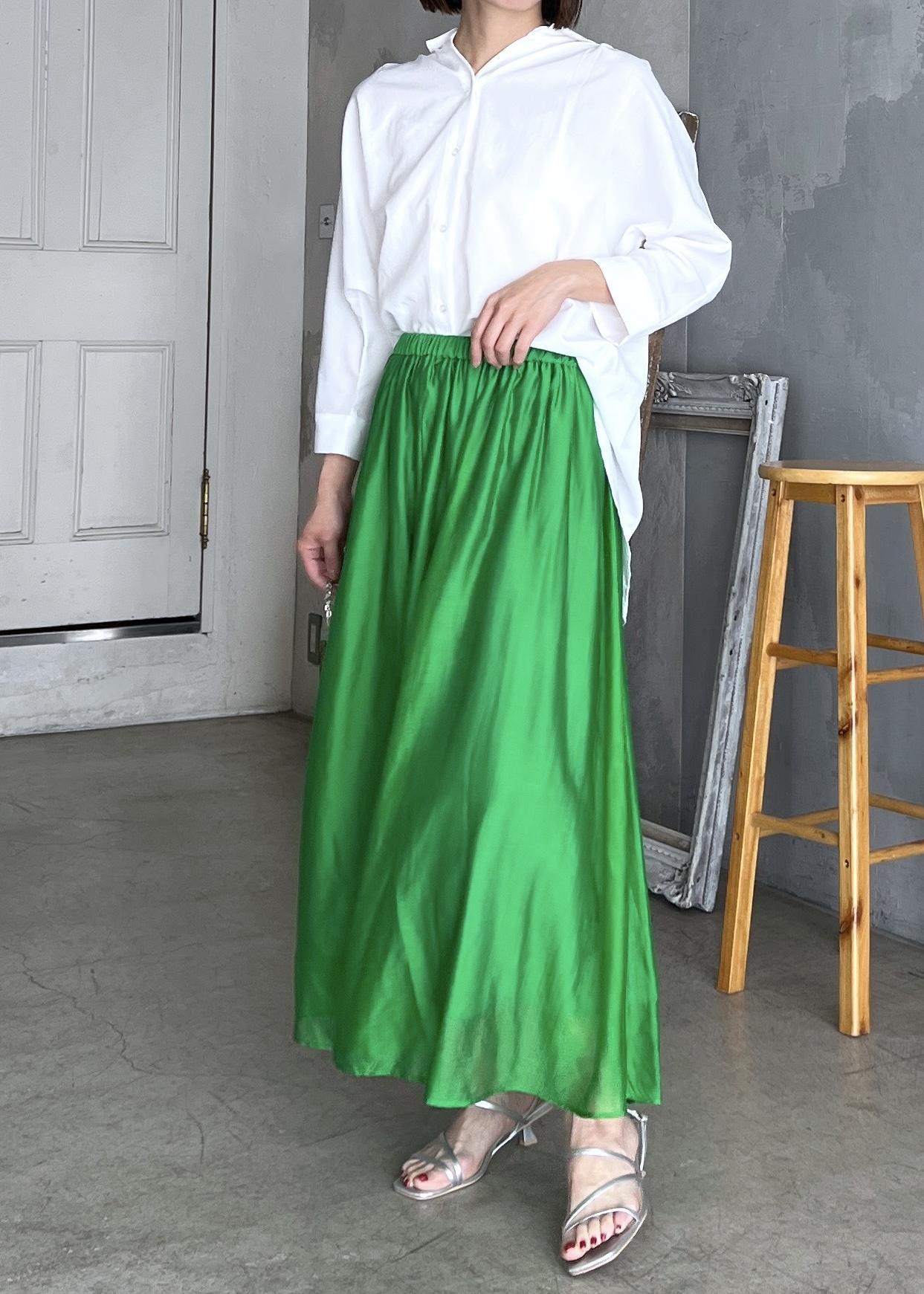 着るだけで華やかなグリーンのスカートは、ふんわり柔らかい生地のスカートで履き心地も楽ちん。