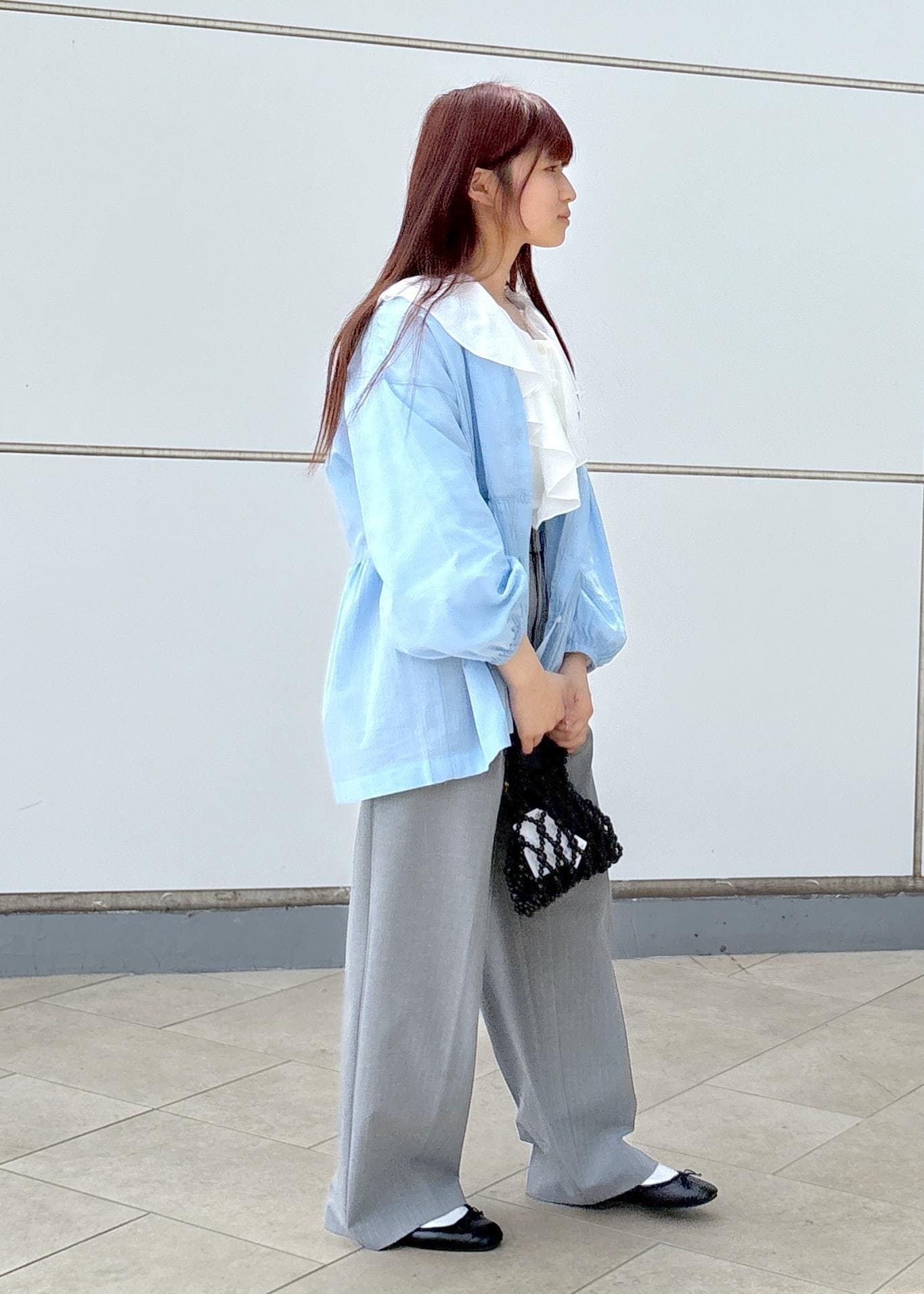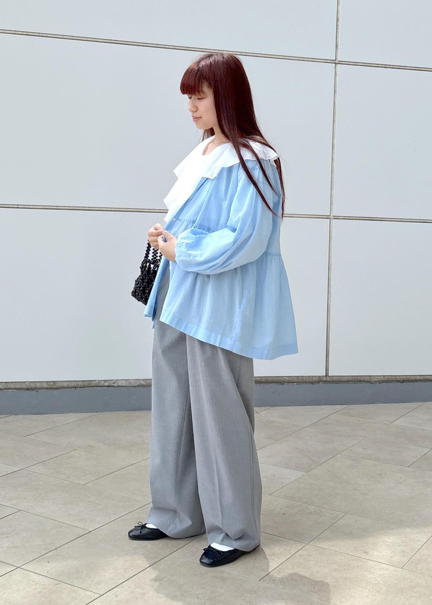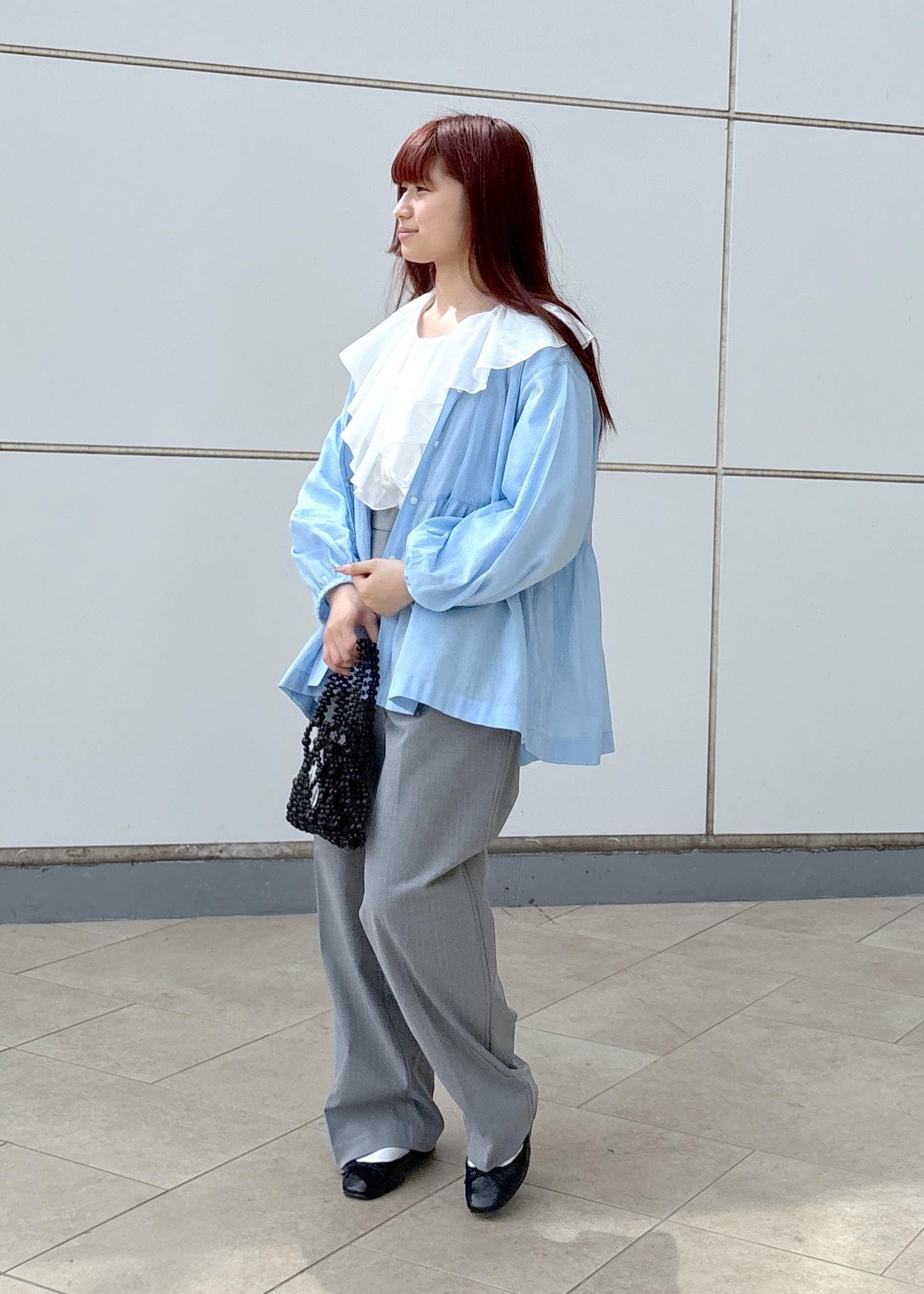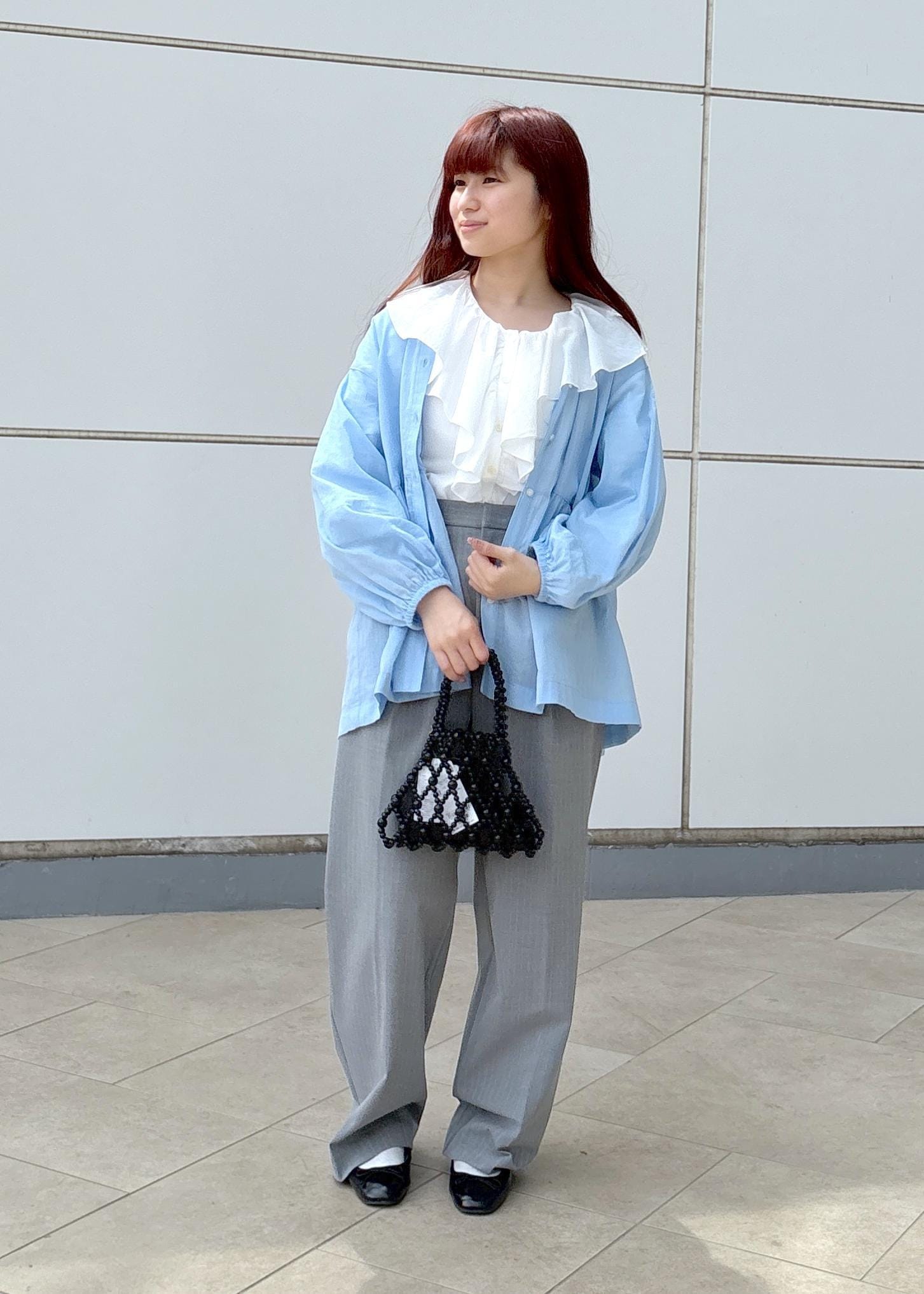 フリルが特徴的なブラウスをインナーに着て襟がないペプラムシャツをカーディガンのように着ることでフリルが目立ちより可愛いスタイリングになっております。バッグとシューズを黒にすることによって統一感と締め食の役割になってくれました。なかなか挑戦しないブルー系ですがいつも着ているホワイトと合わせる事で自分らしく可愛いコーデにできました。