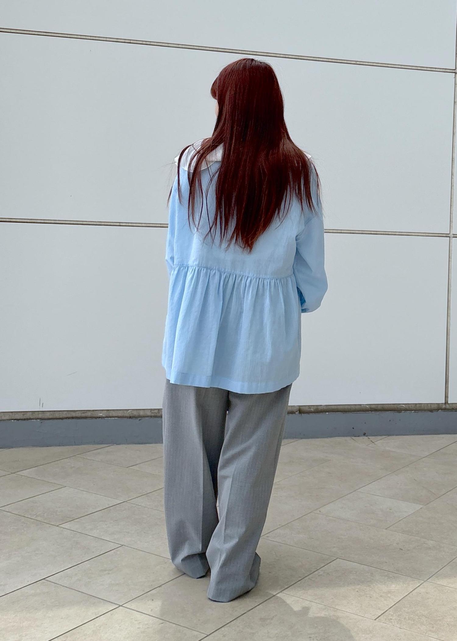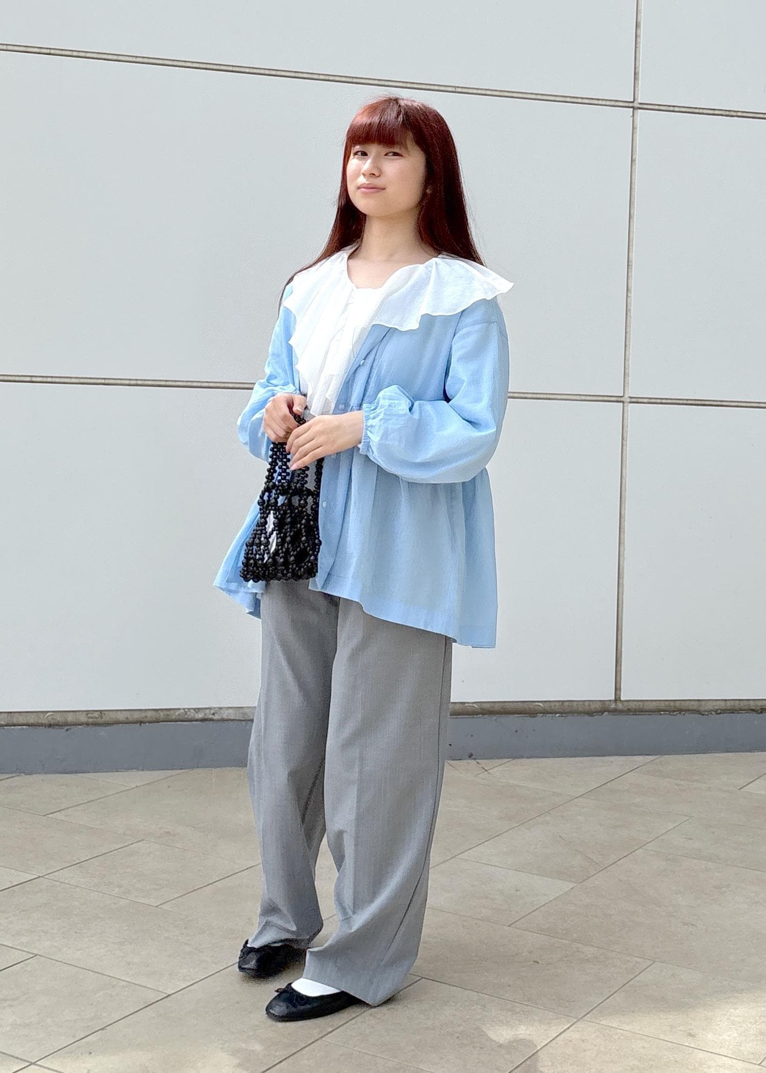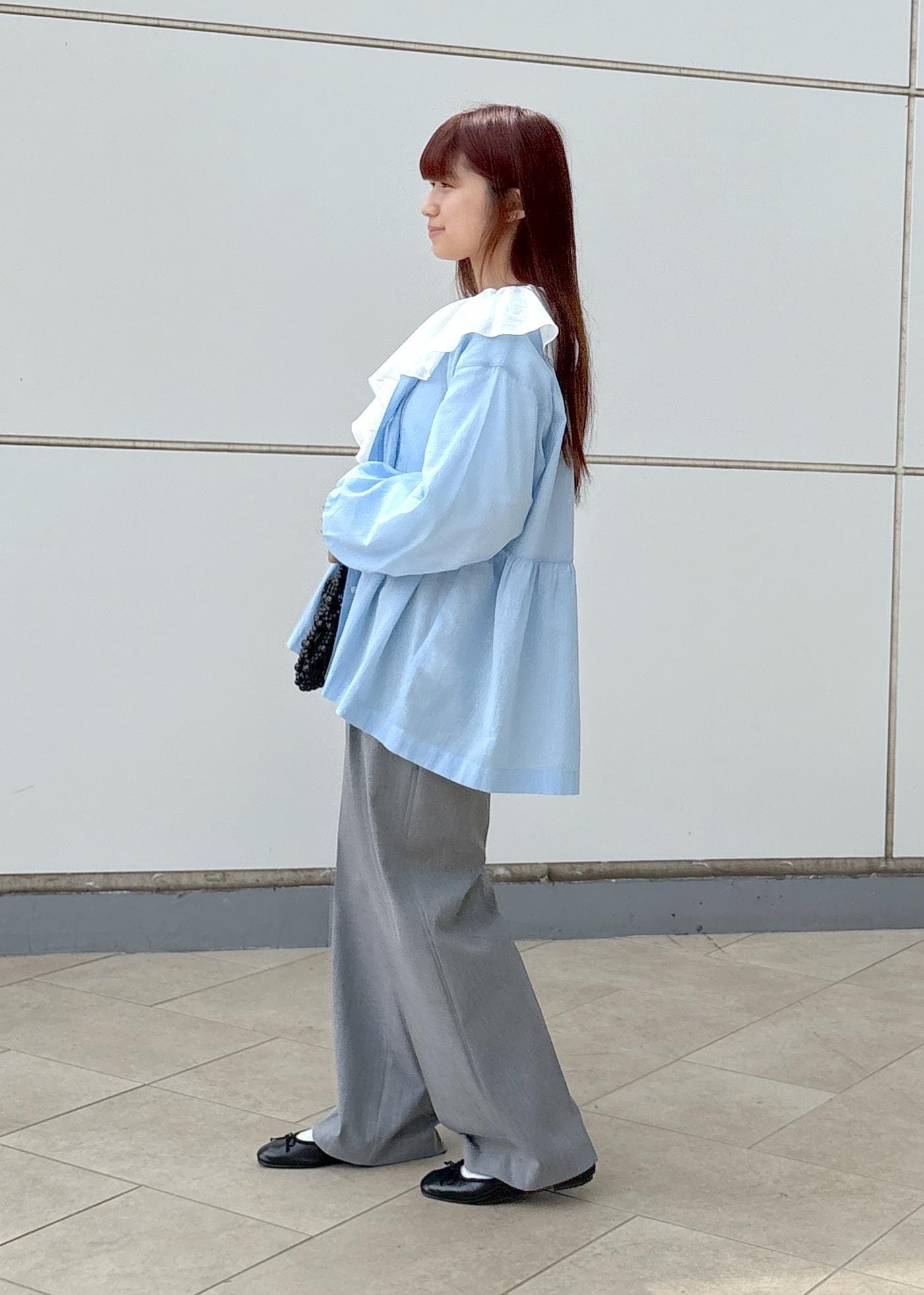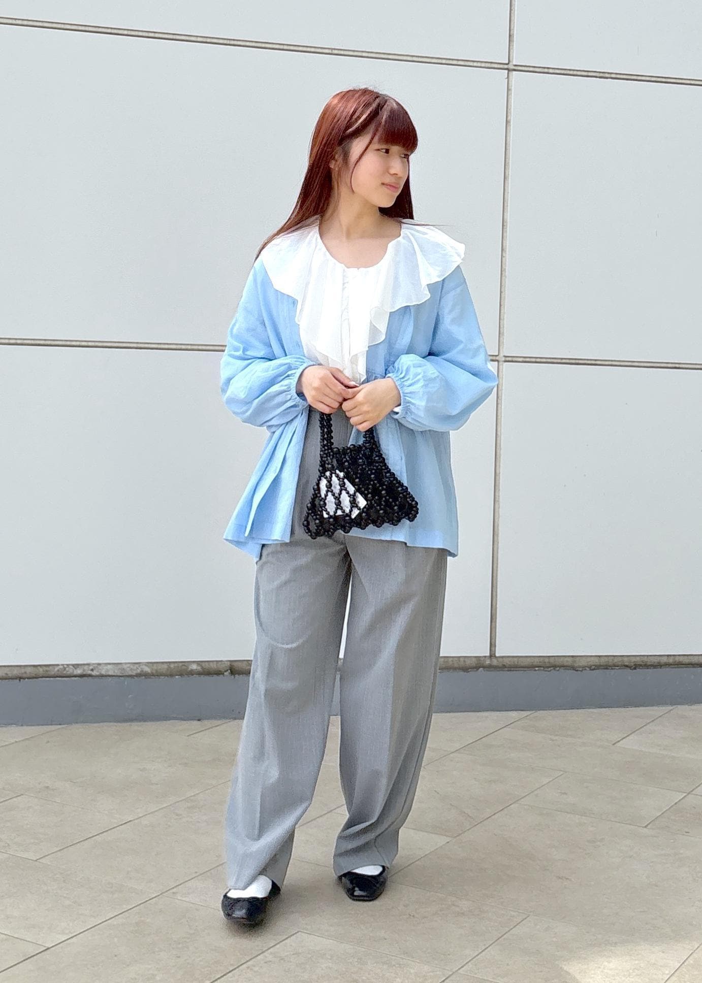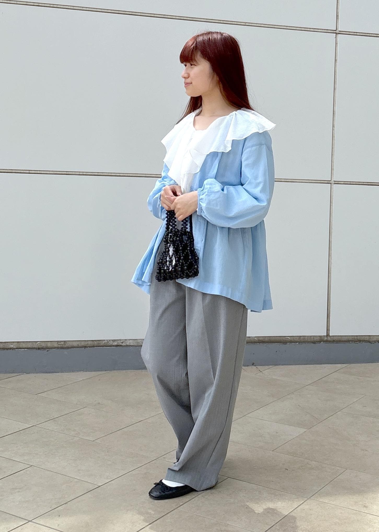 フリルが特徴的なブラウスをインナーに着て襟がないペプラムシャツをカーディガンのように着ることでフリルが目立ちより可愛いスタイリングになっております。バッグとシューズを黒にすることによって統一感と締め食の役割になってくれました。なかなか挑戦しないブルー系ですがいつも着ているホワイトと合わせる事で自分らしく可愛いコーデにできました。