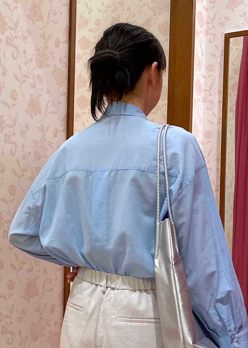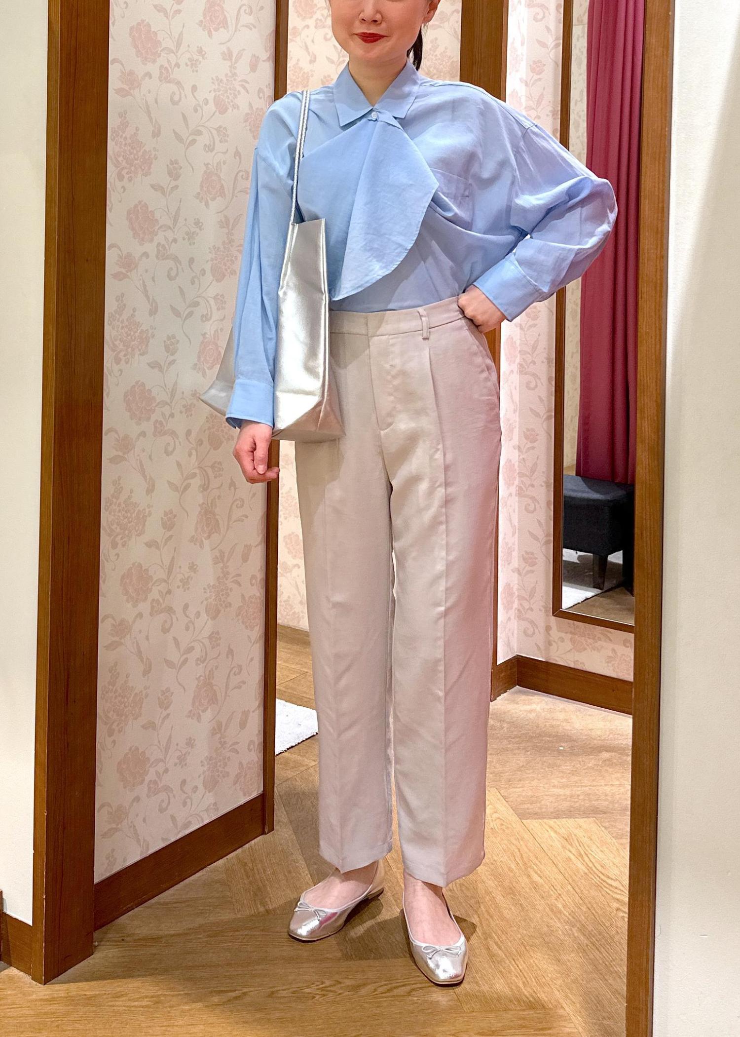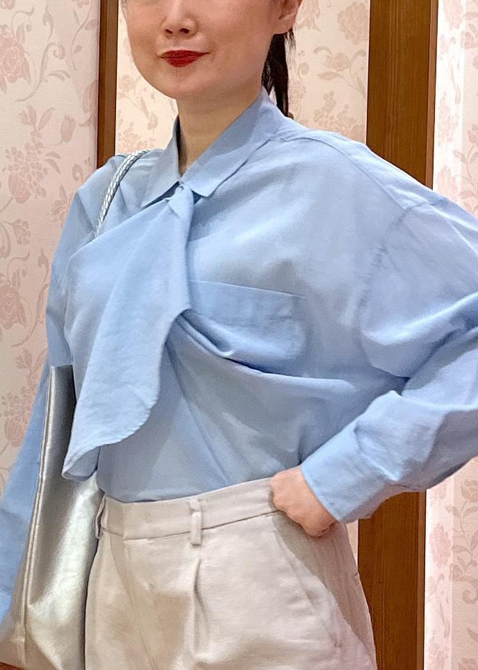 爽やかなブルーはさらっと1枚で着ても肌が綺麗に見えて様になりますが、今回はボタンの留め方のアレンジをしてボウタイ風にきてみました。プライベートもお仕事も両方着れます!