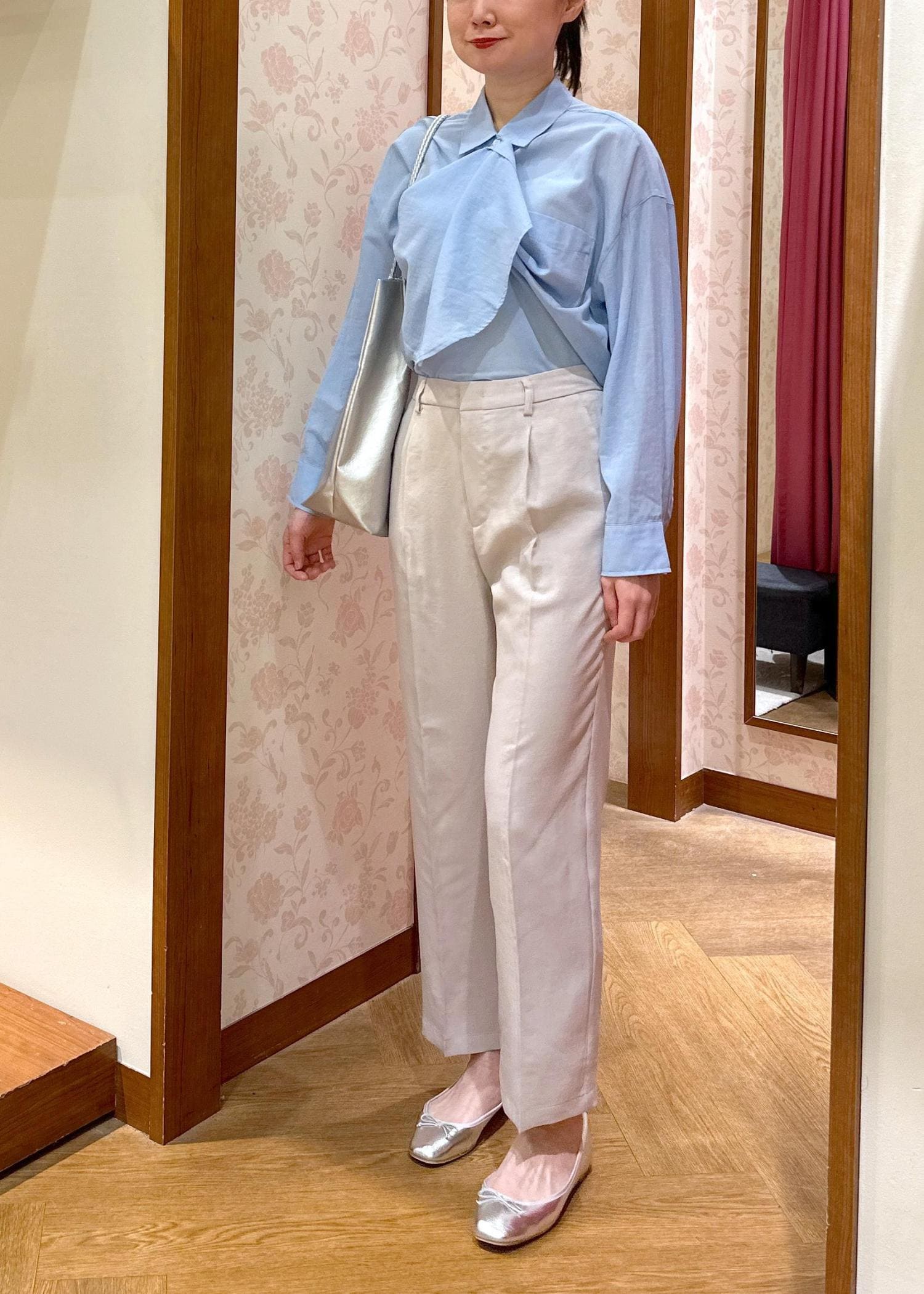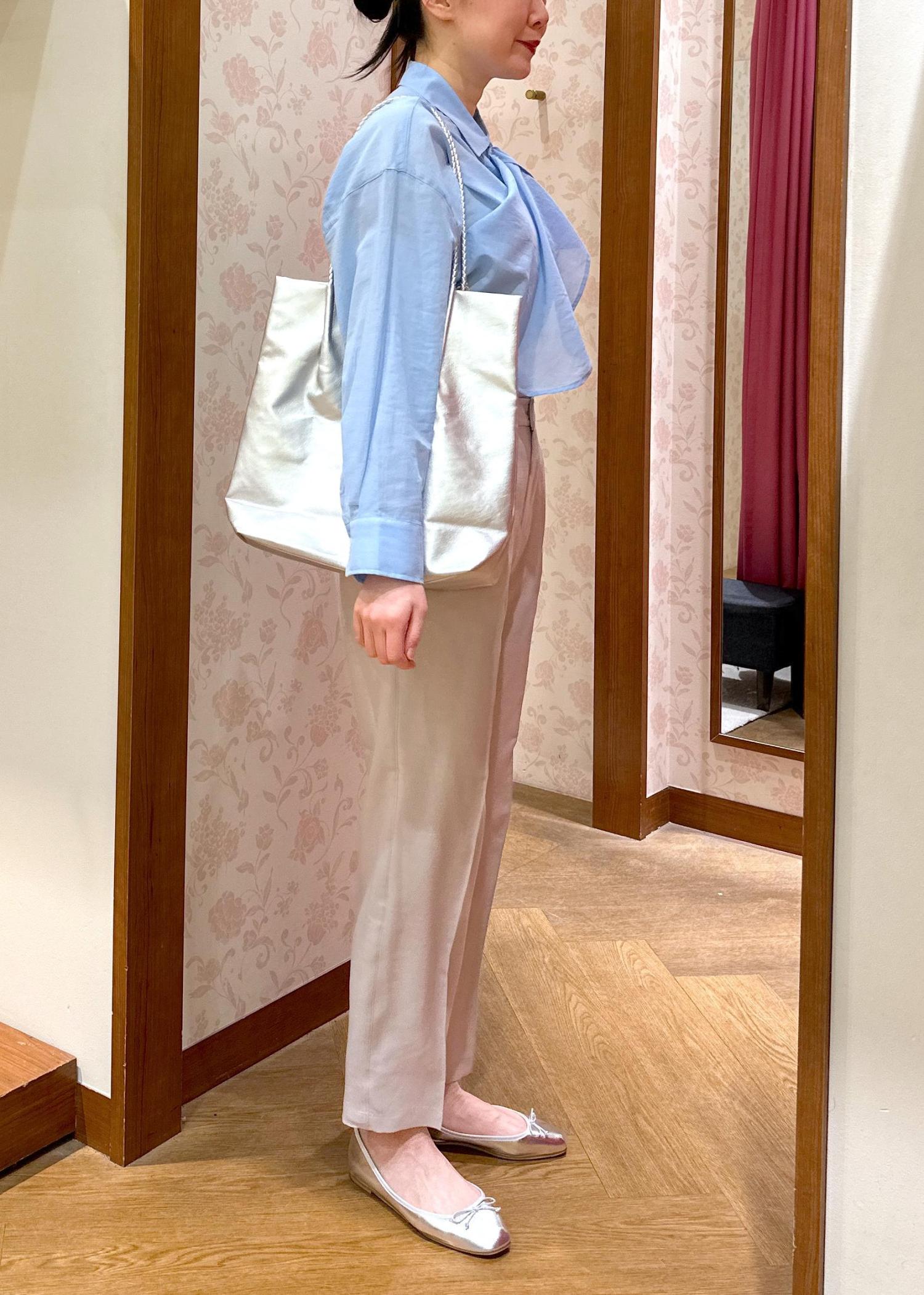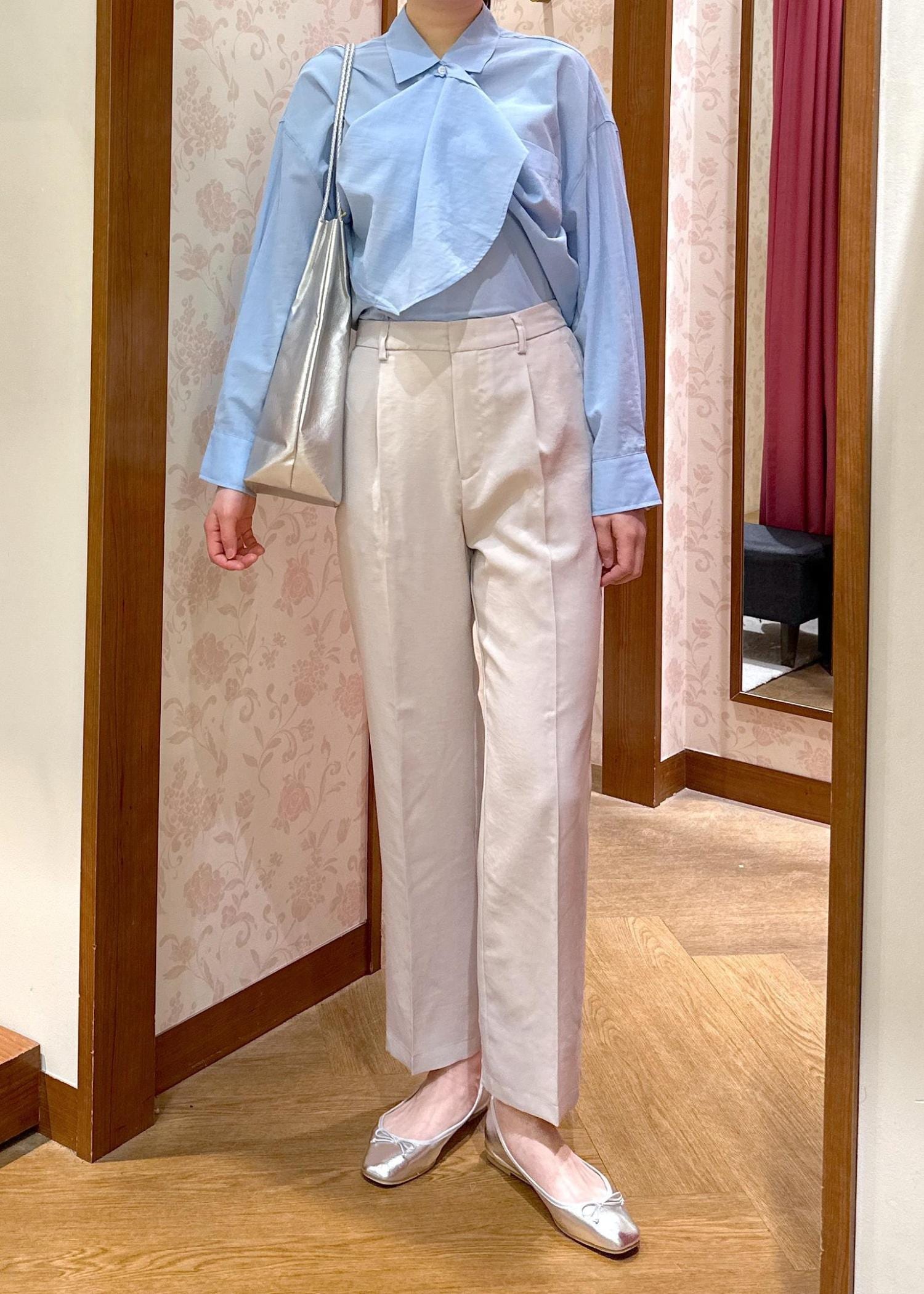 爽やかなブルーはさらっと1枚で着ても肌が綺麗に見えて様になりますが、今回はボタンの留め方のアレンジをしてボウタイ風にきてみました。プライベートもお仕事も両方着れます!