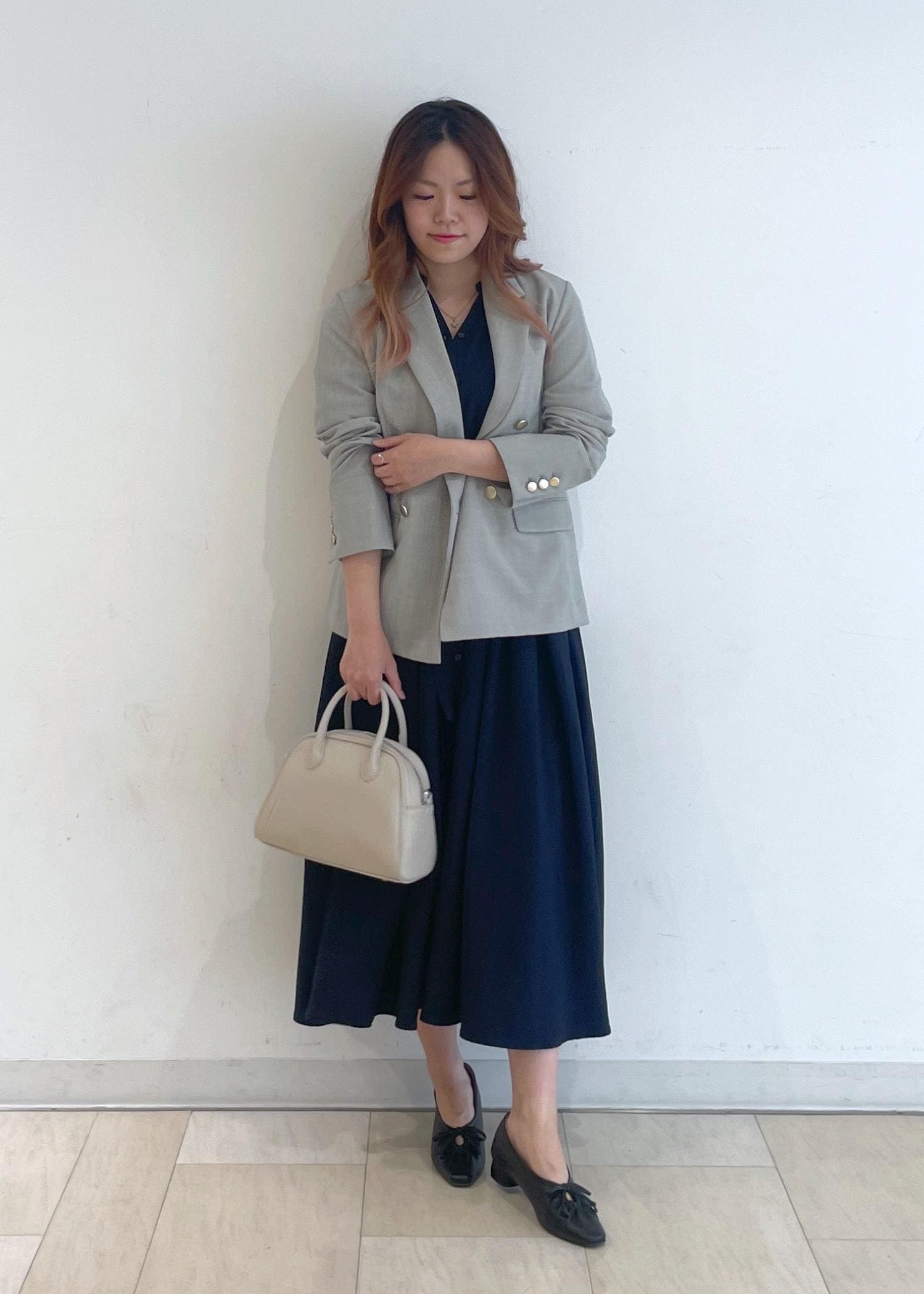 ジャケットはグレー見えするグリーンなので、お仕事でも使いやすいのでオススメです◎