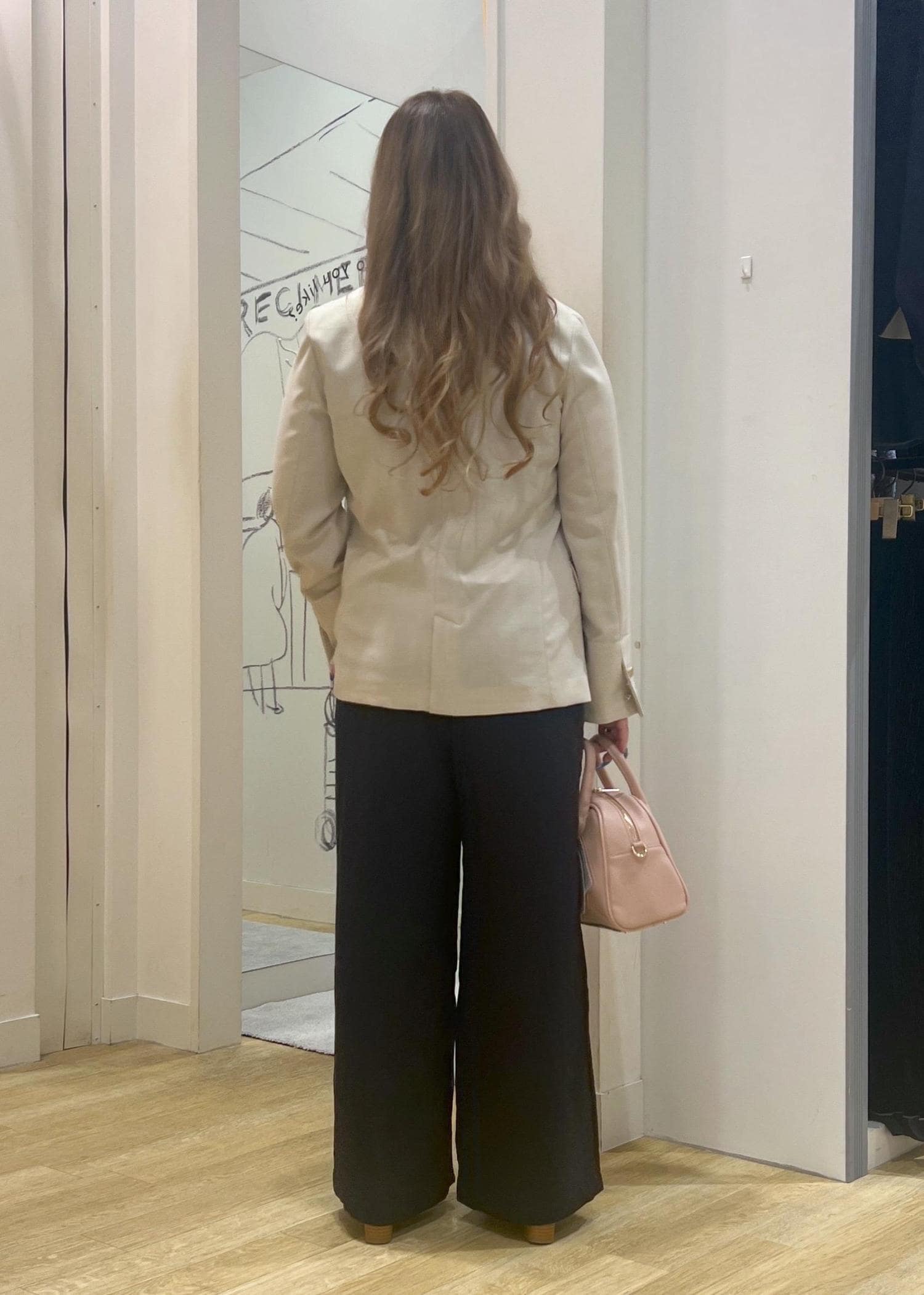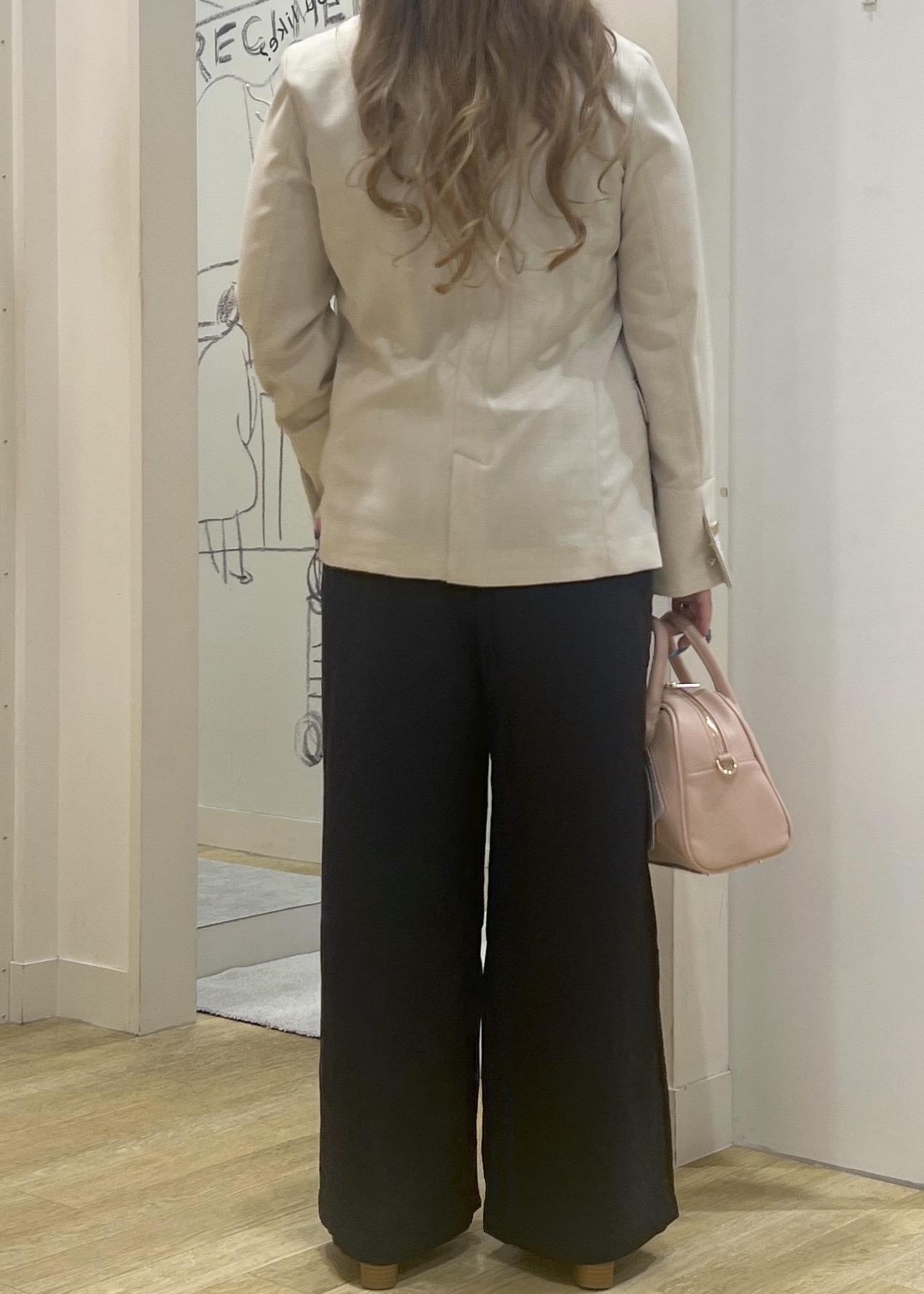 ブラックのパンツスタイルと合わせることでカチッと大人らしい雰囲気に◎