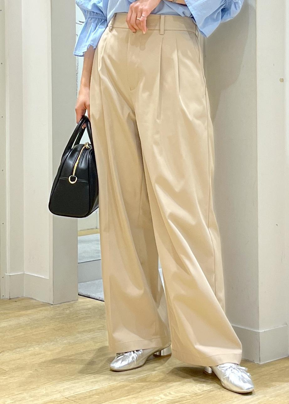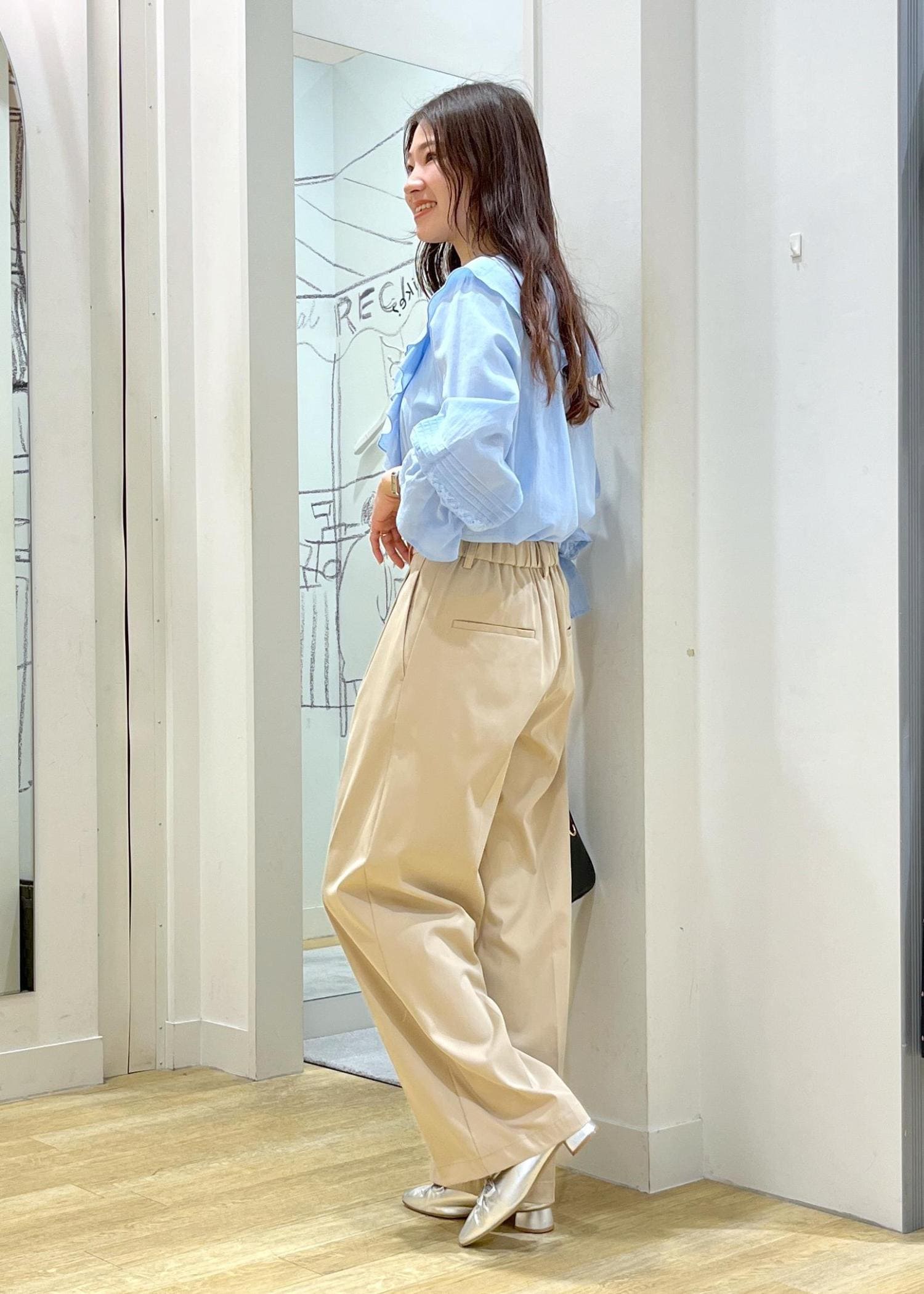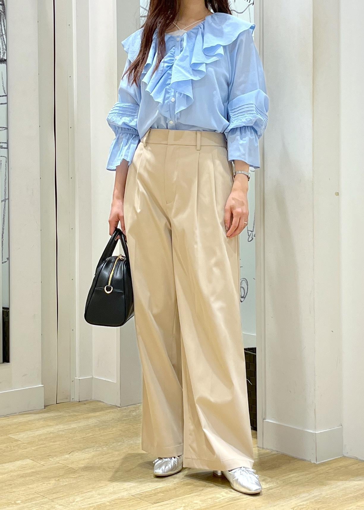 フリルが華やかなブラウスに、ワイドパンツを合わせた綺麗めカジュアルコーデです。