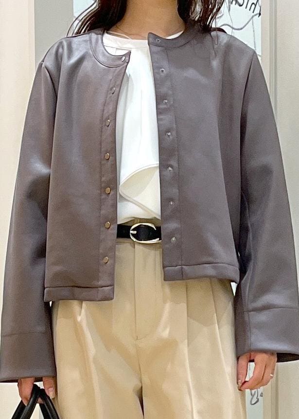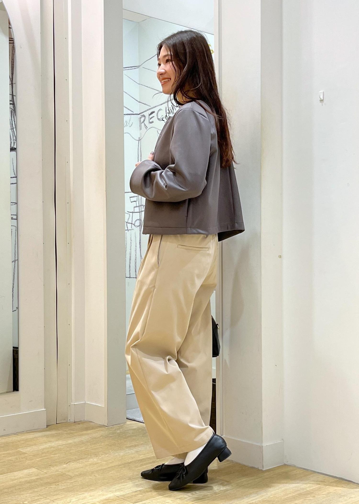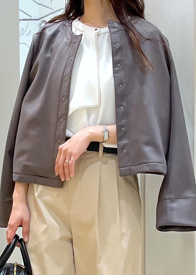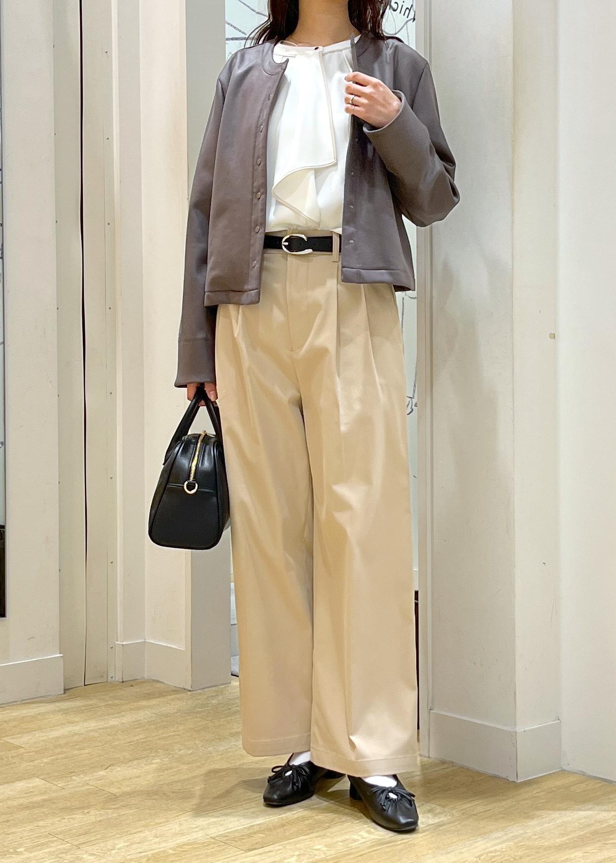 ブラウスにワイドパンツを合わせたコーデに、カジュアルなデザインのアウターを合わせたコーデです。