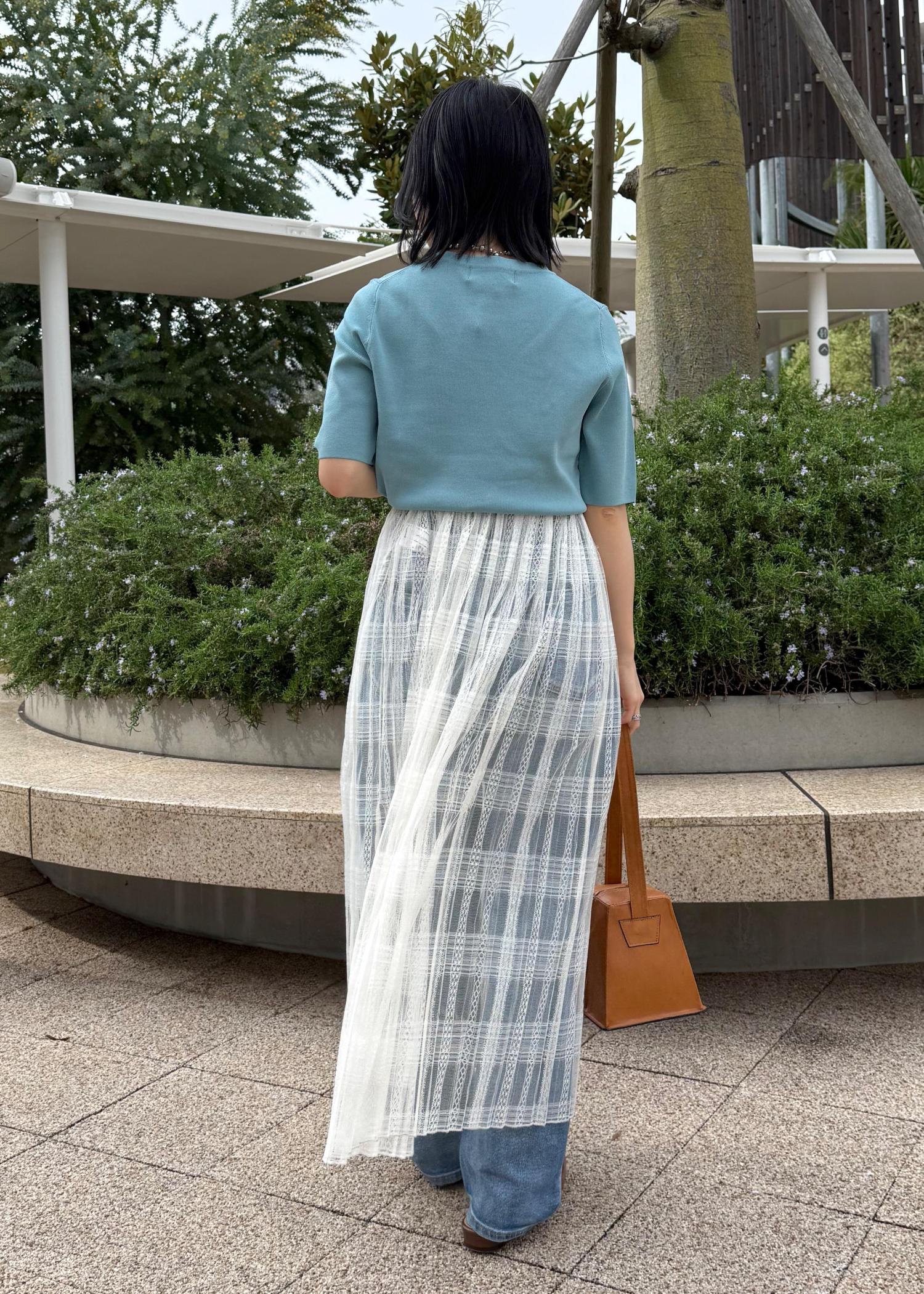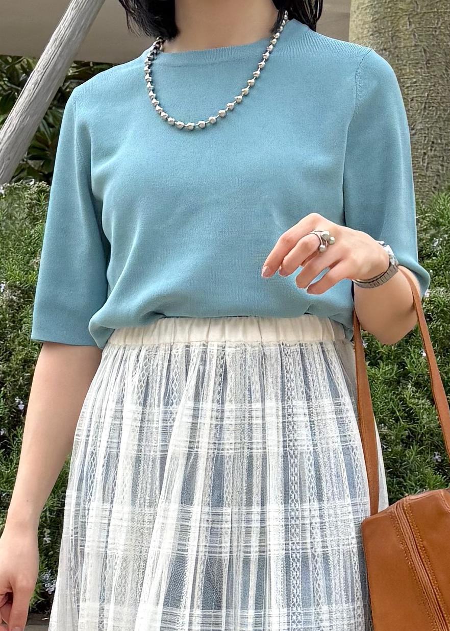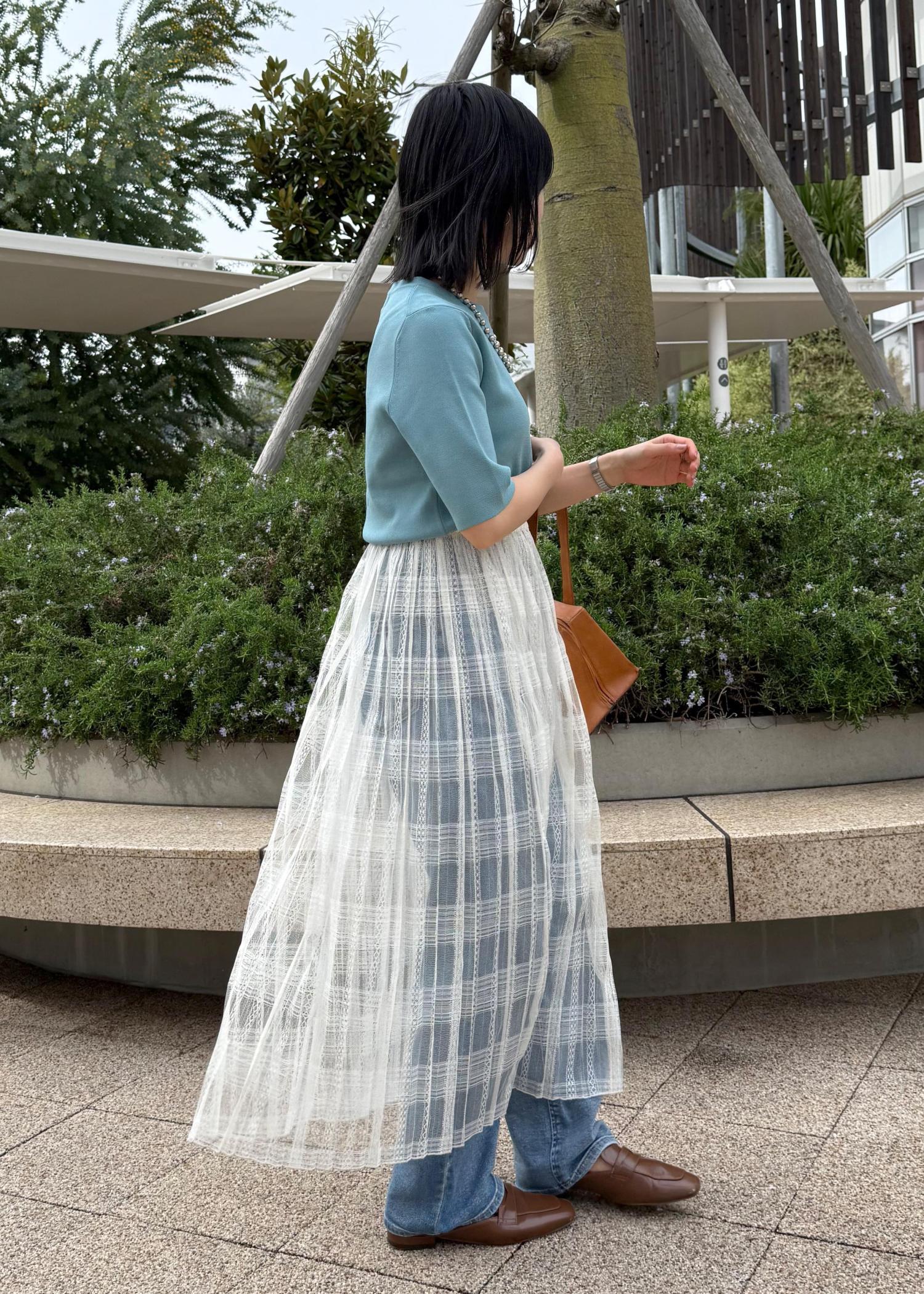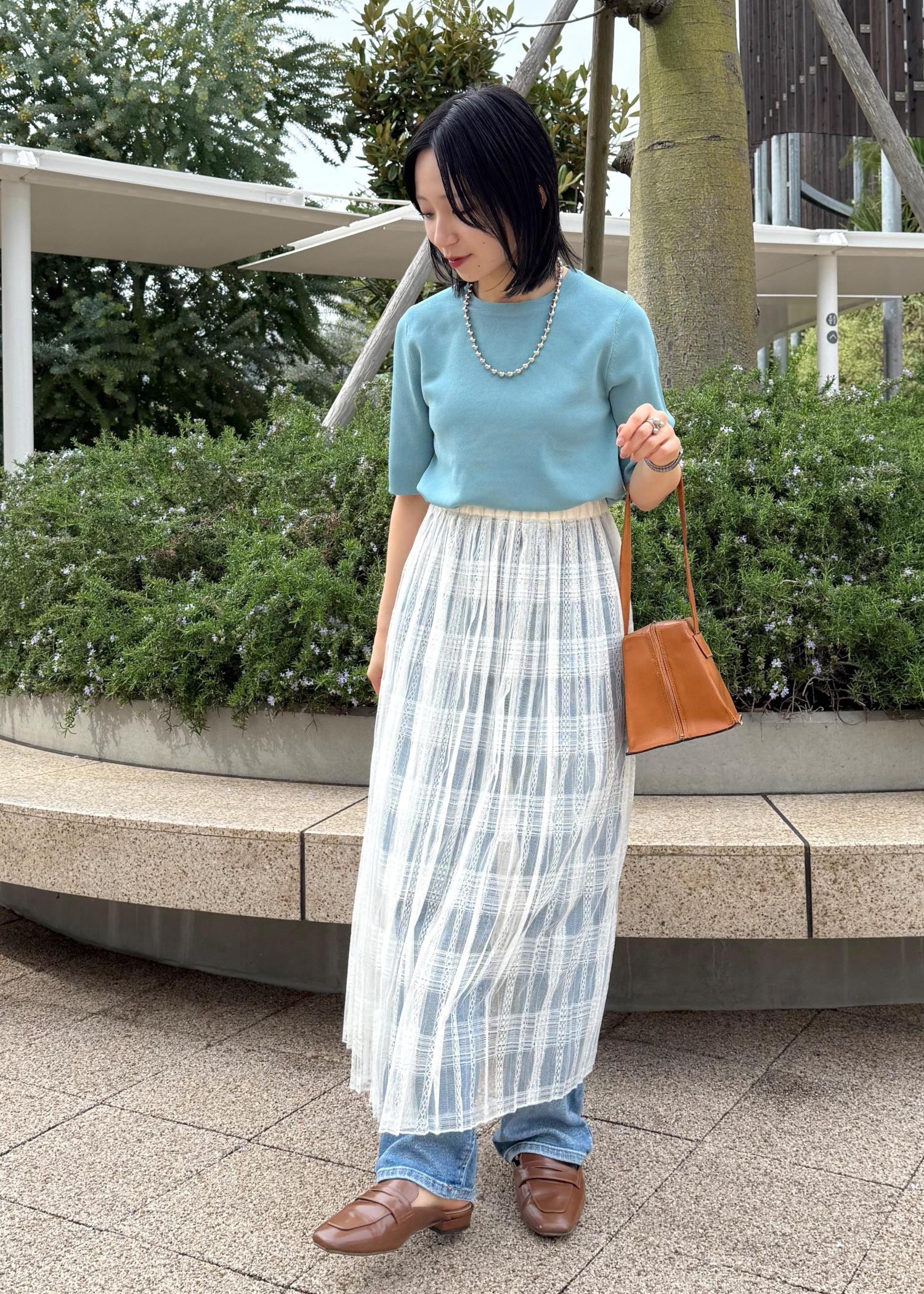 ブルーカラーのワントーンにホワイトのスカートが映えます◎