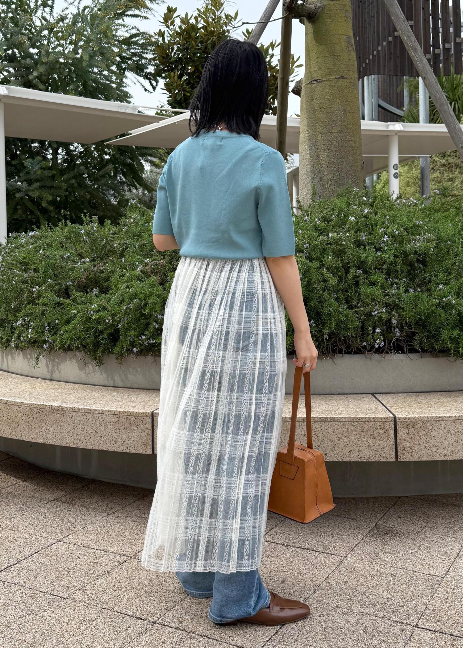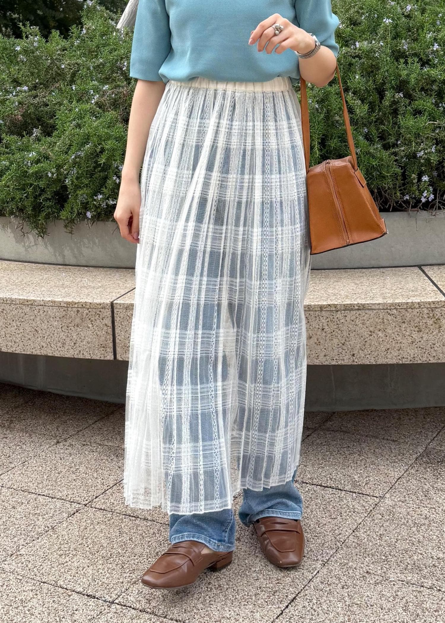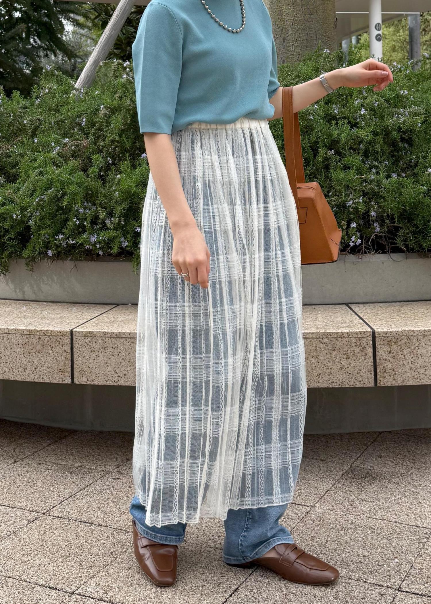 ブルーカラーのワントーンにホワイトのスカートが映えます◎